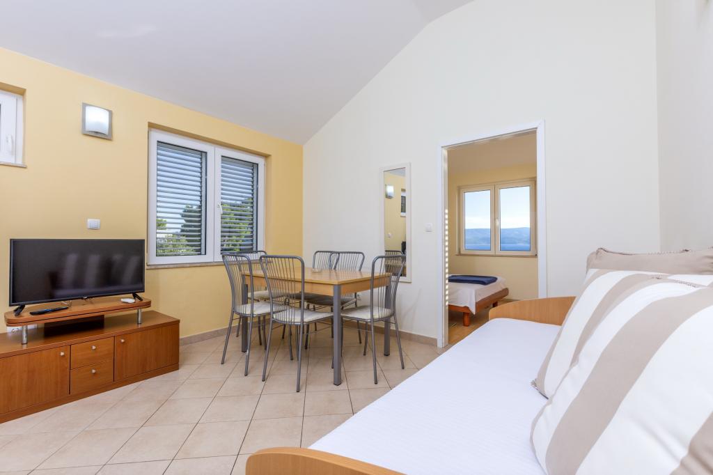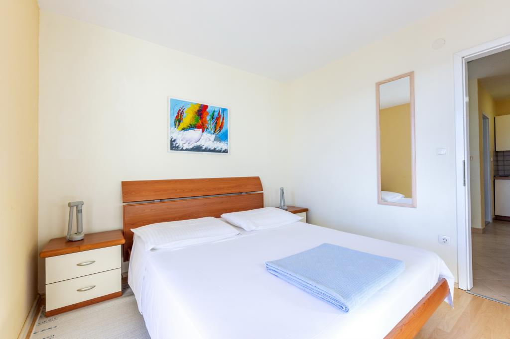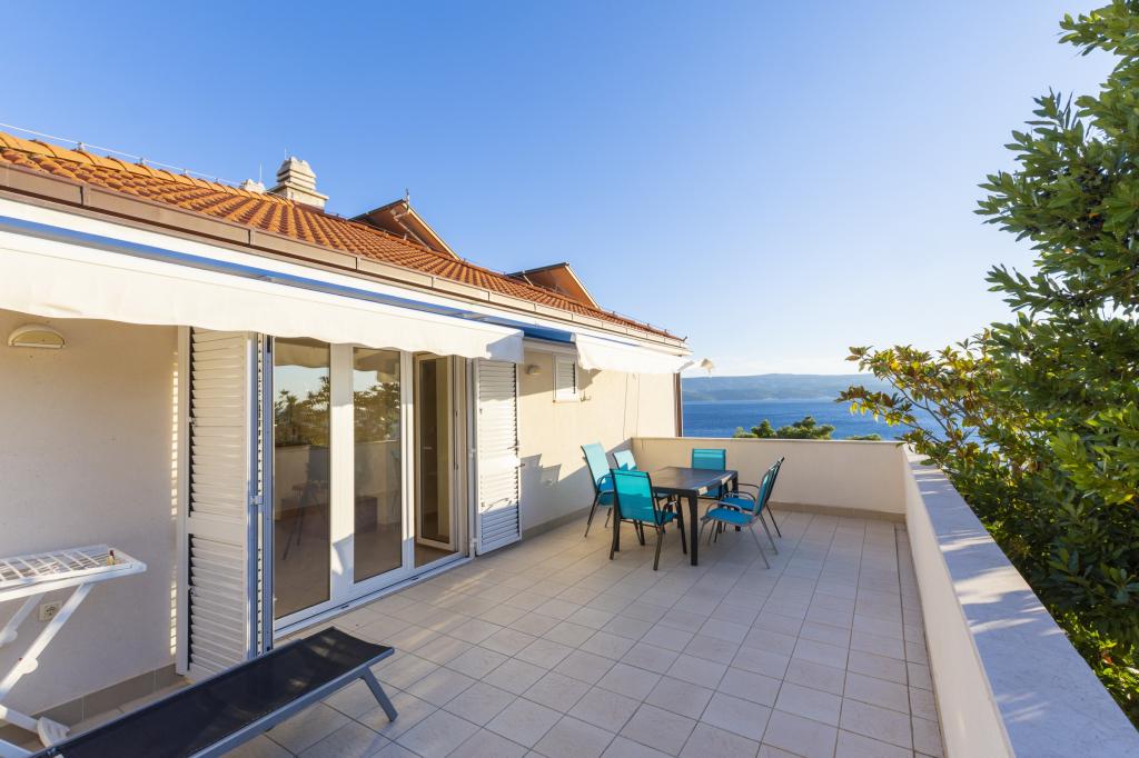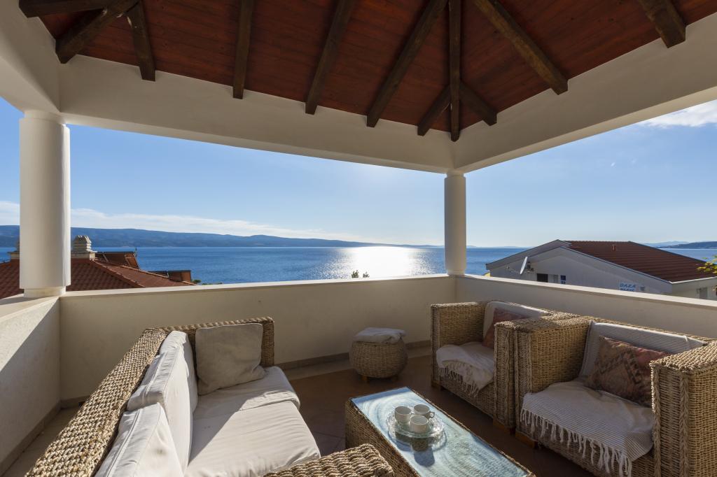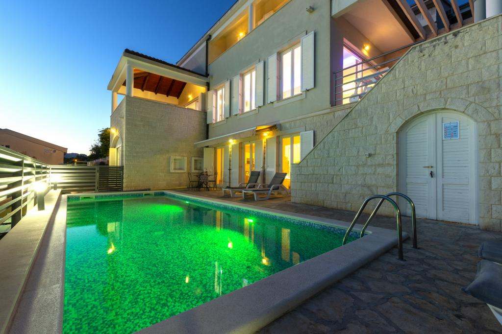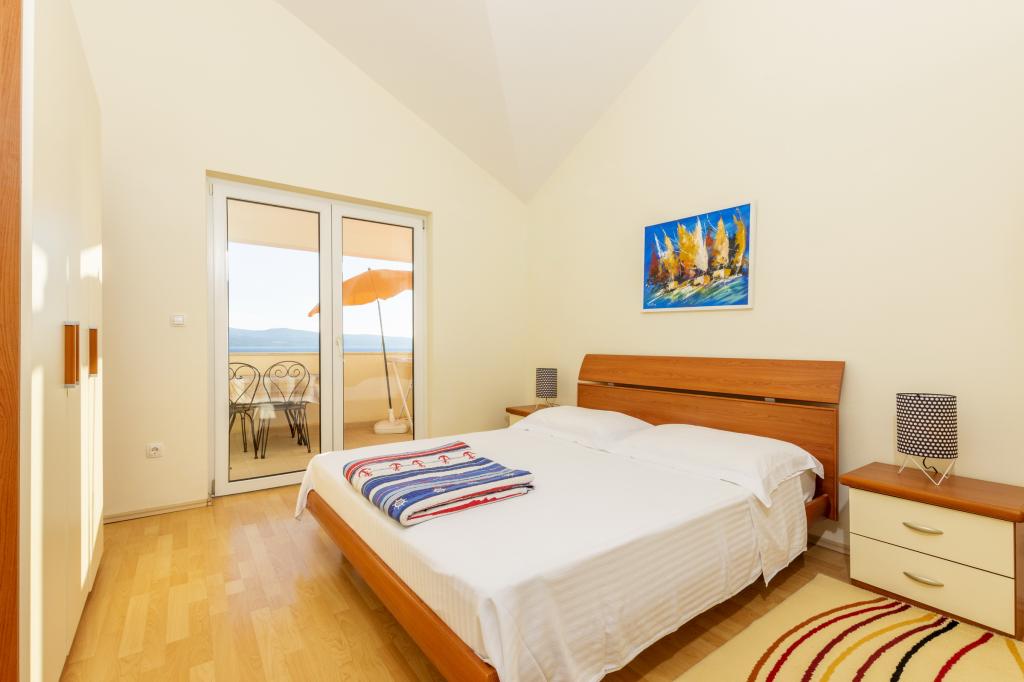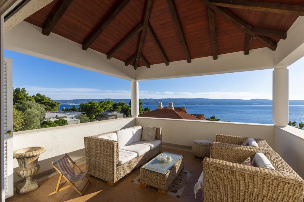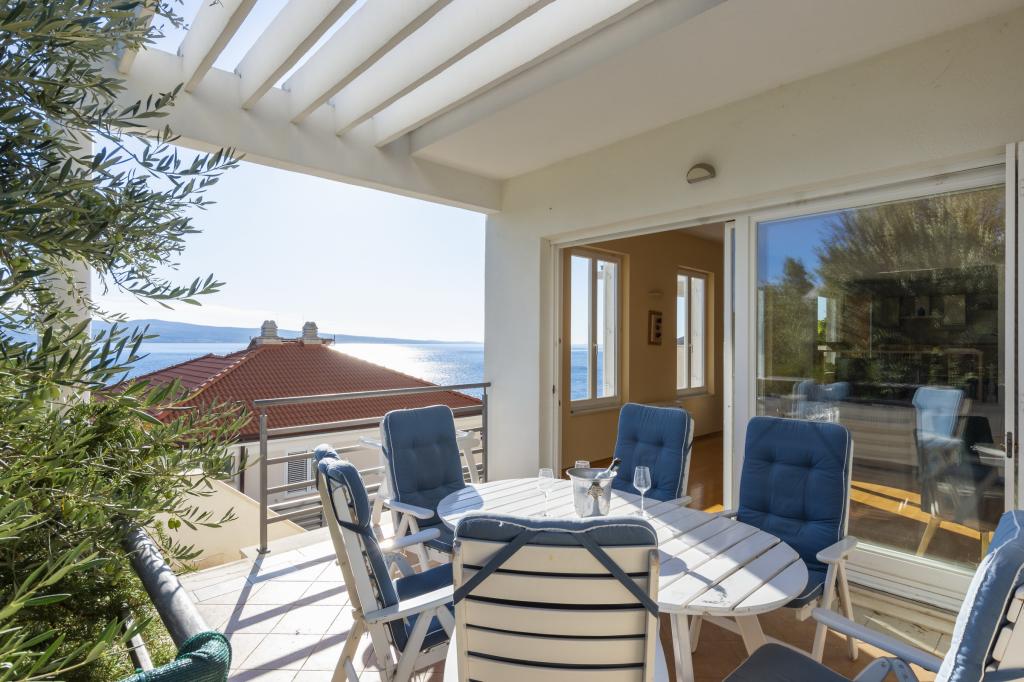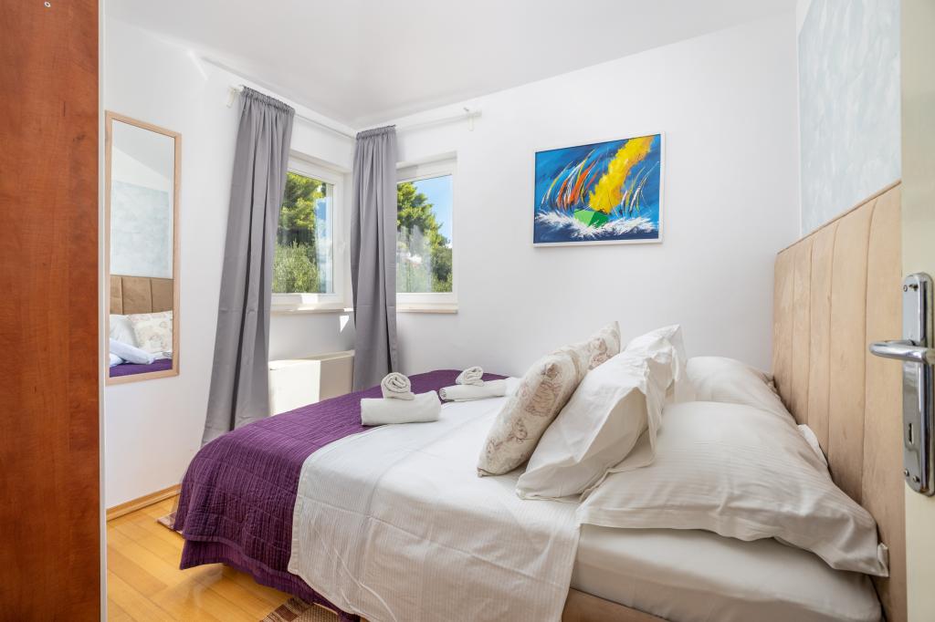 Unterkunft in neu gebauten, äußerst komfortablen und hervorragend ausgestatteten Apartments. Die Anlage liegt 3 km vom Zentrum von Omiš entfernt. Insgesamt acht Apartments in erster Reihe zum Meer. Alle Apartments verfügen über große Terrassen mit Blick auf das Meer und die Insel Brač. Parkplätze befinden sich direkt neben der Anlage. Die Apartments liegen unterhalb der Hauptstraße (300 Meter), direkt am Meer und einem großen Kiesstrand. Es gibt vier Apartmenttypen: Typ 2+2 mit einem separaten Schlafzimmer mit Doppelbett und einem Wohnzimmer mit zwei Betten, Typ 2+2 großes Studio, Typ 4+2 große Luxus-Apartments mit zwei Schlafzimmern mit Doppelbett und einem großen Wohnzimmer mit zwei Ausziehbetten sowie ein weiteres großes Deluxe-Apartment. Die Wohnung vom Typ 14+2 ist in Wirklichkeit eine dreistöckige Villa mit 300 m² Wohnfläche. Sie verfügt über einen 9 x 4 Meter großen, beheizten Swimmingpool, sieben Doppelzimmer, zwei große Wohnzimmer mit Balkonen und Terrassen, vier Badezimmer, ein separates WC, einen Außengrill, eine Sauna, einen Fitnessraum usw. Der Pool steht ausschließlich den Bewohnern der Wohnung A 14+2 zur Verfügung.