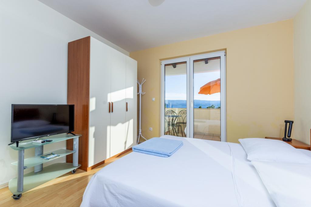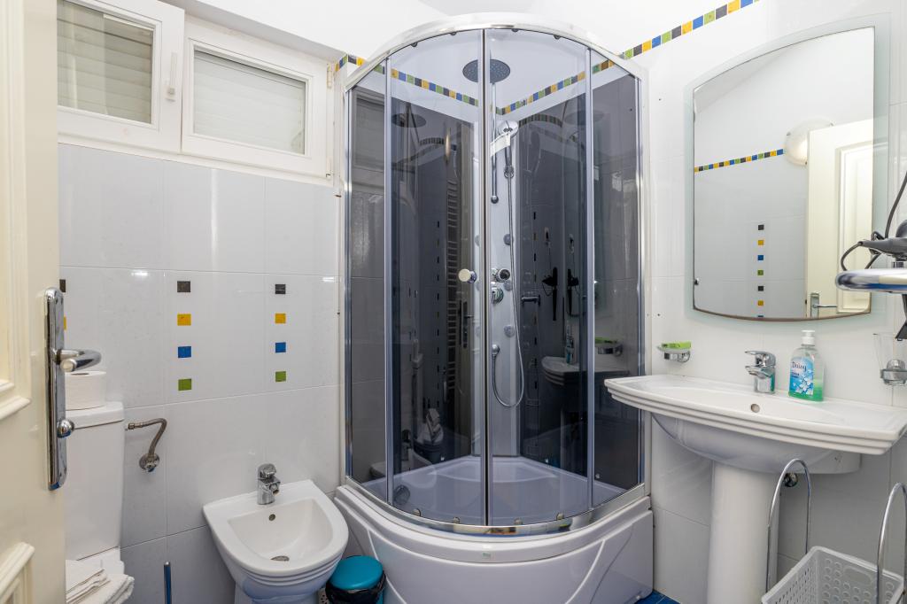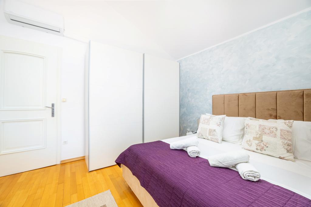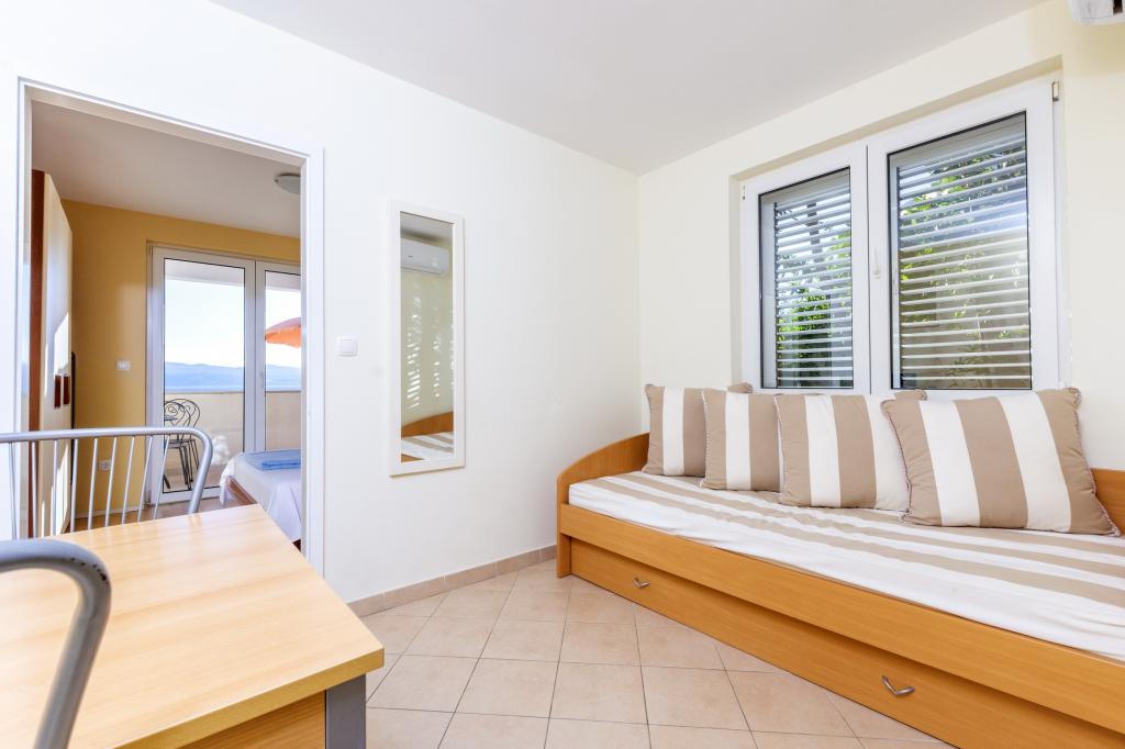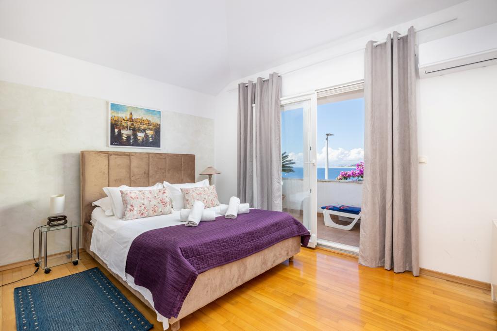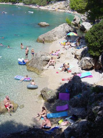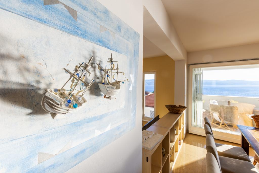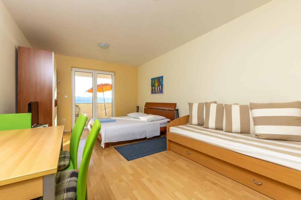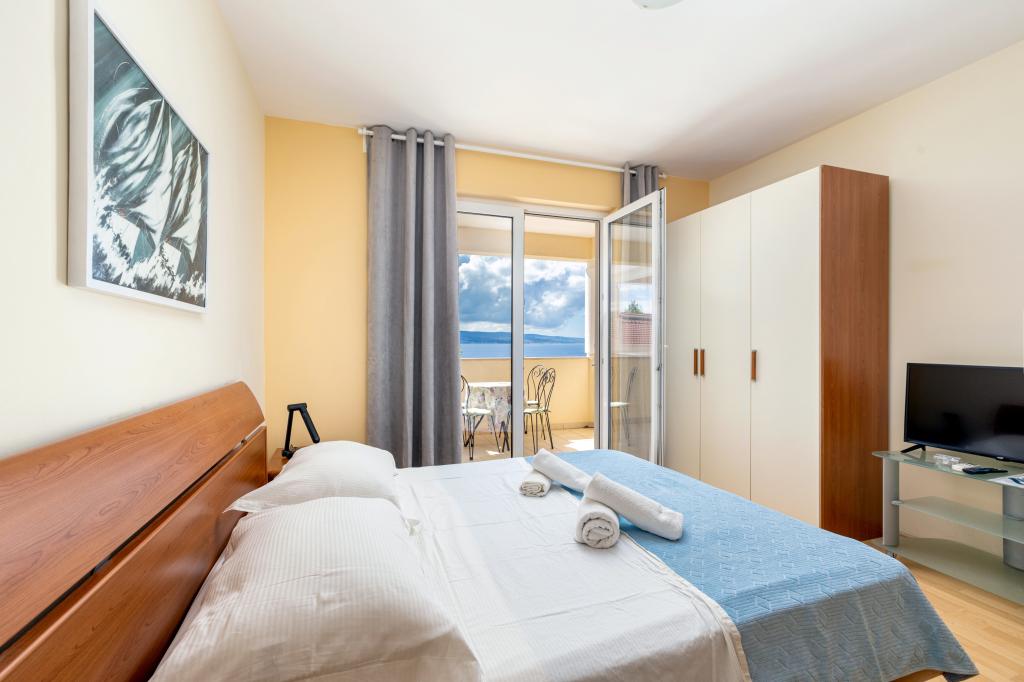 Unterkunft in neu gebauten, äußerst komfortablen und hervorragend ausgestatteten Apartments. Die Anlage liegt 3 km vom Zentrum von Omiš entfernt. Insgesamt acht Apartments in erster Reihe zum Meer. Alle Apartments verfügen über große Terrassen mit Blick auf das Meer und die Insel Brač. Parkplätze befinden sich direkt neben der Anlage. Die Apartments liegen unterhalb der Hauptstraße (300 Meter), direkt am Meer und einem großen Kiesstrand. Es gibt vier Apartmenttypen: Typ 2+2 mit einem separaten Schlafzimmer mit Doppelbett und einem Wohnzimmer mit zwei Betten, Typ 2+2 großes Studio, Typ 4+2 große Luxus-Apartments mit zwei Schlafzimmern mit Doppelbett und einem großen Wohnzimmer mit zwei Ausziehbetten sowie ein weiteres großes Deluxe-Apartment. Die Wohnung vom Typ 14+2 ist in Wirklichkeit eine dreistöckige Villa mit 300 m² Wohnfläche. Sie verfügt über einen 9 x 4 Meter großen, beheizten Swimmingpool, sieben Doppelzimmer, zwei große Wohnzimmer mit Balkonen und Terrassen, vier Badezimmer, ein separates WC, einen Außengrill, eine Sauna, einen Fitnessraum usw. Der Pool steht ausschließlich den Bewohnern der Wohnung A 14+2 zur Verfügung.