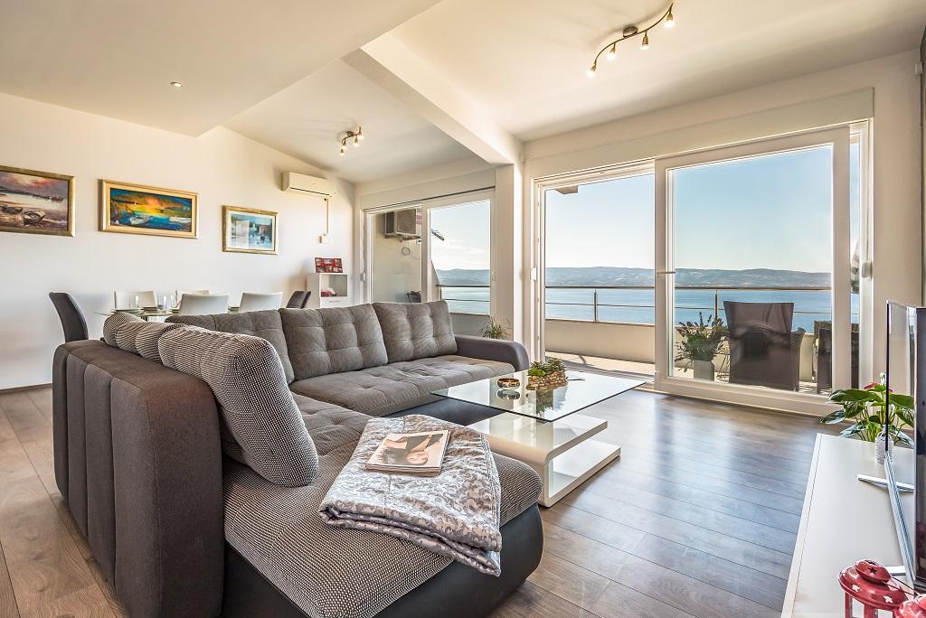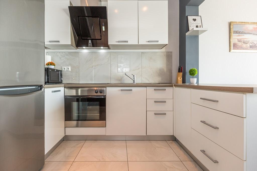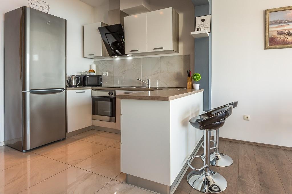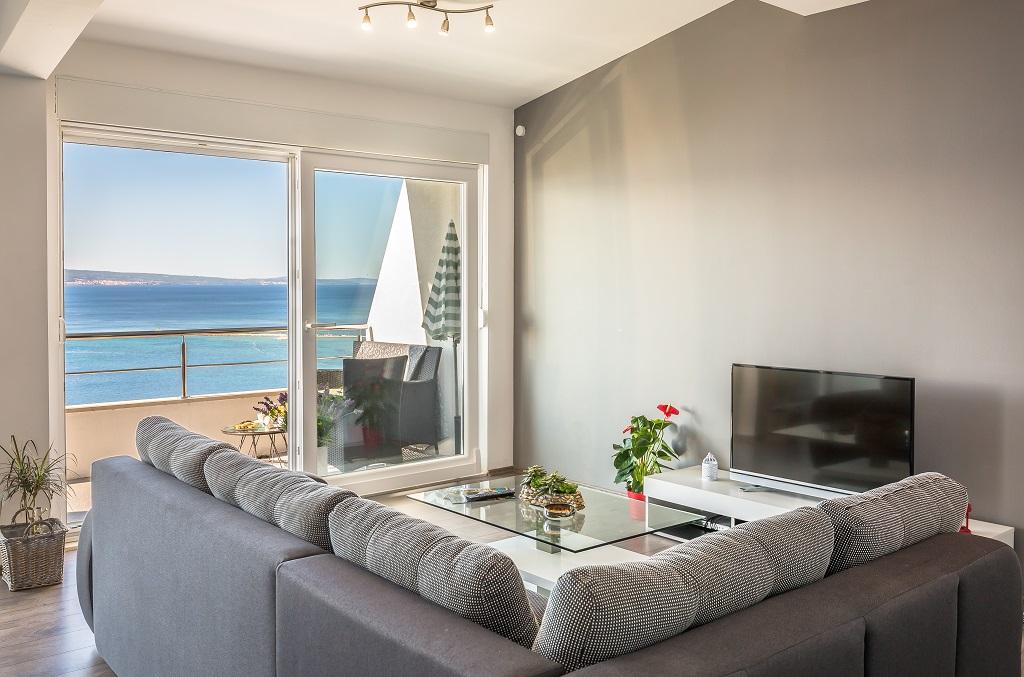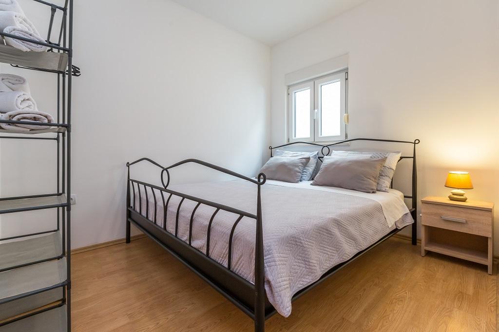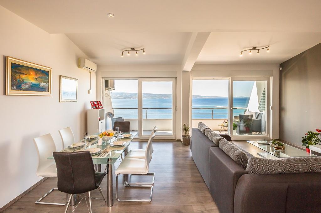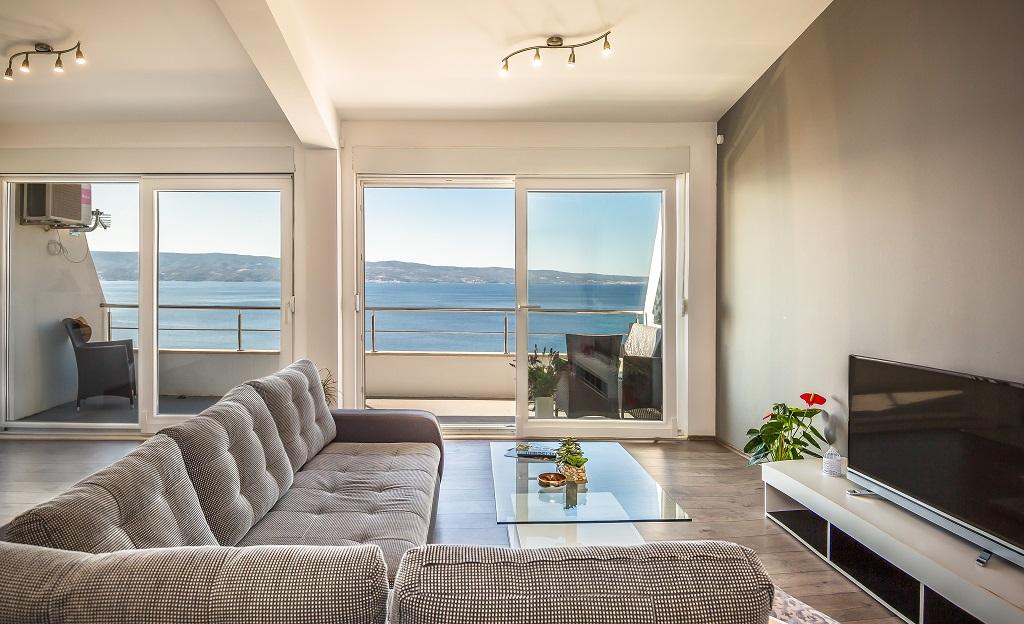 NEUE UND MODERNE WOHNUNG. Die Wohnung befindet sich in einem privaten Familienhaus mit Blick auf das Meer, die Inseln und die örtlichen Strände. In der Nähe des Zentrums von Omiš, nur 500 m entfernt. Alles ist ganz neu. Die Wohnung hat 95 m2. Es verfügt über 3 Schlafzimmer, ein Wohnzimmer, eine Küche mit Esszimmer, eine Toilette und ein zusätzliches Badezimmer, einen Balkon und einen Parkplatz in der Garage. Schlafzimmer: Ein Zimmer hat ein großes Bett (180 x 190) für 2 Personen. Das zweite Zimmer hat ein französisches Bett (160 x 190) für 2 Personen. Das dritte Zimmer hat ein Einzelbett (90 x 190) für 1 Person. Badezimmer mit Waschbecken und Dusche. WC mit Waschbecken und Waschmaschine. Die Küche ist komplett ausgestattet. Das Wohnzimmer ist geräumig. Großer Balkon mit Sitzgelegenheit.