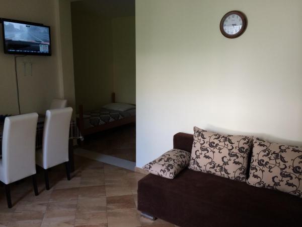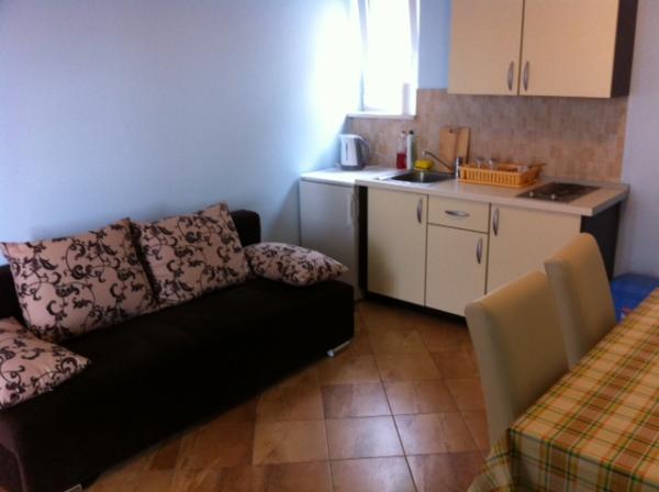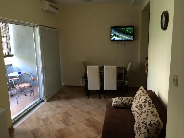 Die Apartments sind neu dekoriert und modern mit hochwertigen Fernsehern und Highspeed-Internet ausgestattet. In unmittelbarer Nähe (weniger als 50 Meter) gibt es einen Supermarkt, einen weißen Laden, einen Textilladen, eine Bäckerei, eine Café-Bar, ein Restaurant, ein Fußballfeld, einen Bus, eine Bushaltestelle. Die Anlage befindet sich 150 Meter vom Sandstrand entfernt. Die Hauptpromenade am Meer liegt 100 m von der Unterkunft entfernt.