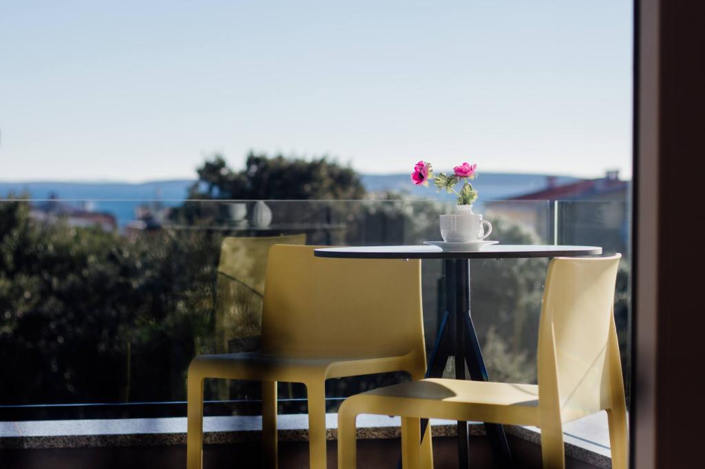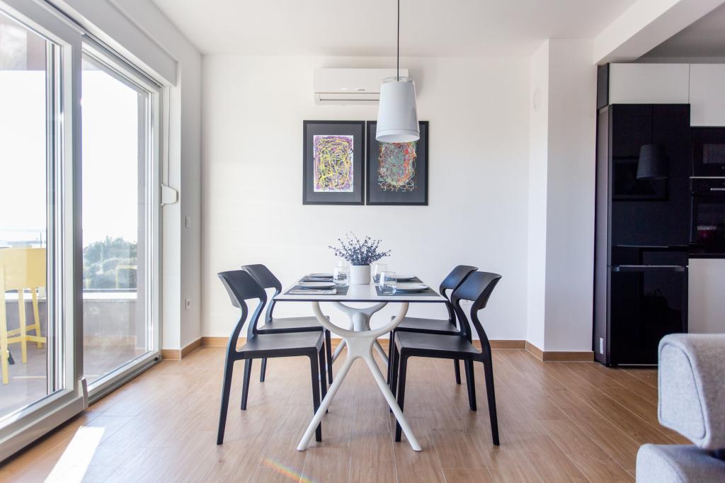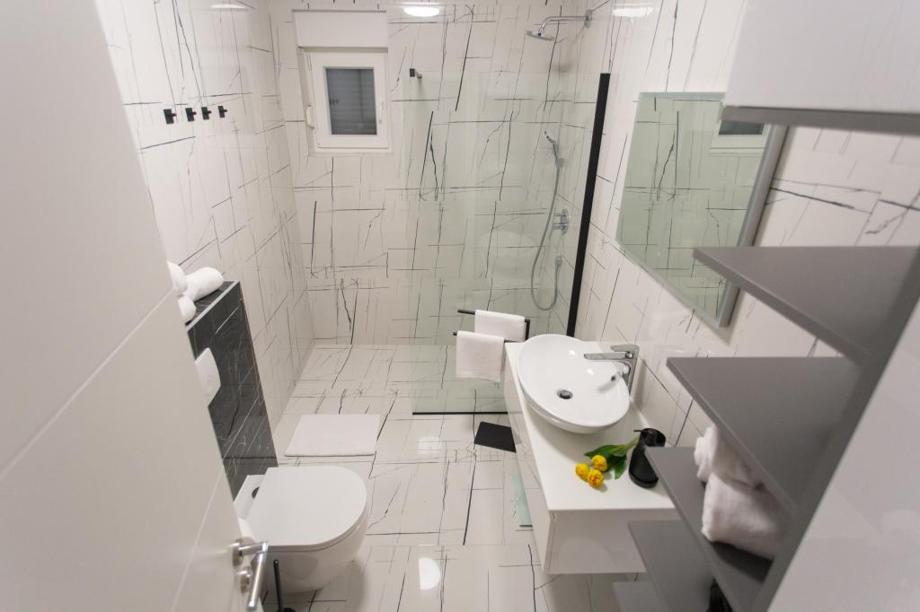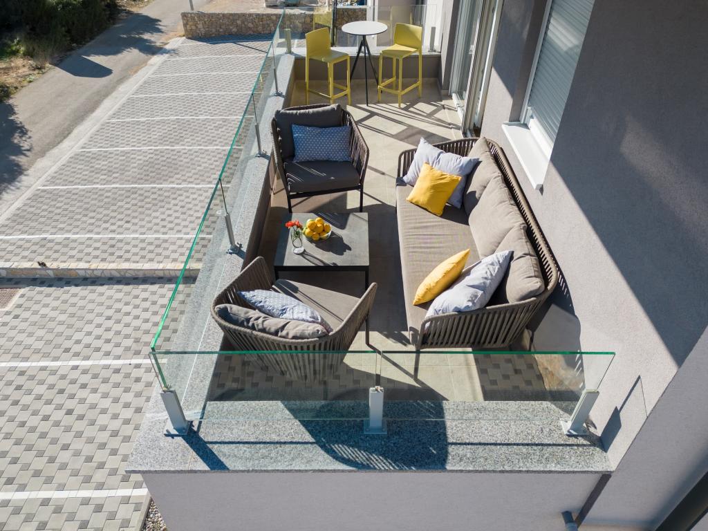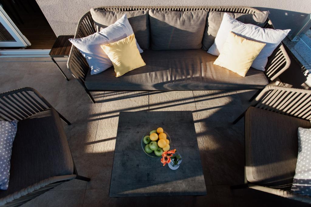 Die Wohnung ist komfortabel, gemütlich, mit einer sehr modernen Einrichtung, einem sehr hohen Maß an Gastgeberservice: hochwertige Möbel, Geräte und Geräte, bequeme Betten zum Schlafen mit sehr hochwertiger Bettwäsche und Kissen, dezente Beleuchtung..... Wir bereiteten unsere eigenen Mahlzeiten zu und genossen Frühstück, Mittag- und Abendessen im Apartment und auf dem Balkon. Ein wunderschöner Blick auf das Meer von dem sorgfältig eingerichteten großen Balkon. Das sehr bequeme Sofa zum Sitzen und Liegen auf dem Balkon lädt dazu ein, sich darauf hinzulegen und sich nicht zu bewegen... man atmet die klare Meeresluft ein und lauscht dem Zwitschern der Vögel im Hain direkt gegenüber der Wohnung... Der Grüngürtel entlang der gesamten Straße ist voller Olivenbäume, Lorbeer, Fichten, Zypressen und anderen mediterranen Pflanzen. Gepflegter Eingang, Marmortreppe... In derselben Straße (am Meer) gibt es eine Konditorei mit Terrasse und köstlichen Eissorten und Tassen, und etwas weiter unten an der Hauptstraße ein Bistro mit Terrasse direkt am Meeresufer mit ausgezeichnetem Kaffee und Cocktails. Direkt am Meer liegt eine einige Kilometer lange Promenade, die wir morgens und beim beeindruckenden Sonnenuntergang maximal ausnutzten. Die Badesaison hat gerade erst begonnen, wir waren zufrieden damit, einfach unsere Füße in die kleine Sandbucht zu tauchen. Das Meer ist wunderbar blau, sauber, klar. Der Strand erstreckt sich über den gesamten Teil der Promenade. Wenn es nicht möglich ist, sich in der Nähe des Grüns aufzuhalten, ist ein Sonnenschirm erforderlich. Wir haben uns die ganze Zeit in der Wohnung sehr, sehr wohl gefühlt...,,es strahlt deutlich „positive Energie“ aus. Wir empfehlen!!!!!