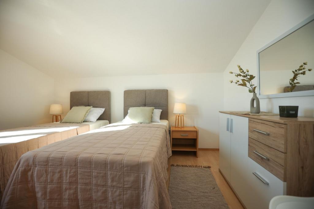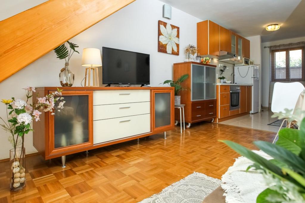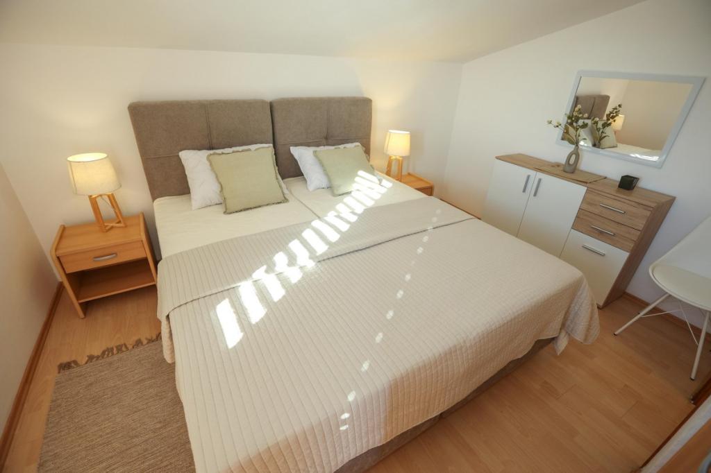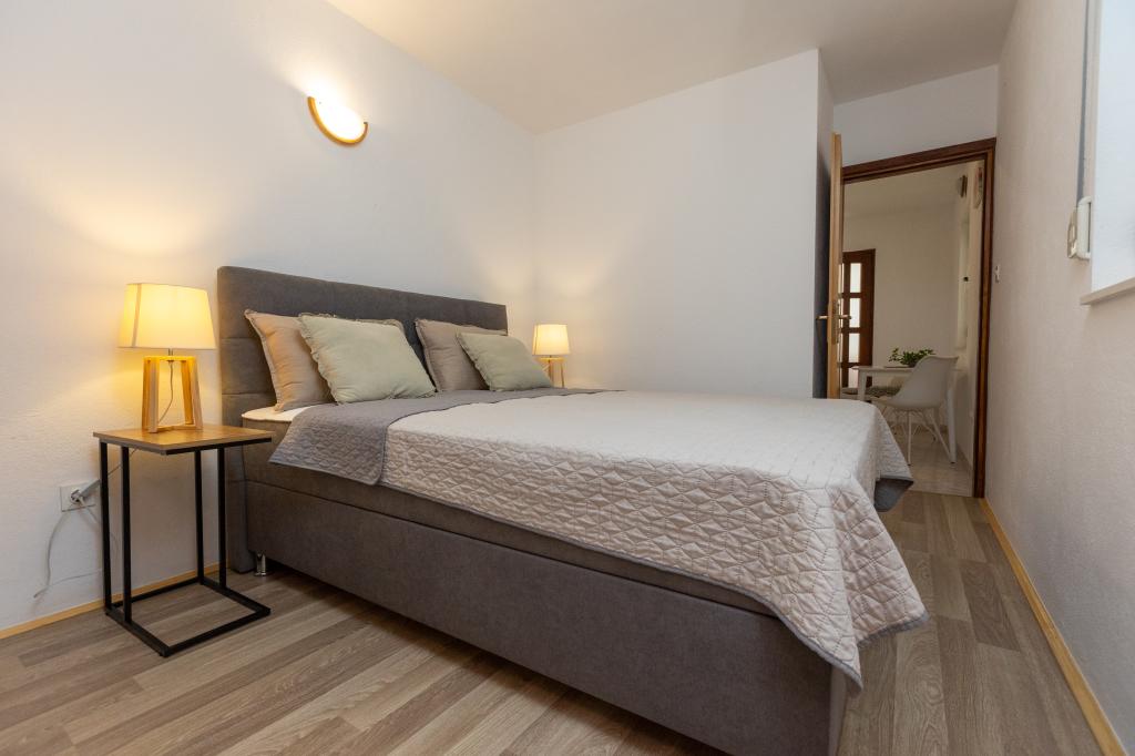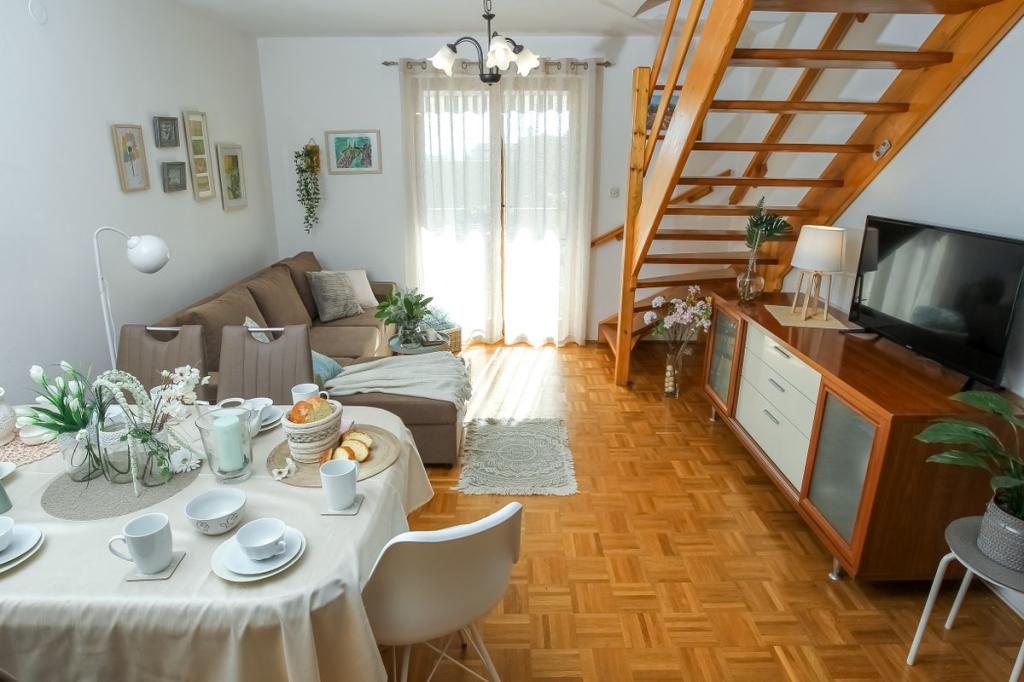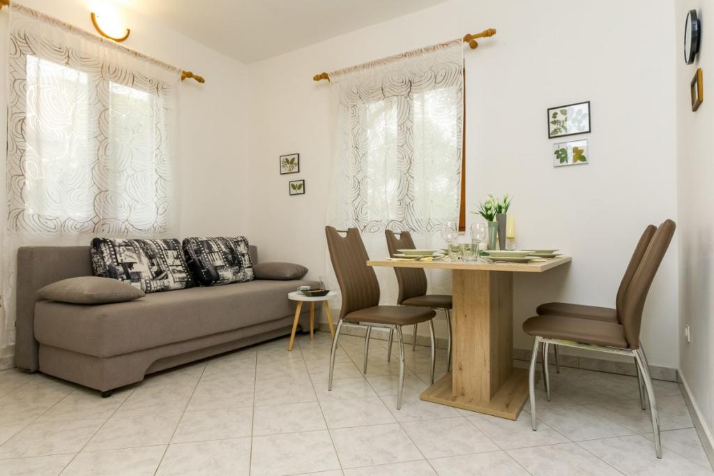 Unsere Unterkunft bietet eine angenehme, wohnliche Atmosphäre, in der sich Gäste wohlfühlen und herzlich willkommen sind. Sie befindet sich in bester Lage, nur 400 Meter vom Stadtzentrum entfernt, und alle Annehmlichkeiten des täglichen Bedarfs sind bequem zu erreichen – der nächste Laden ist nur 30 Meter entfernt. Das Haus besteht aus drei Wohneinheiten, jede mit eigenem Balkon, auf dem Sie Ihren Morgenkaffee oder entspannte Abende genießen können. Das größte Apartment verfügt zusätzlich über drei geräumige Terrassen, die noch mehr Platz zum Verweilen im Freien und für gemeinsame Momente bieten. Gästen steht außerdem ein gemeinsamer Außenbereich mit einem gläsernen Pavillon mit Küche, einem Kamin und einem großen Tisch zur Verfügung, der sich ideal für gesellige Runden und Mahlzeiten im Freien eignet. Dieser warme und gemütliche Bereich liegt inmitten von Grün und bietet eine ruhige Umgebung zum Entspannen, für Gespräche und um schöne Erinnerungen zu schaffen. Die Unterkunft eignet sich für verschiedene Gästetypen und ist besonders angenehm für Familien mit Kindern, die hier unbeschwert in einer sicheren und geräumigen Umgebung spielen können. Jedes Apartment verfügt zudem über einen eigenen Parkplatz im Freien, um Ihren Aufenthalt so einfach und unkompliziert wie möglich zu gestalten. Als Gastgeber stehen wir Ihnen jederzeit mit Rat und Tat zur Seite und helfen Ihnen gerne bei der Organisation Ihres Aufenthalts – wir möchten, dass Sie sich wie zu Hause fühlen und nur schöne Erinnerungen aus Pakoštane mitnehmen.