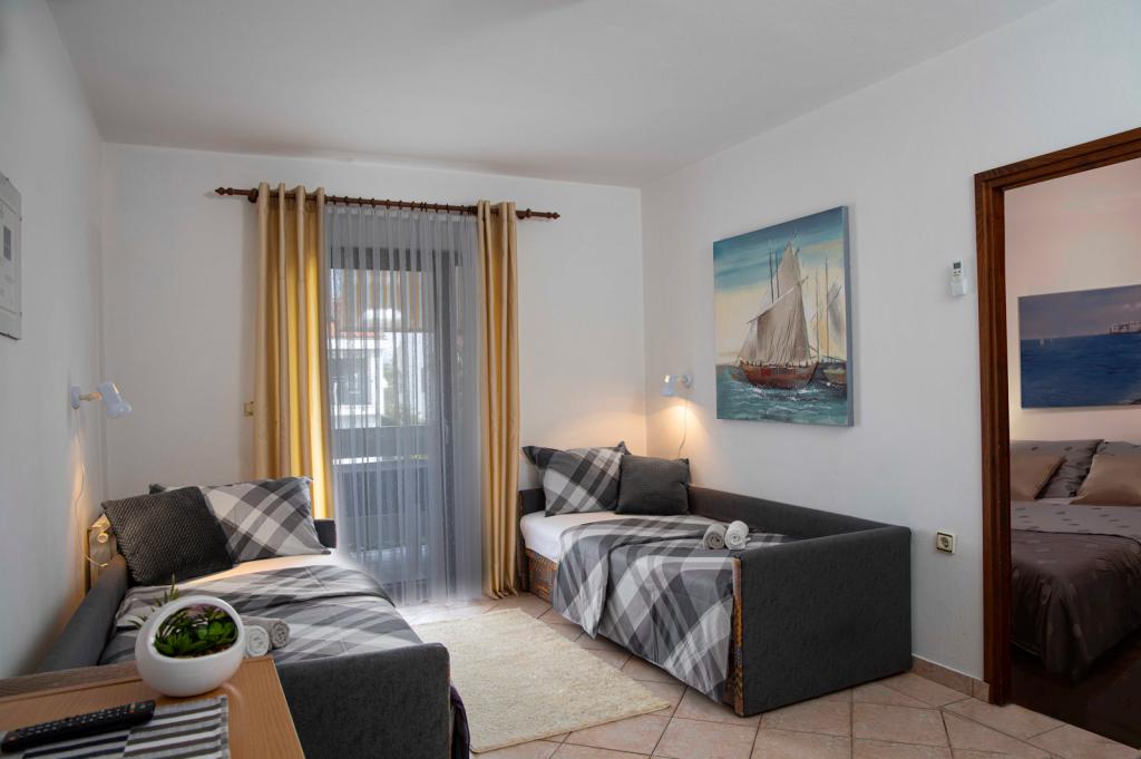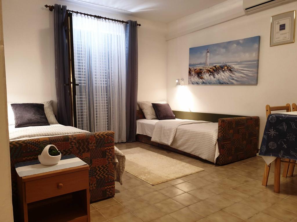 Die Apartments sind ordentlich und sauber und mit allem ausgestattet, was Sie für einen kurzen oder längeren Aufenthalt benötigen. Der Besitzer ist freundlich, zugänglich und hilfsbereit. Die Strände sind buchstäblich zum Greifen nah, eine Minute zu Fuß entfernt (mit einem kleinen Kind), egal in welche Richtung Sie gehen. Eine Kühlbox findet man fast immer und für Kinder gibt es auch einen feinen Sandstrand mit flachem Meer, an dem es zu jeder Tageszeit Plätze gibt. Der Ort verfügt über genügend Cafés, Restaurants, Pizzerien, Souvenirläden ... Ein Auto ist im wahrsten Sinne des Wortes unnötig (und Sie können es auf dem reservierten Parkplatz im Schatten neben der Wohnung abstellen), da alles in wenigen Minuten zu Fuß erreichbar ist. Irgendeine Empfehlung für eine Wohnung.