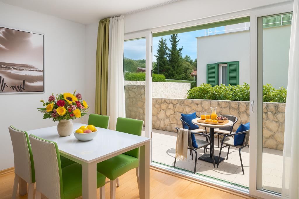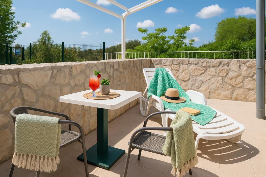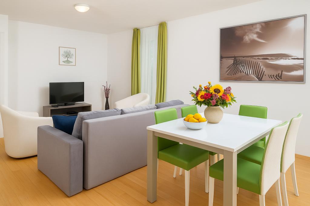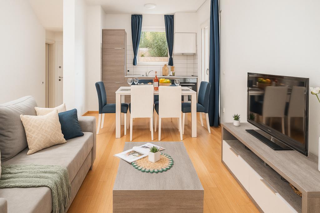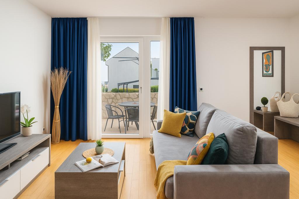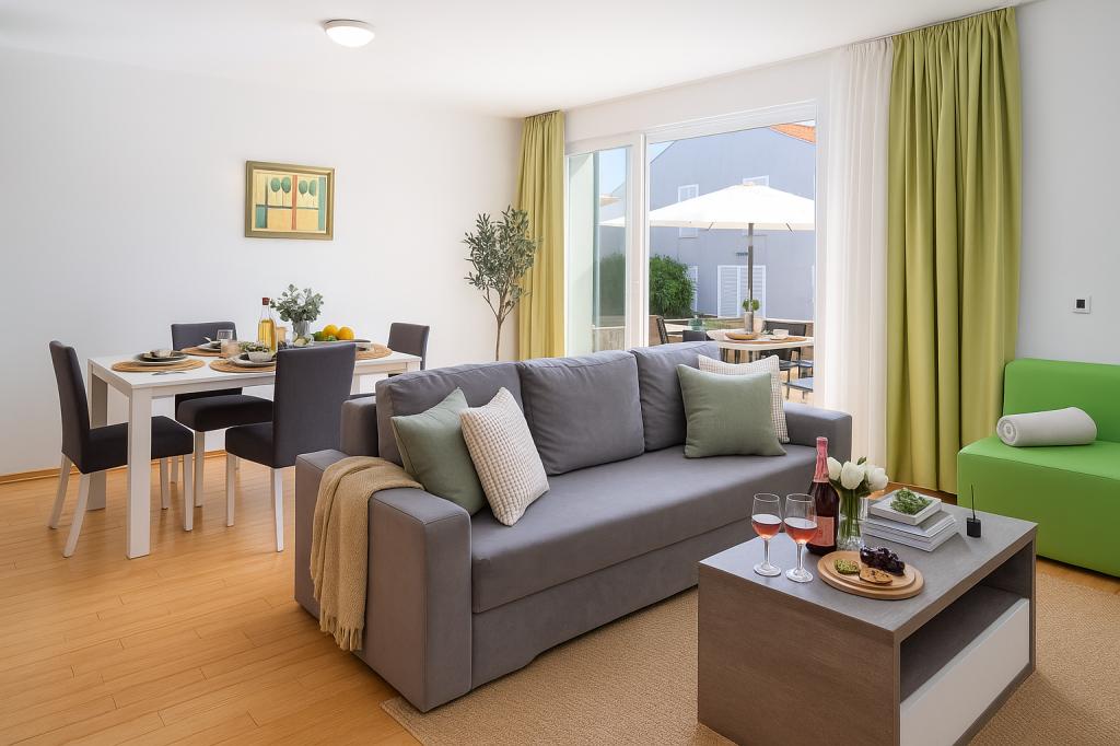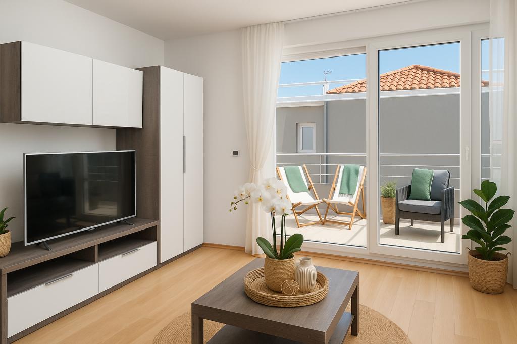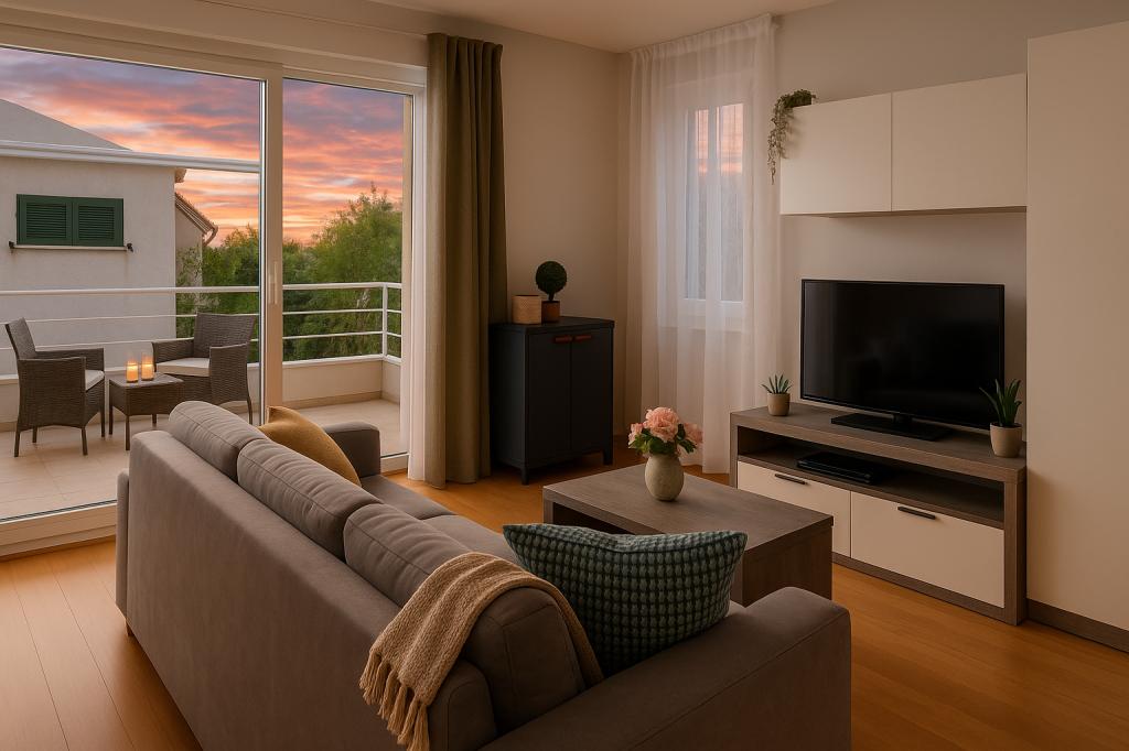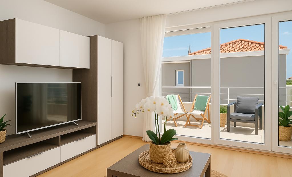 Sunny Resort Apartment mit Meerblick 1314 in Petrčane bietet die perfekte Kombination aus Komfort und erstklassiger Lage für einen erholsamen Urlaub. Gelegen im Sunny Resort-Komplex, in unmittelbarer Nähe der Hotels Falkensteiner Diadora und Iadera, befindet sich dieses 49 m² große Ein-Zimmer-Apartment im zweiten Stock mit privatem Eingang und bietet Meerblick. Apartmentbeschreibung - Kapazität: Bis zu 4 Personen (1 Schlafzimmer mit Doppelbett + Schlafsofa im Wohnzimmer) - Größe: 49 m² - Lage: Zweiter Stock, dritte Reihe vom Meer, privater Eingang - Aussicht: Balkon und Terrasse mit Meerblick - Ausstattung: Klimaanlage, voll ausgestattete Küche, WLAN, Flachbildfernseher, Netflix