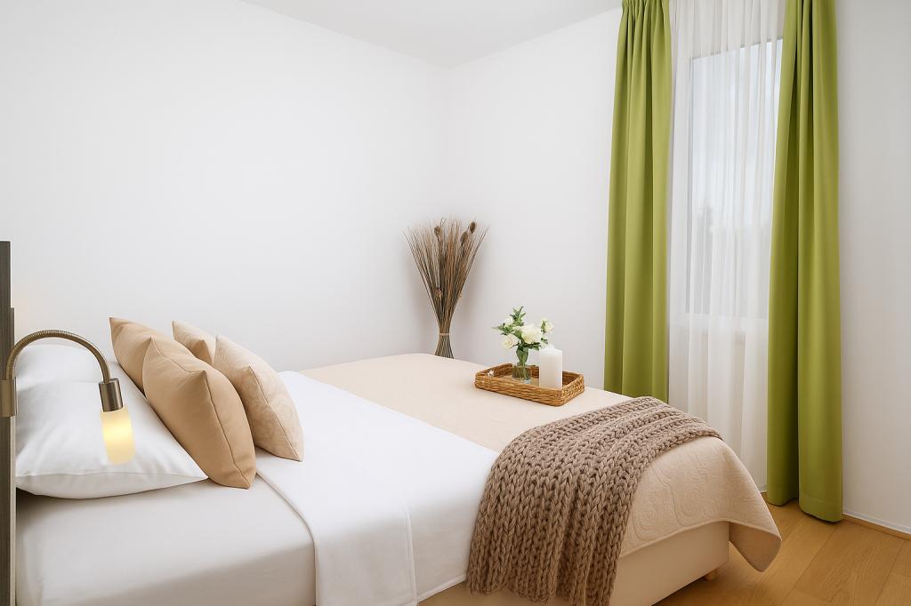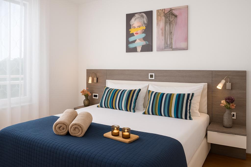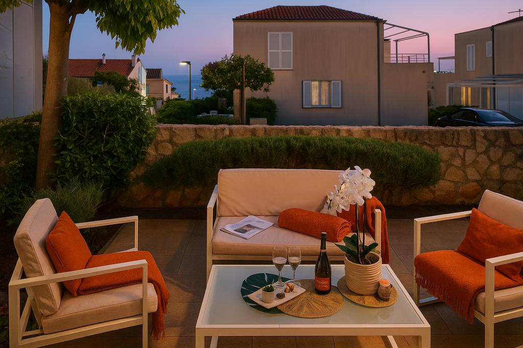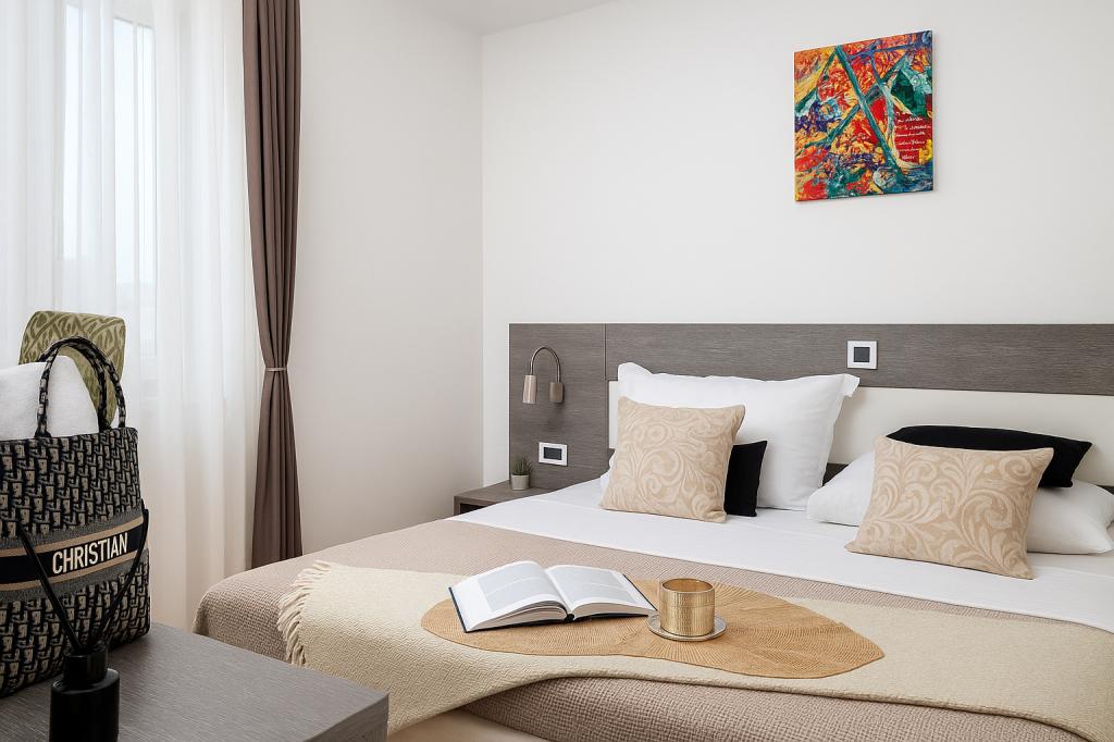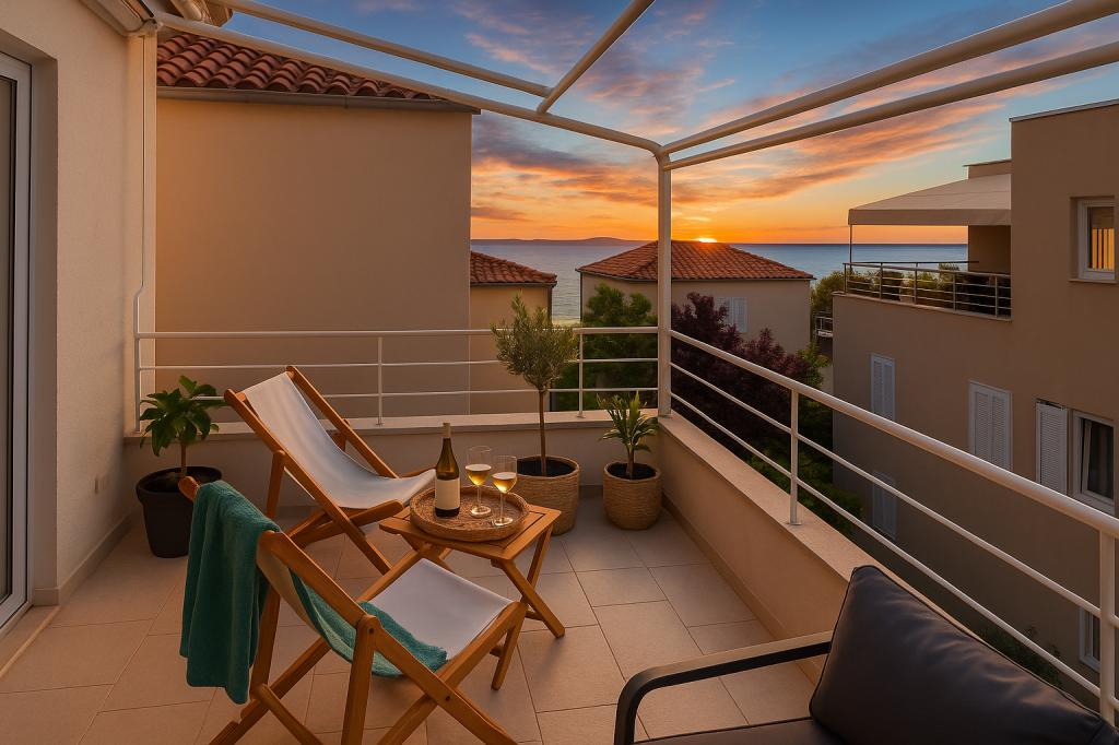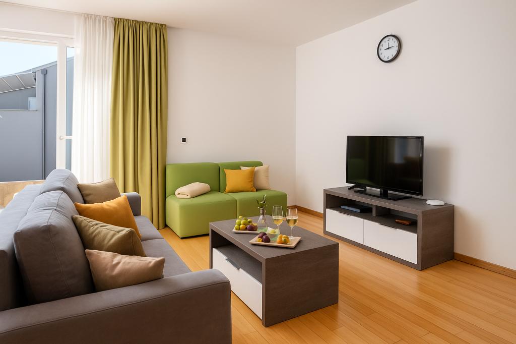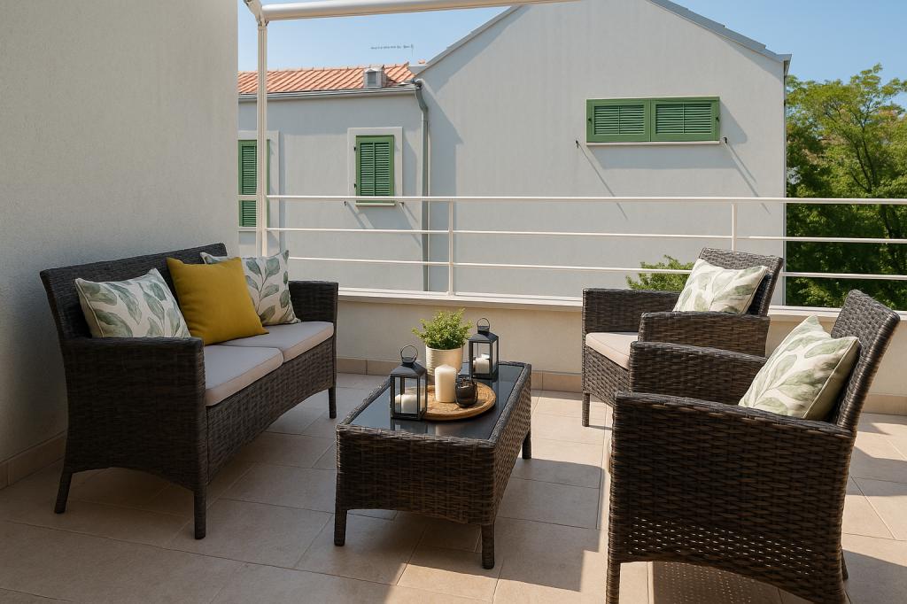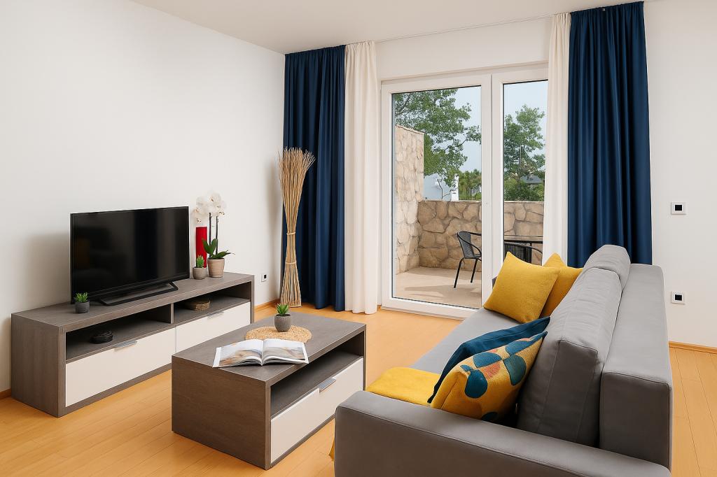 Sunny Resort Apartment mit Meerblick 1314 in Petrčane bietet die perfekte Kombination aus Komfort und erstklassiger Lage für einen erholsamen Urlaub. Gelegen im Sunny Resort-Komplex, in unmittelbarer Nähe der Hotels Falkensteiner Diadora und Iadera, befindet sich dieses 49 m² große Ein-Zimmer-Apartment im zweiten Stock mit privatem Eingang und bietet Meerblick. Apartmentbeschreibung - Kapazität: Bis zu 4 Personen (1 Schlafzimmer mit Doppelbett + Schlafsofa im Wohnzimmer) - Größe: 49 m² - Lage: Zweiter Stock, dritte Reihe vom Meer, privater Eingang - Aussicht: Balkon und Terrasse mit Meerblick - Ausstattung: Klimaanlage, voll ausgestattete Küche, WLAN, Flachbildfernseher, Netflix