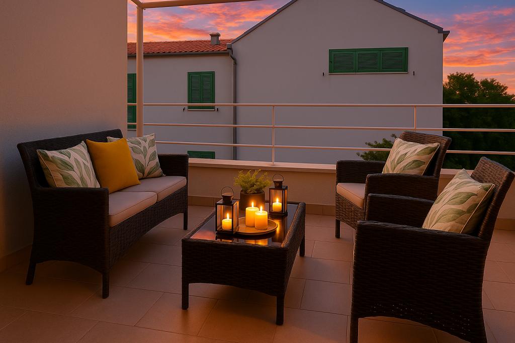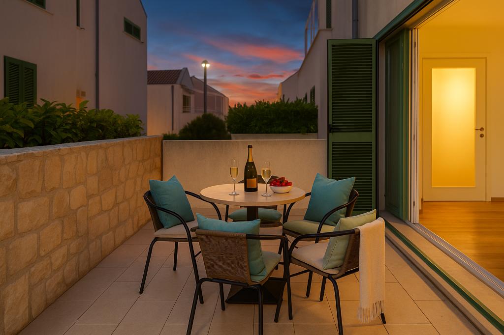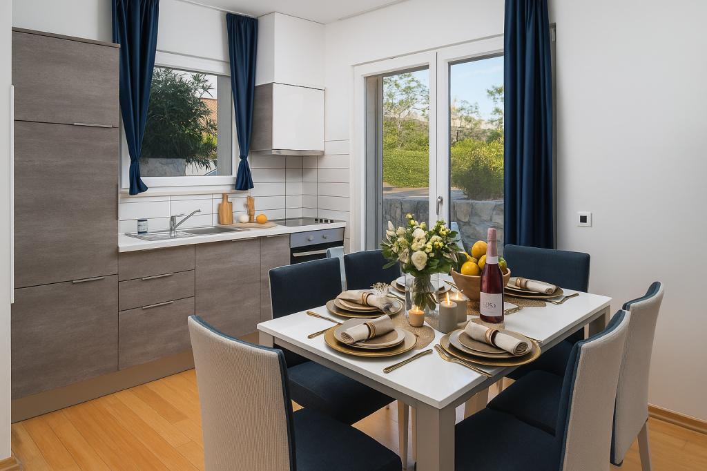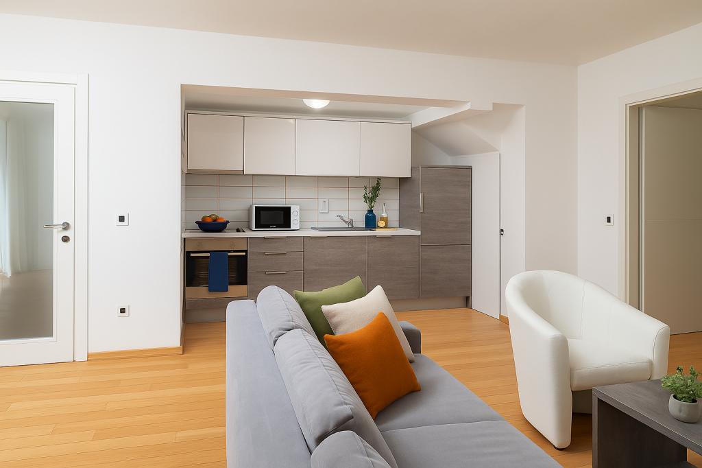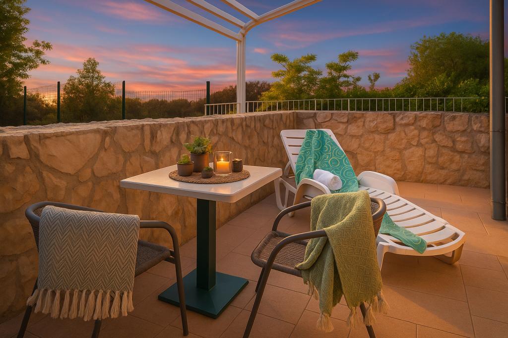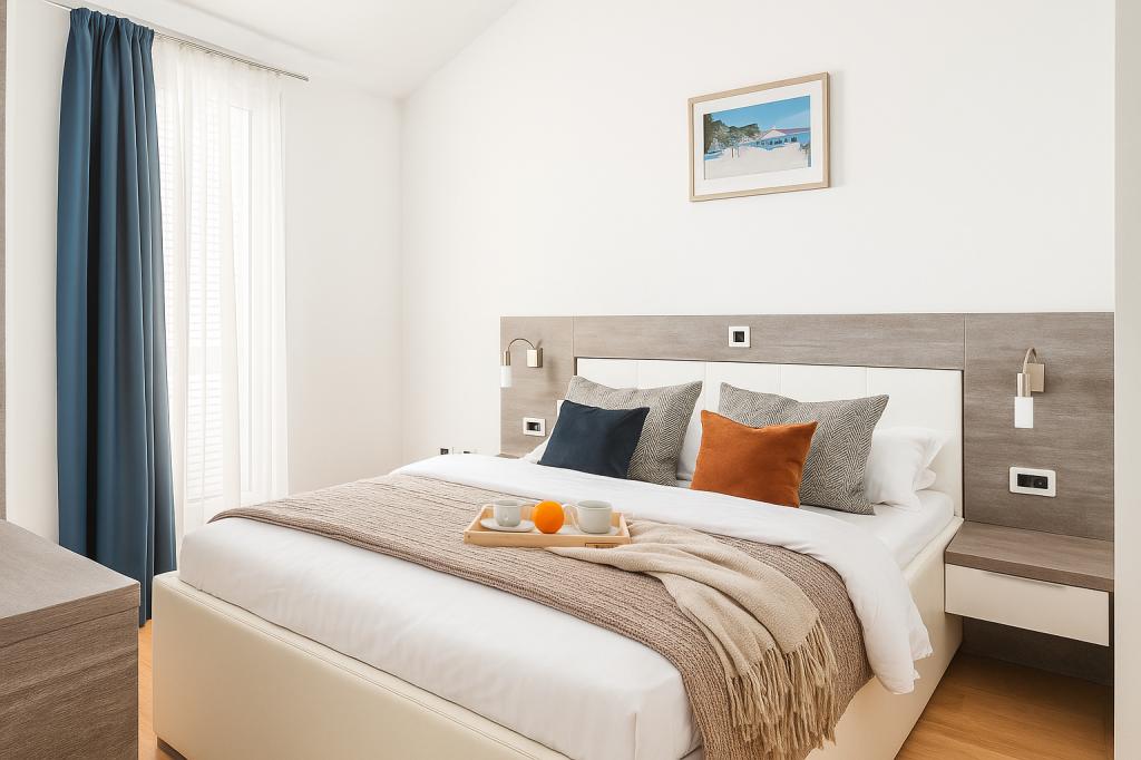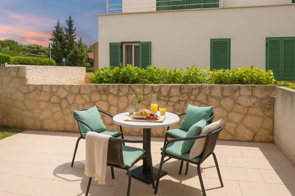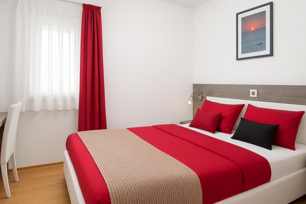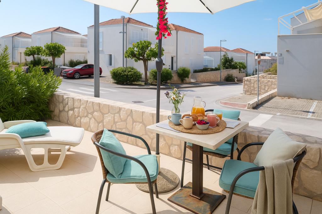 Sunny Resort Apartment mit Meerblick 1314 in Petrčane bietet die perfekte Kombination aus Komfort und erstklassiger Lage für einen erholsamen Urlaub. Gelegen im Sunny Resort-Komplex, in unmittelbarer Nähe der Hotels Falkensteiner Diadora und Iadera, befindet sich dieses 49 m² große Ein-Zimmer-Apartment im zweiten Stock mit privatem Eingang und bietet Meerblick. Apartmentbeschreibung - Kapazität: Bis zu 4 Personen (1 Schlafzimmer mit Doppelbett + Schlafsofa im Wohnzimmer) - Größe: 49 m² - Lage: Zweiter Stock, dritte Reihe vom Meer, privater Eingang - Aussicht: Balkon und Terrasse mit Meerblick - Ausstattung: Klimaanlage, voll ausgestattete Küche, WLAN, Flachbildfernseher, Netflix