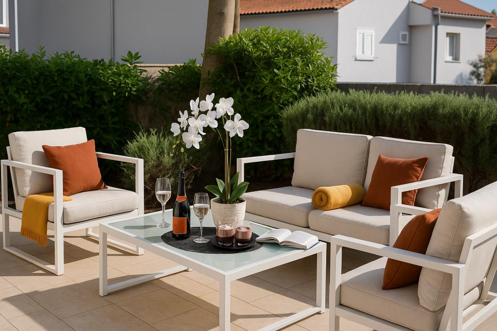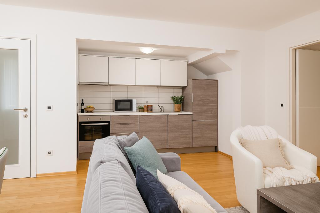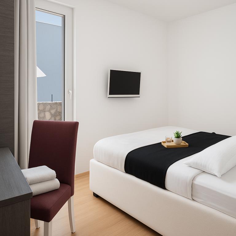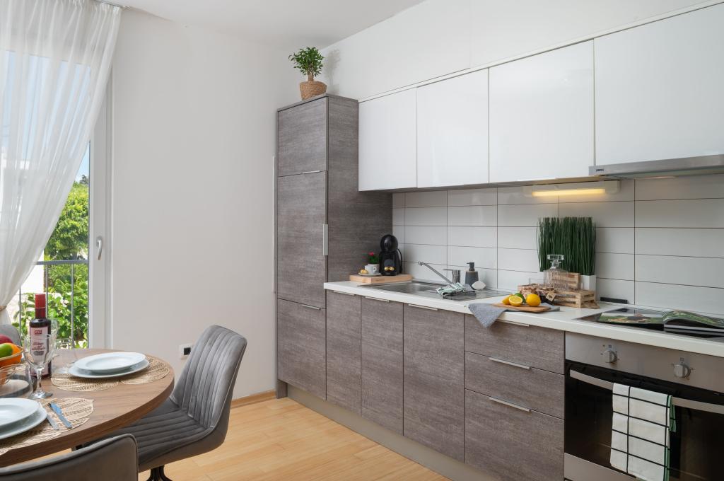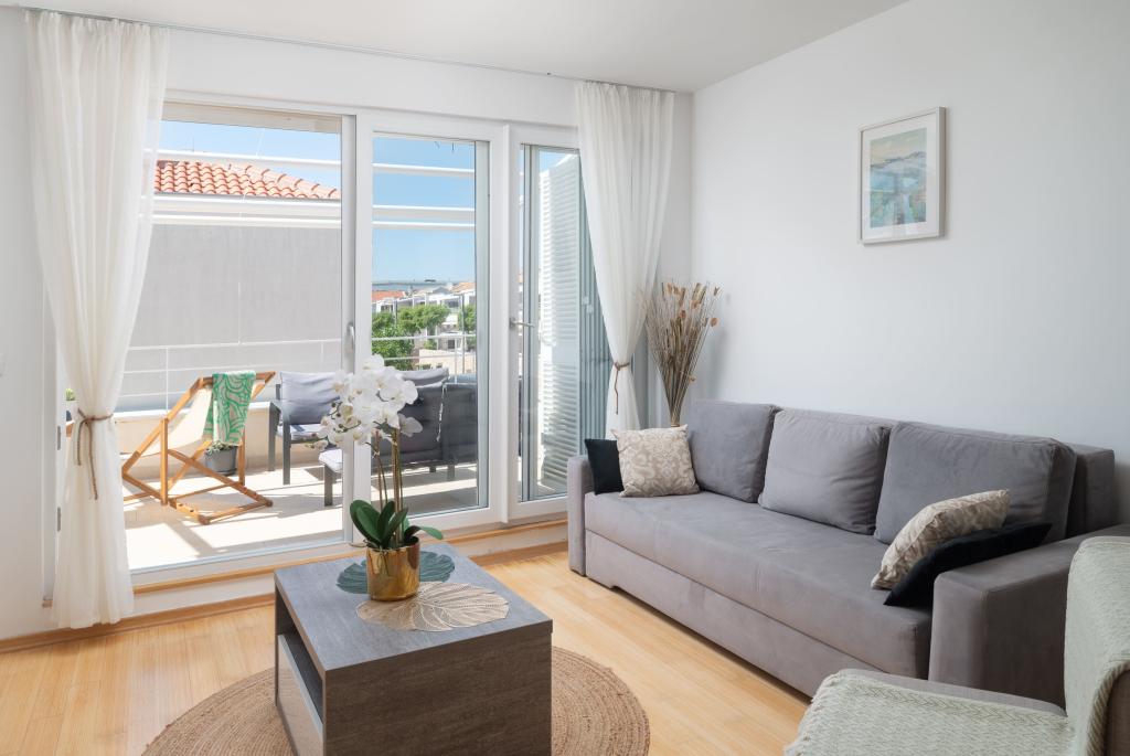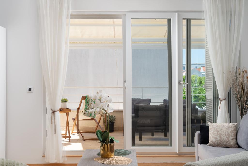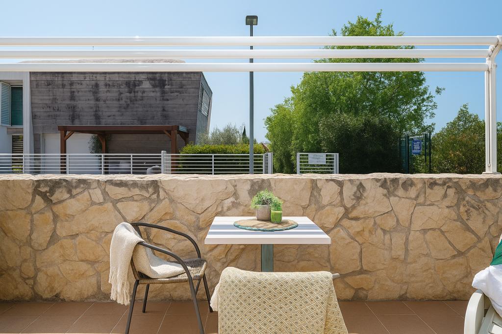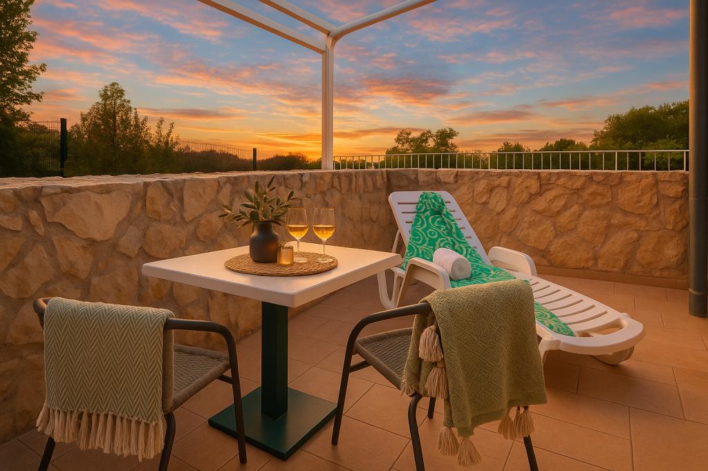Sunny Resort Apartment mit Meerblick 1314 in Petrčane bietet die perfekte Kombination aus Komfort und erstklassiger Lage für einen erholsamen Urlaub. Gelegen im Sunny Resort-Komplex, in unmittelbarer Nähe der Hotels Falkensteiner Diadora und Iadera, befindet sich dieses 49 m² große Ein-Zimmer-Apartment im zweiten Stock mit privatem Eingang und bietet Meerblick. Apartmentbeschreibung - Kapazität: Bis zu 4 Personen (1 Schlafzimmer mit Doppelbett + Schlafsofa im Wohnzimmer) - Größe: 49 m² - Lage: Zweiter Stock, dritte Reihe vom Meer, privater Eingang - Aussicht: Balkon und Terrasse mit Meerblick - Ausstattung: Klimaanlage, voll ausgestattete Küche, WLAN, Flachbildfernseher, Netflix