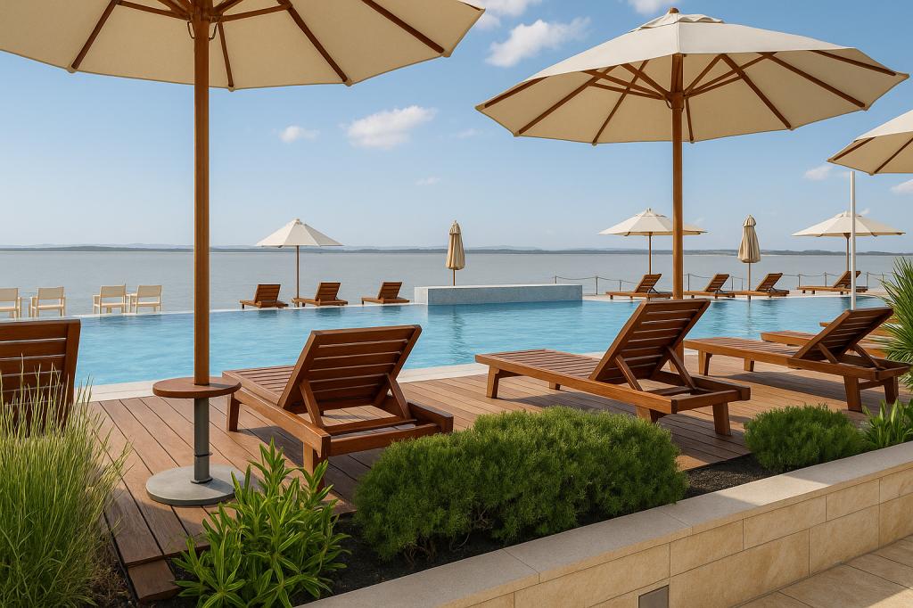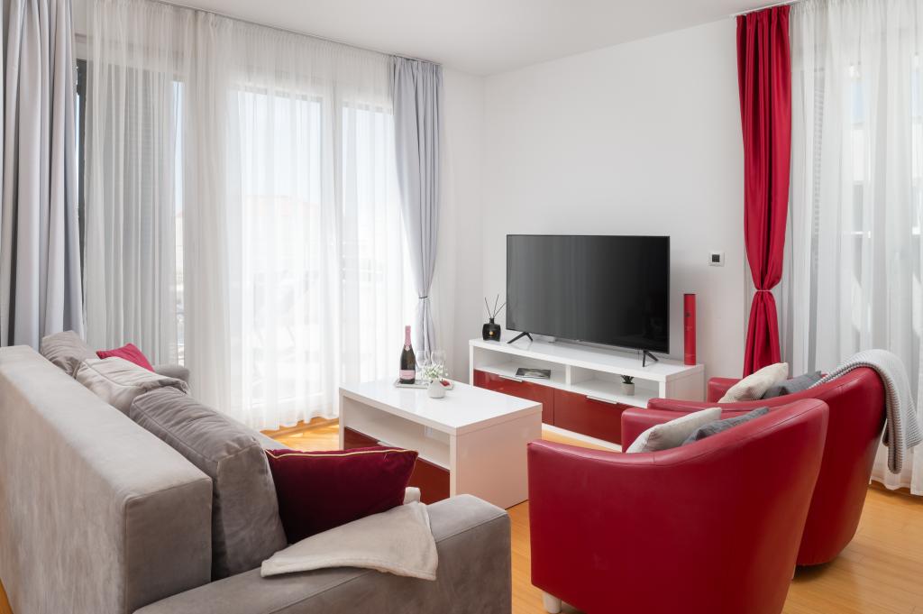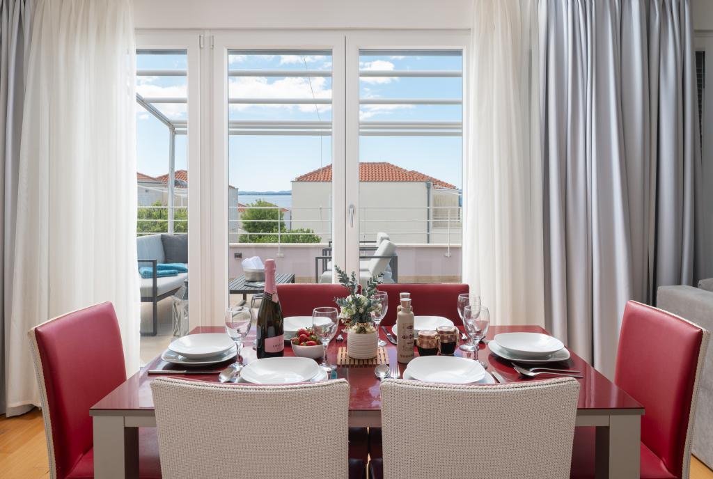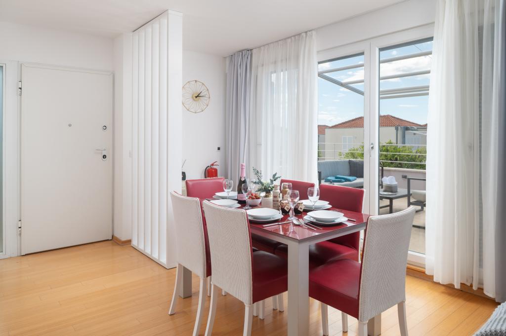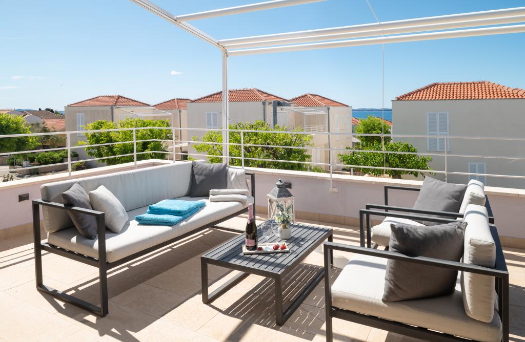 Ausstattung des Komplexes Privater Strand: Liegestühle und Sonnenschirme inklusive Schwimmbad: Infinity-Pool mit Meerblick und Kinderbecken Wellness: Sauna und Fitnesscenter für Gäste verfügbar Restaurant: Zanzibar befindet sich unterhalb der Wohnung Sicherheit: Kostenlose Parkplätze vor dem Gebäude, Schranke und Videoüberwachung Zusätzliche Dienstleistungen: - Sonnenschirmverleih verfügbar - Jet-Ski-Verleih verfügbar - KAYAK Lage Entfernung zum Strand: 3 Minuten zu Fuß Entfernung zum Zentrum von Petrčane: 10 Minuten zu Fuß Nahegelegene Attraktionen: Hotels Falkensteiner Diadora und Iadera, verschiedene Restaurants und Cafés