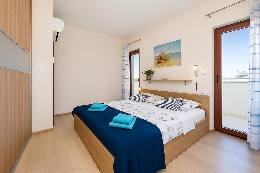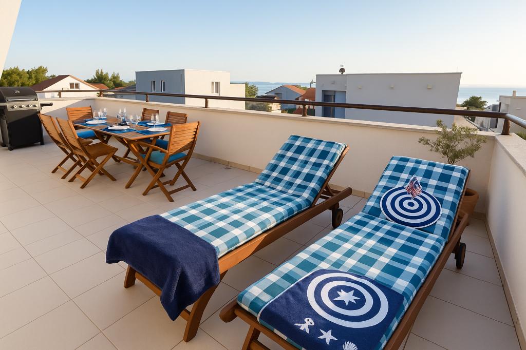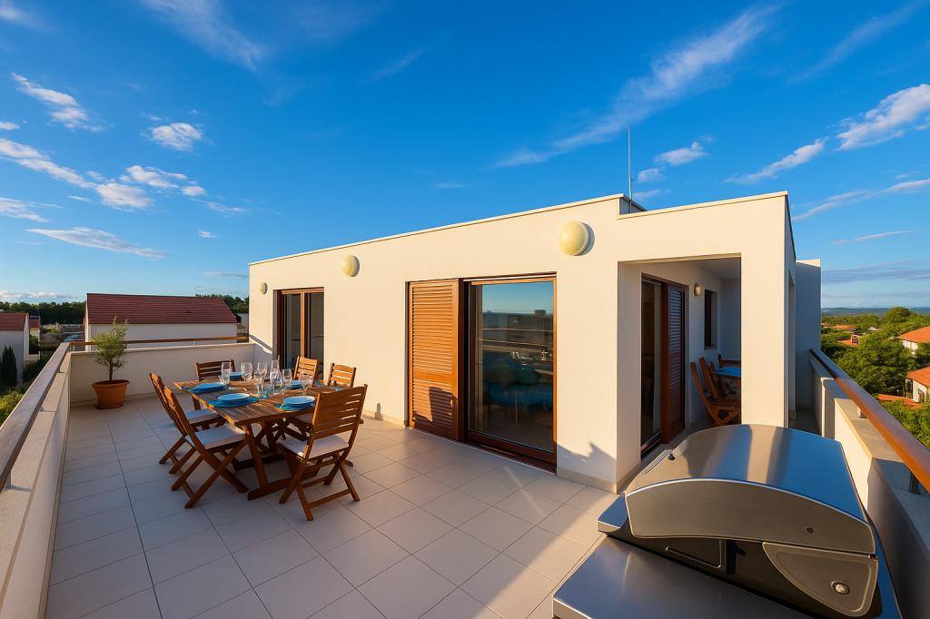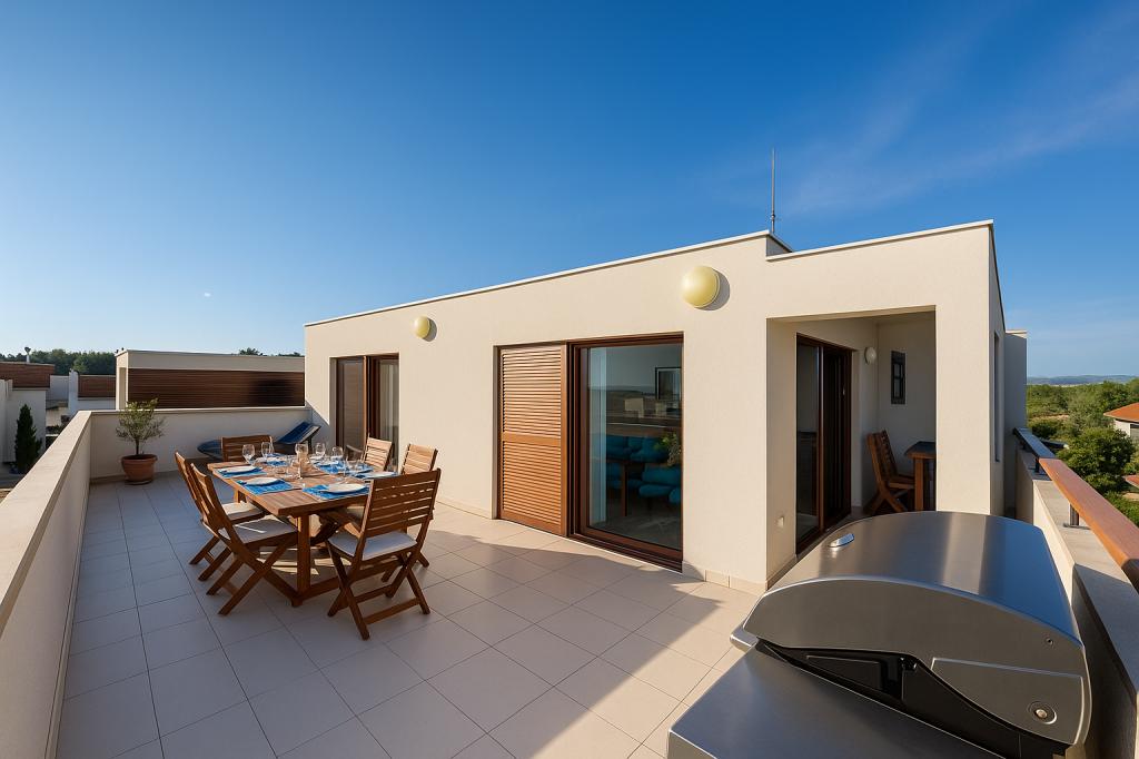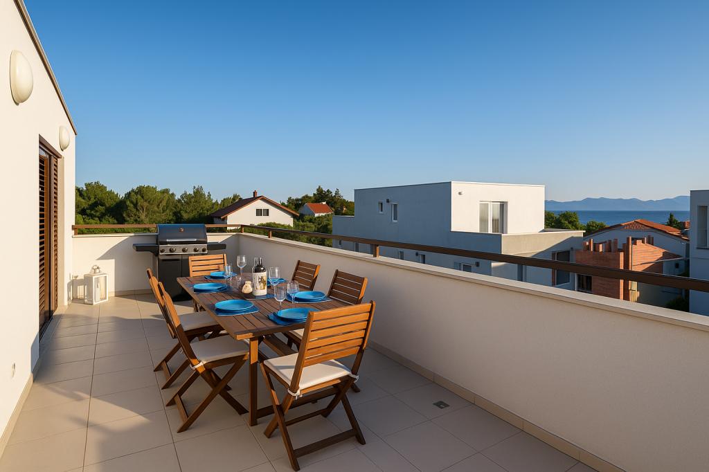 Das Aquamarine Deluxe Penthouse Apartment befindet sich in Petrčane, nur 150 m vom Strand Pineta und 250 m vom Strand Punta Radman entfernt. Es bietet eine großzügige Terrasse mit teilweisem Meerblick, einen Grill, kostenloses WLAN und einen privaten Parkplatz. Die Unterkunft verfügt über 3 Schlafzimmer, ein modernes Bad, ein Wohnzimmer mit Sofa und Flachbild-Sat-TV sowie eine voll ausgestattete Küche mit Essbereich, Bettwäsche und Handtüchern. Nur 200 m zur Bushaltestelle Petrčane und 23 km zum Flughafen Zadar. Flughafentransfer ist gegen Aufpreis möglich. Ideal für Familien oder Gruppen bis 6 Personen, die stilvollen Komfort am Meer suchen.