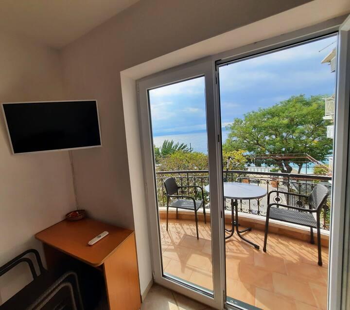 Schöne Wohnung mit großem Balkon und wunderschönem Meerblick, nur wenige Schritte vom Strand entfernt. Netter Besitzer. Wir empfehlen