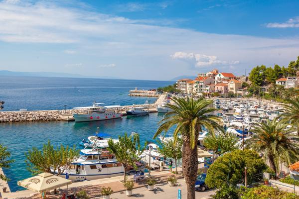 Komplett eingerichtete Apartments in Podgora, 20 Meter vom Meer entfernt, mit herrlichem Blick auf den Hafen, den Parkplatz und alles, was Ihnen zur Verfügung steht, von Apotheken, Geschäften, Bushaltestellen, Cafés ... Wunderschön angelegte Strände mit der Möglichkeit von Betten und Sonnenschirmen im Resort und außerhalb des Resorts. Entfernung 5 km von Makarska. die