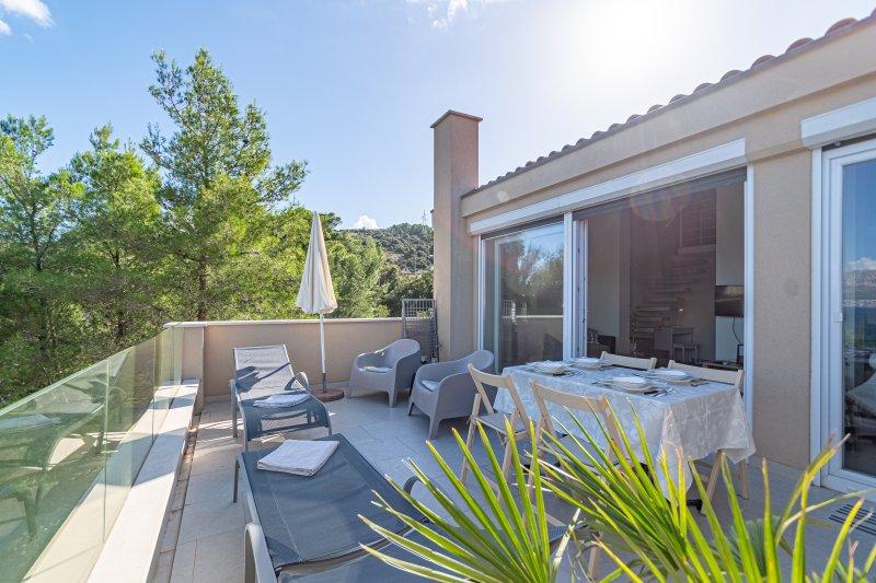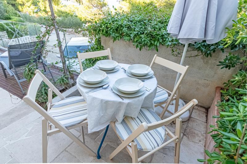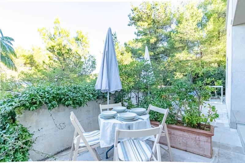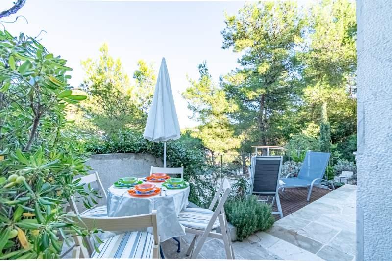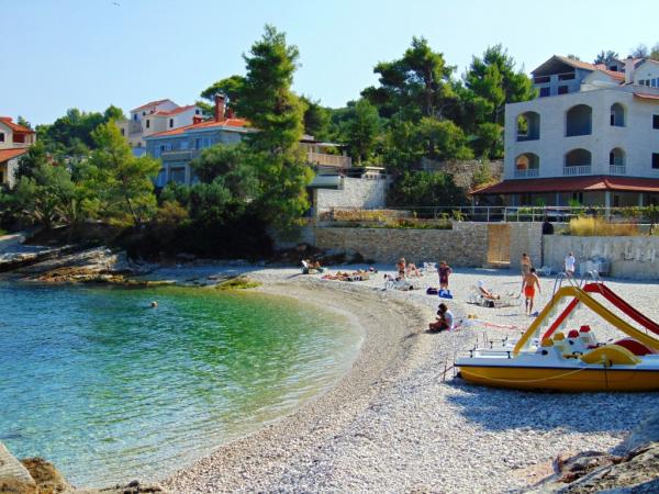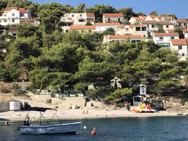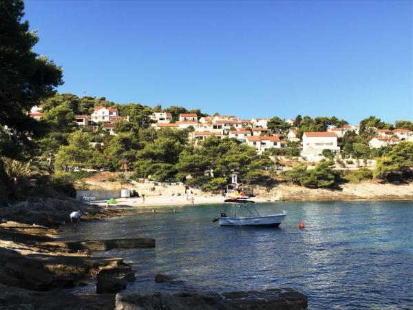 Kurtaxe ist im Preis inbegriffen.Die Villa Inga liegt in der Bucht Mala Lozna. In unmittelbarer Nähe des Apartments befindet sich auf einem Felsen eine Café-Bar, die sich harmonisch in die natürliche Umgebung einfügt und deren Terrassen sich bis zu einem für die ganze Familie geeigneten Kiesstrand erstrecken, an dem Liegestühle, Sonnenschirme und Duschen gemietet werden können. Ein paar Schritte entfernt beginnt die felsige Küste, an der Sie das Meer und das Schwimmen in einer viel intimeren Umgebung genießen können. Vor der Villa führt eine Straße durch einen Kiefernwald und am Meer entlang zur Bucht Lovrečina – ideal zum Radfahren, Spazierengehen, Joggen usw. 100 Meter entfernt befindet sich ein gut sortierter Supermarkt mit einem hervorragenden Angebot an Lebensmitteln, Getränken und Haushaltswaren. Das Zentrum von Postira erreichen Sie in etwa 20 Minuten zu Fuß entlang der Küste.