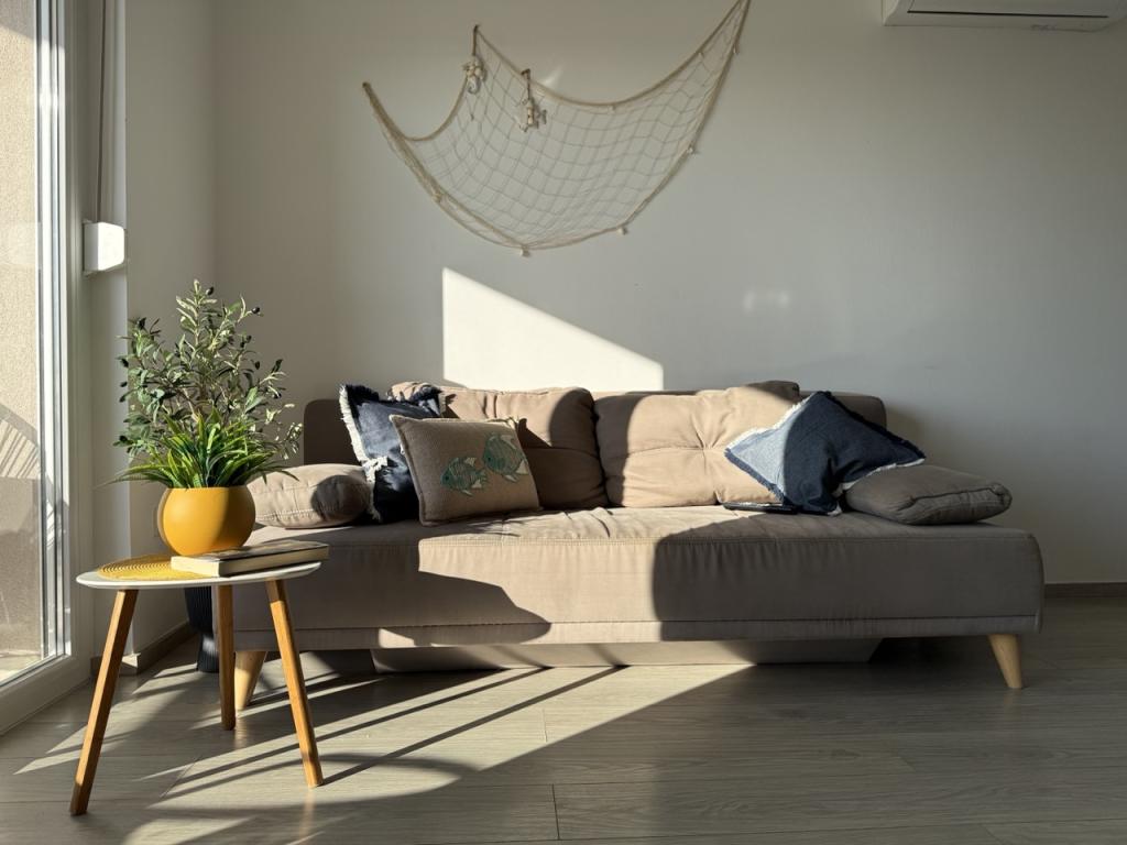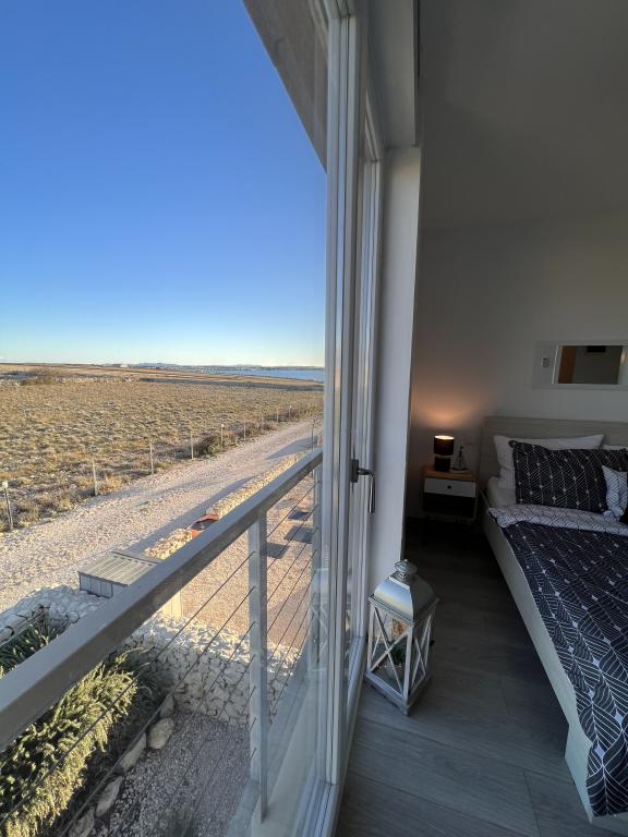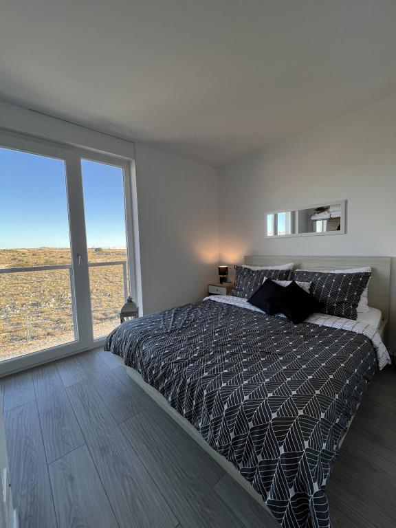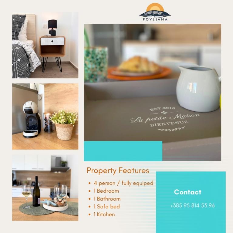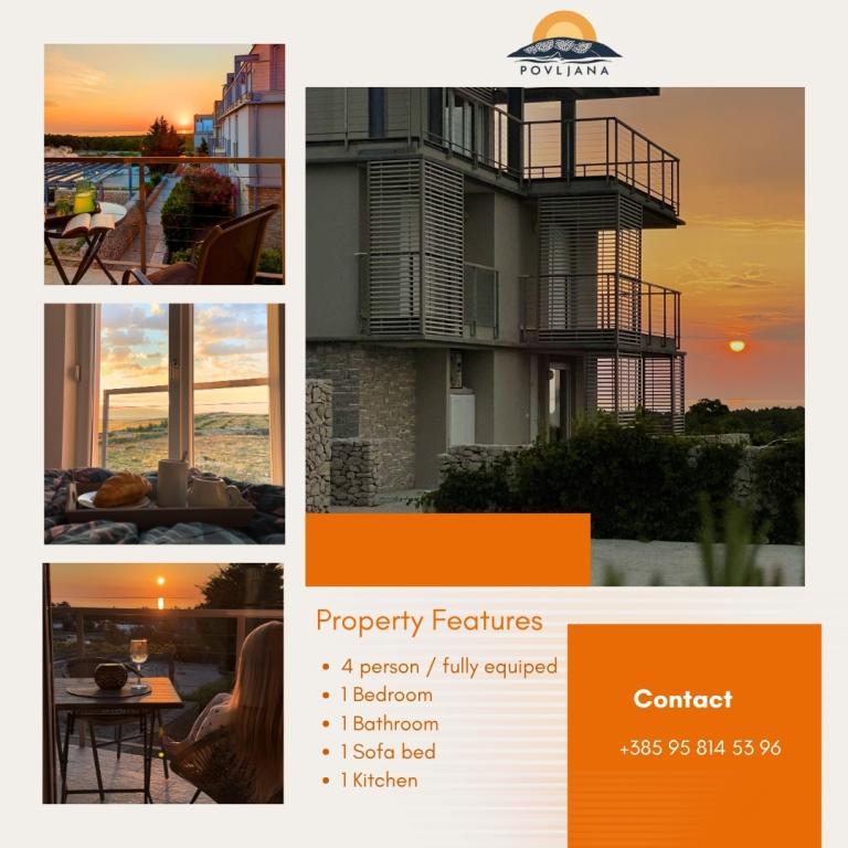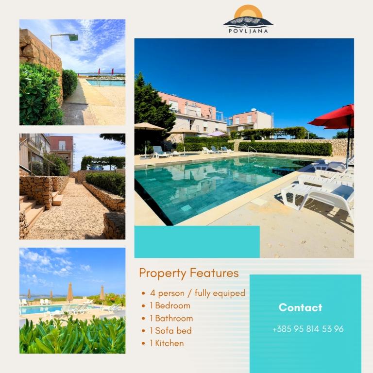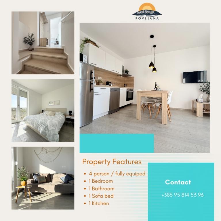 Modern ausgestattetes Apartment auf der Halbinsel Rastavac mit Blick auf Povljana und den Velebit-Nationalpark, innerhalb der Anlage Lijepi otok. Das Apartment ist komplett für einen komfortablen Aufenthalt ausgestattet. Es besteht aus einem Schlafzimmer mit Doppelbett und einem zusätzlichen Schlafsofa für zwei Personen im Wohnzimmer. Gästen des Apartments stehen kostenlose Parkplätze, ein Swimmingpool, ein Grillplatz und ein Gemeinschaftsspielplatz (Schaukeln, Tischtennisplatte) zur Verfügung. Ein ruhiger Sandstrand befindet sich direkt unterhalb der Anlage, nur 150 m entfernt. Kieselstrände und weitere öffentliche Sandstrände sind 2 bis 4 km entfernt. In unmittelbarer Nähe (200 m) befindet sich der neu eröffnete Campingplatz Amines Avalon. Der Eintritt zum Campingplatz ist frei (Einrichtungen: Shop, Fitnessstudio, Bäckerei, Restaurant, Aquapark). Das Zentrum von Povljana ist 4 km entfernt. Wenn Sie einen ruhigen Urlaub mit atemberaubenden Sonnenauf- und -untergängen, kristallklarem Meer und unberührter Natur suchen, ist Povljana die richtige Wahl für Sie.