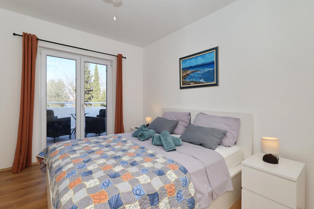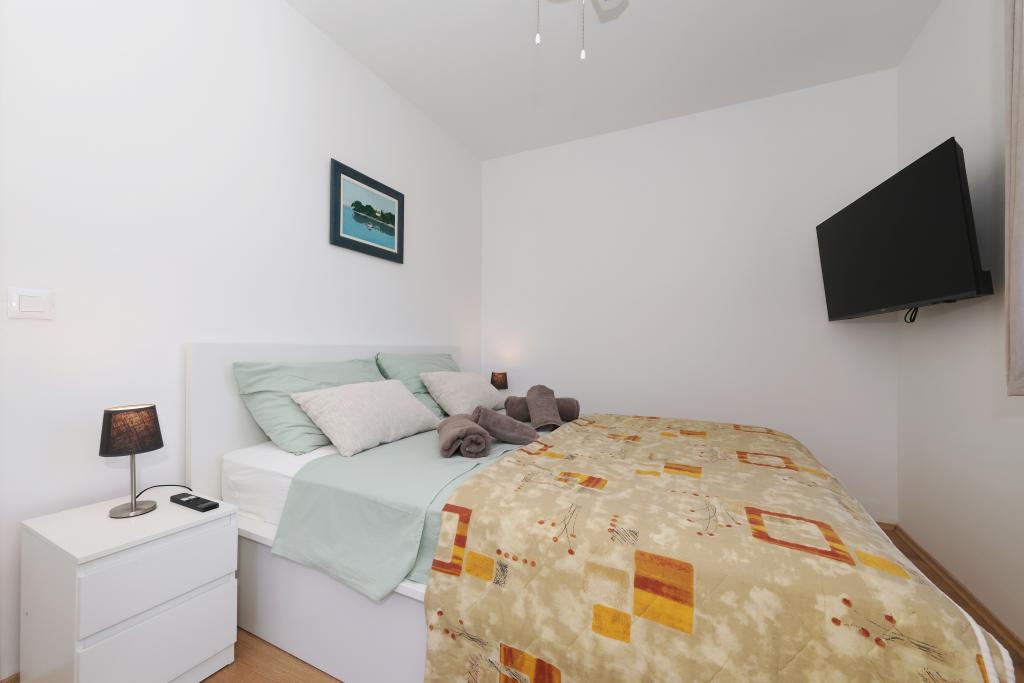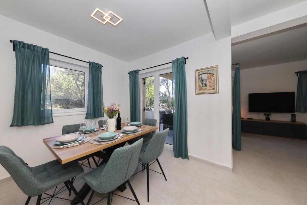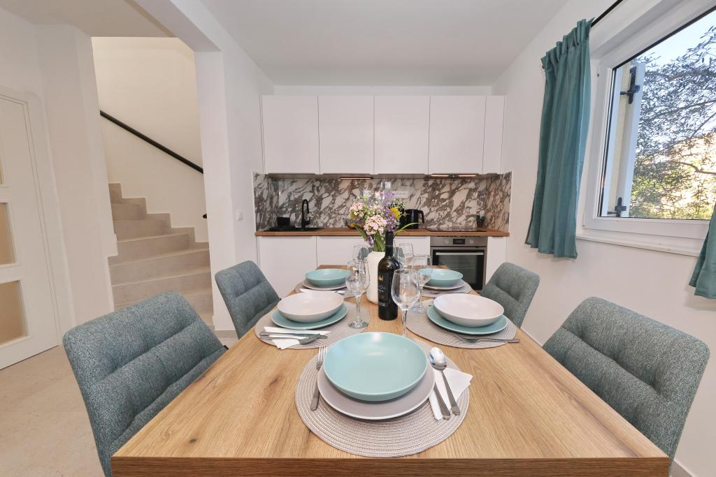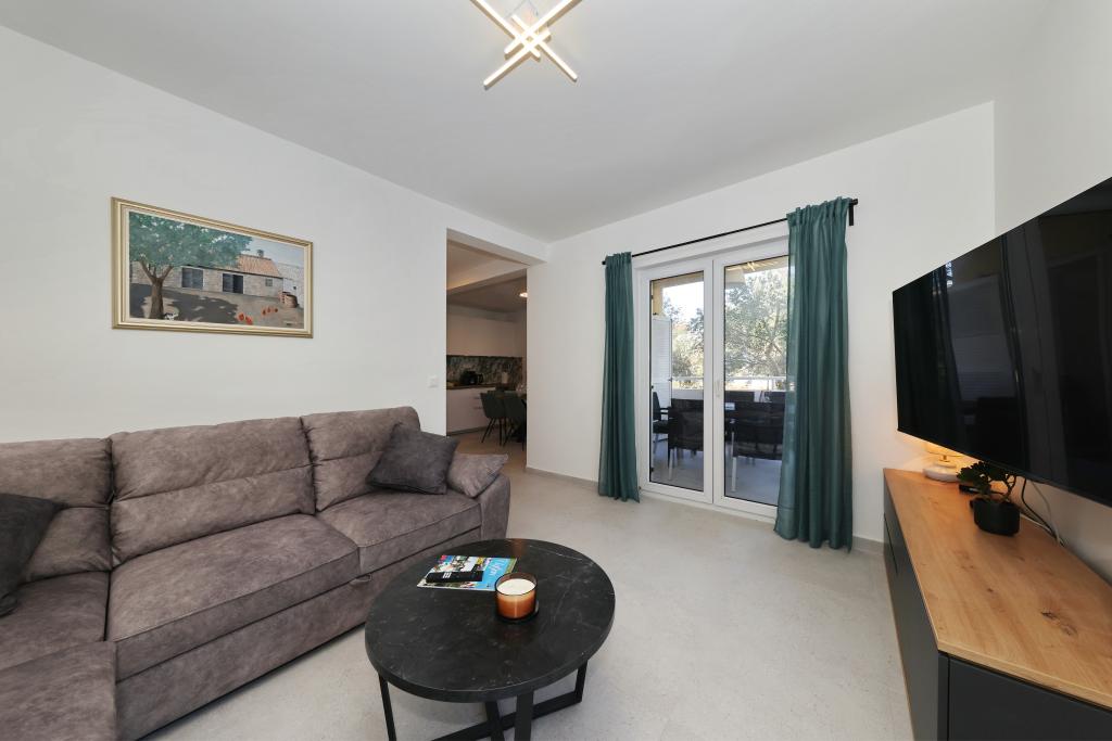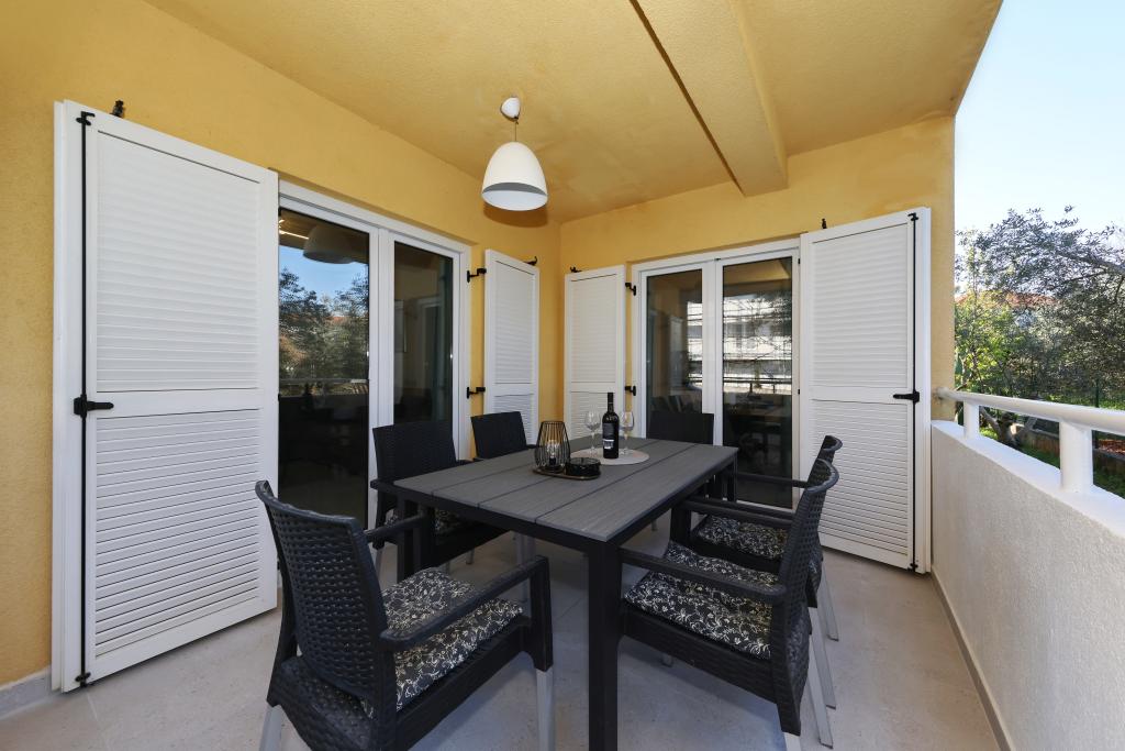 Voll ausgestattete Ferienwohnung mit zwei klimatisierten Schlafzimmern, einer Terrasse im ersten Stock, einer Loggia im Erdgeschoss und privatem Parkplatz in einem ruhigen Teil von Prek, direkt neben dem Sandstrand von Jaz.