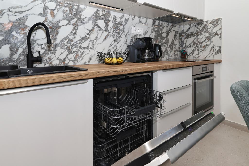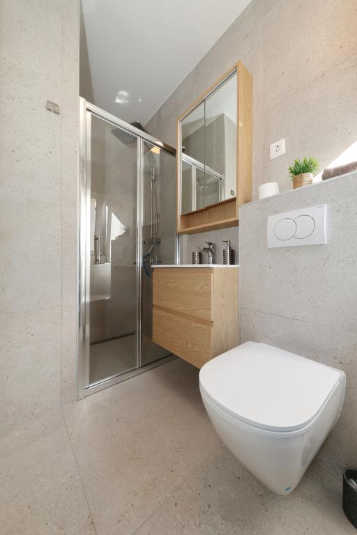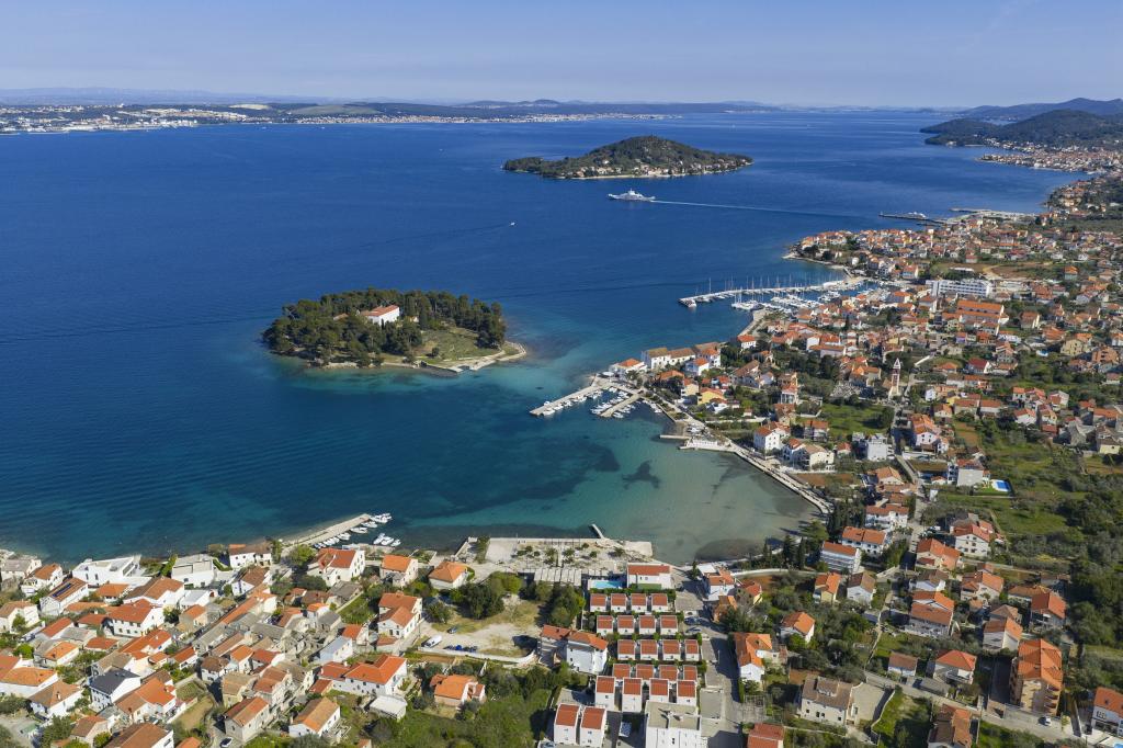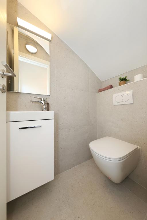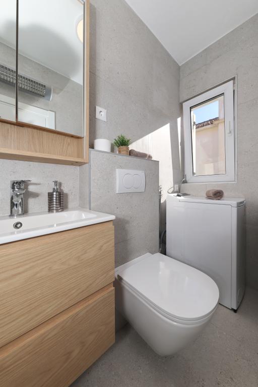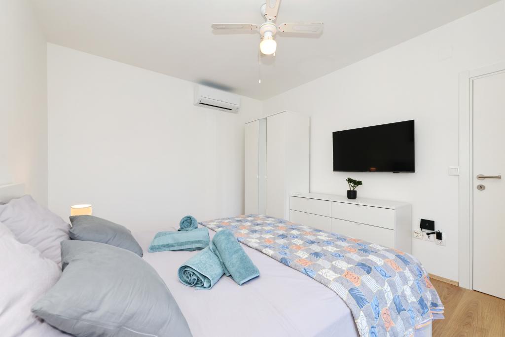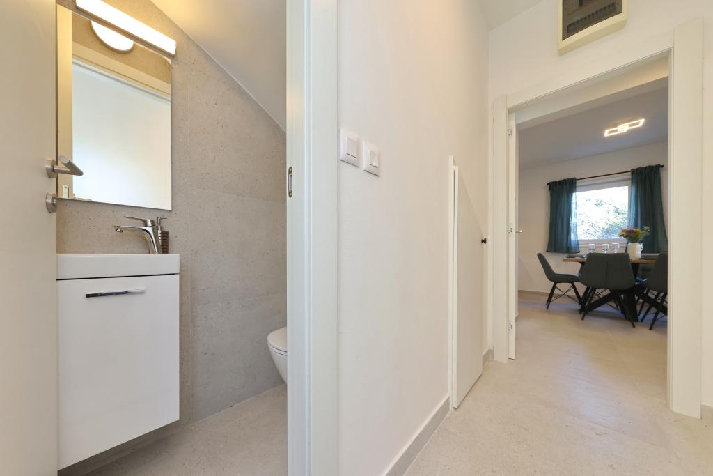 Voll ausgestattete Ferienwohnung mit zwei klimatisierten Schlafzimmern, einer Terrasse im ersten Stock, einer Loggia im Erdgeschoss und privatem Parkplatz in einem ruhigen Teil von Prek, direkt neben dem Sandstrand von Jaz.