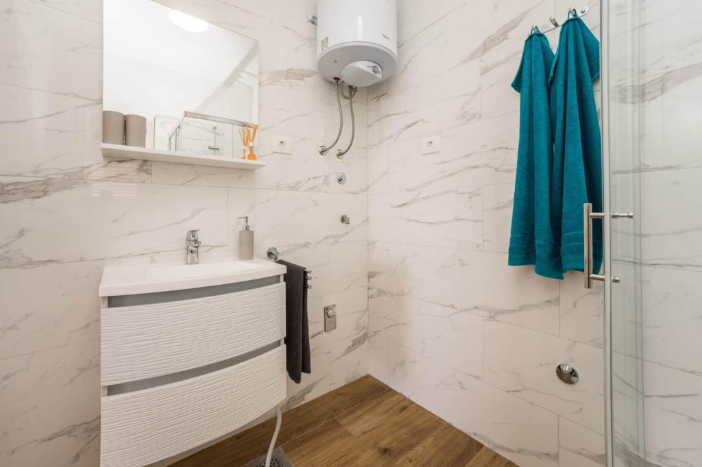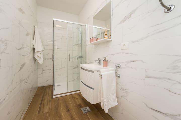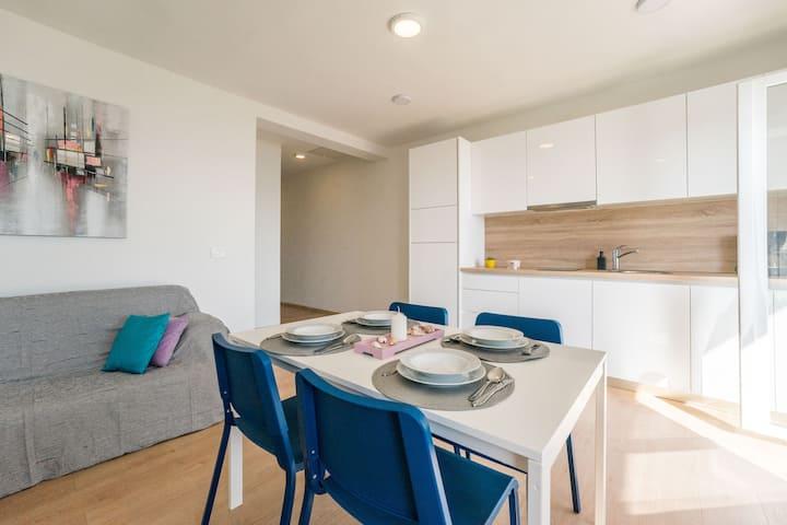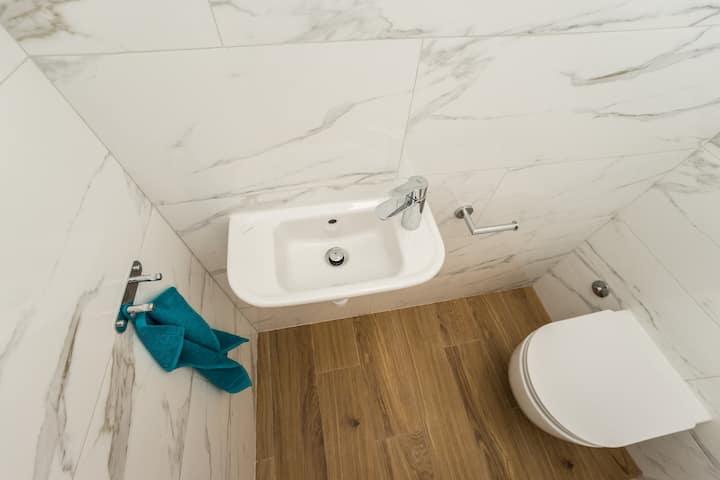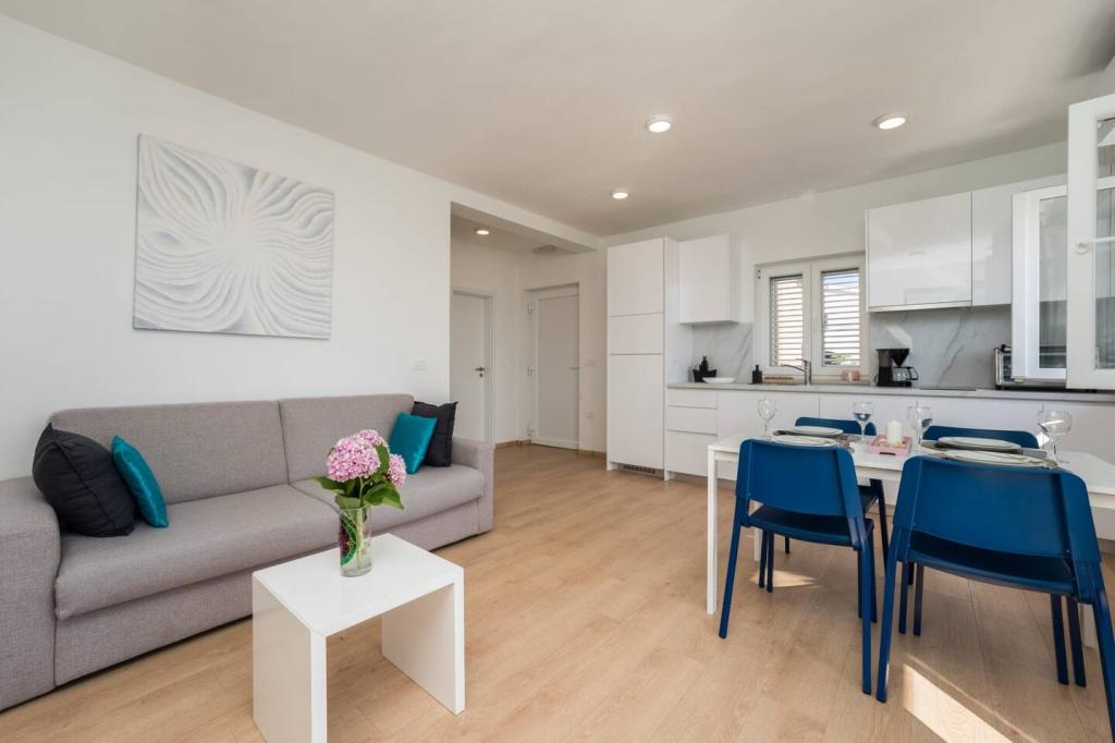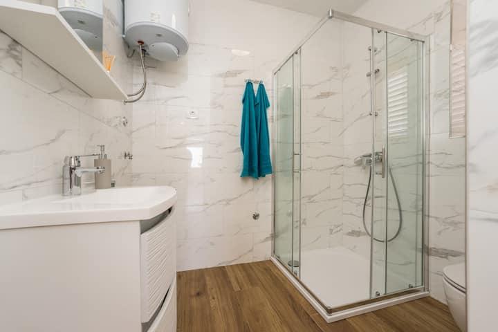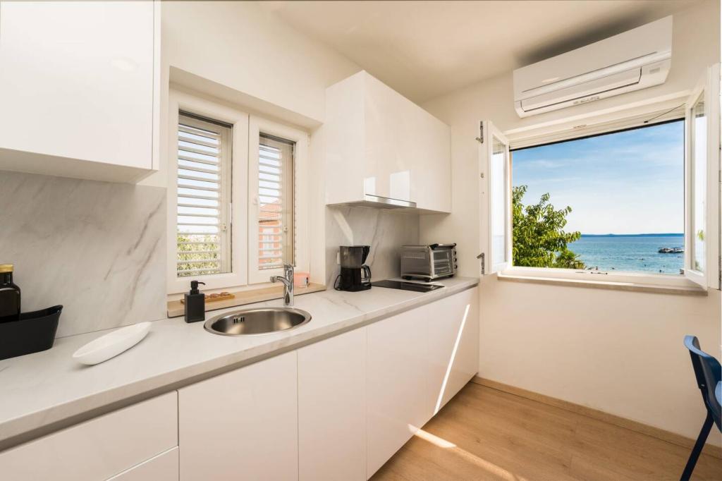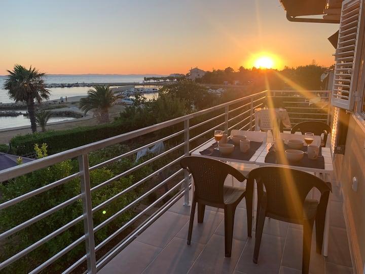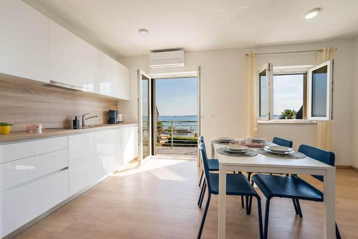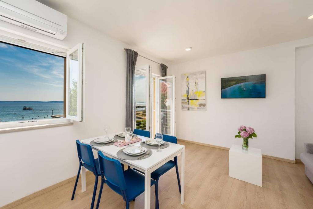 Neue und moderne Wohnungen in einem Haus in unmittelbarer Meeresnähe, mit wunderschönem Blick auf das Meer. Der Sandstrand ist in der Nähe und Sie können vor dem Haus schwimmen. Kostenloses WLAN ist verfügbar, es gibt Klimaanlagen in 2 Zimmern und Parkplätze stehen hinter oder vor dem Haus zur Verfügung. In der Nähe gibt es Geschäfte, Cafés und Restaurants. Jedes Apartment verfügt über 1 Schlafzimmer und ein Sofa im Wohnzimmer. Das Wohnzimmer ist mit der Küche verbunden. Es verfügt über ein Badezimmer und eine separate Toilette. Es gibt eine schöne Terrasse mit einem außergewöhnlichen Blick auf das Meer und einem kleinen Tisch, an dem Sie morgens Ihr Frühstück oder abends bei Sonnenuntergang genießen können. Genießen Sie Ihren erholsamen Urlaub in diesen wunderschönen Ferienwohnungen.