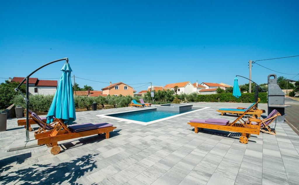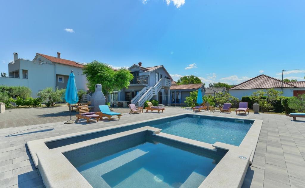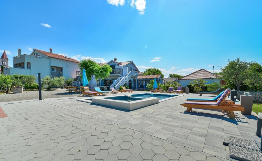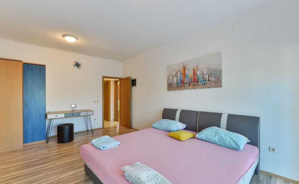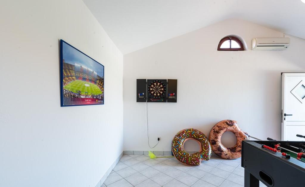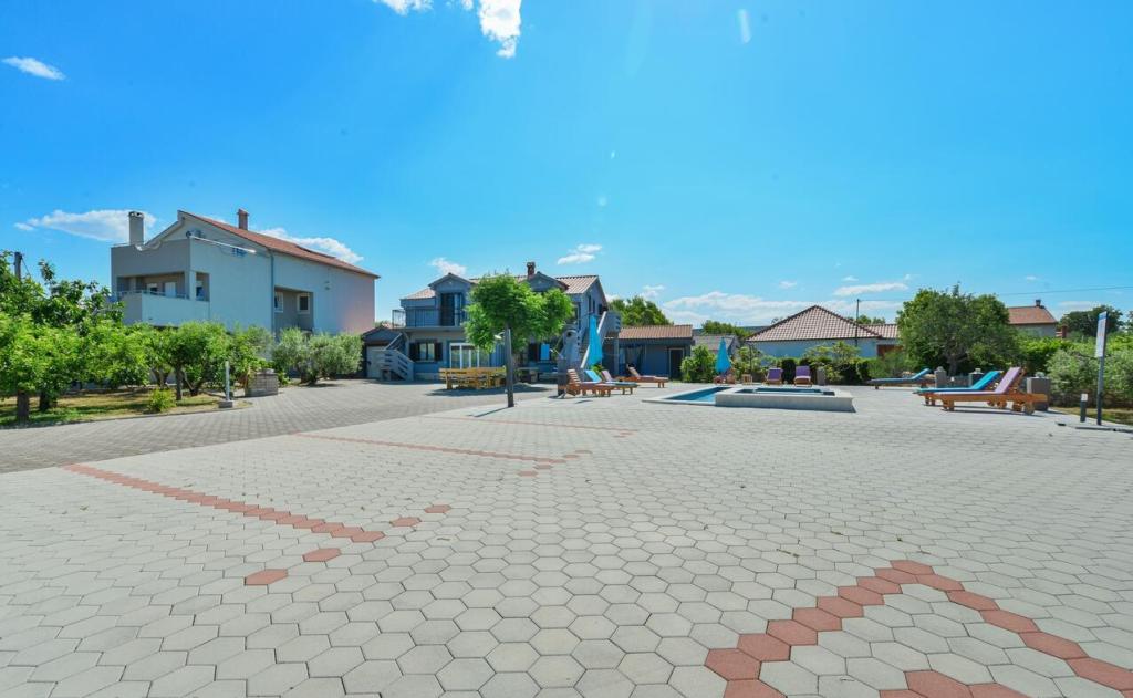 Die Apartments befinden sich 300 m vom Meer entfernt. Sie befinden sich an einem ruhigen Ort, umgeben von Olivenbäumen, Swimmingpool, Whirlpool, Grill, Spielzimmer mit Darts und Tischfußball. Großer Garten, eingezäunt...