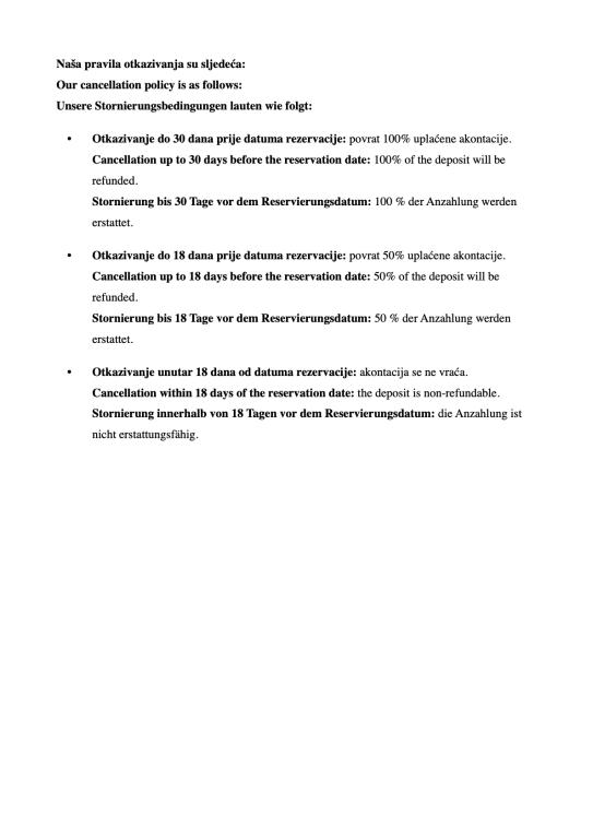 Kurtaxe ist im Preis inbegriffen. Buchungsbestätigungsdokument bei ReservierungStornierung 30 Tage vor dem Tag der Reservierung – 100 % der Anzahlung werden zurückerstattet. Stornierung 18 Tage vor der Reservierung – 50 % der Anzahlung werden zurückerstattet. Danach erfolgt keine Rückerstattung der Vorauszahlung.