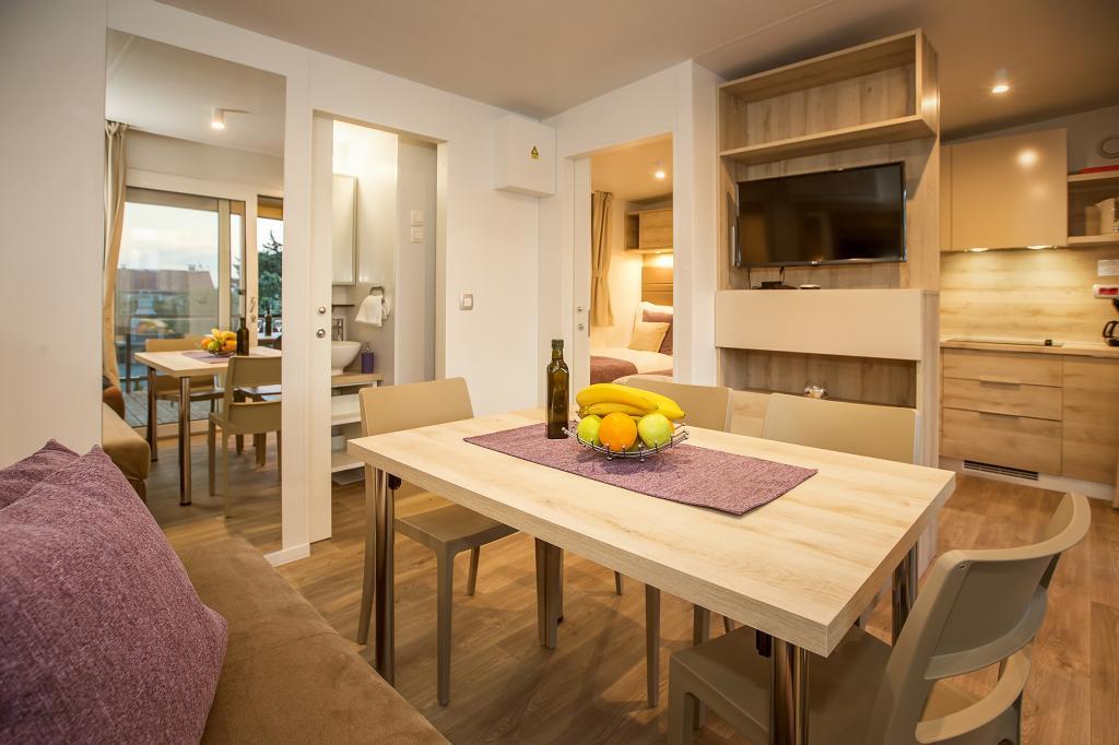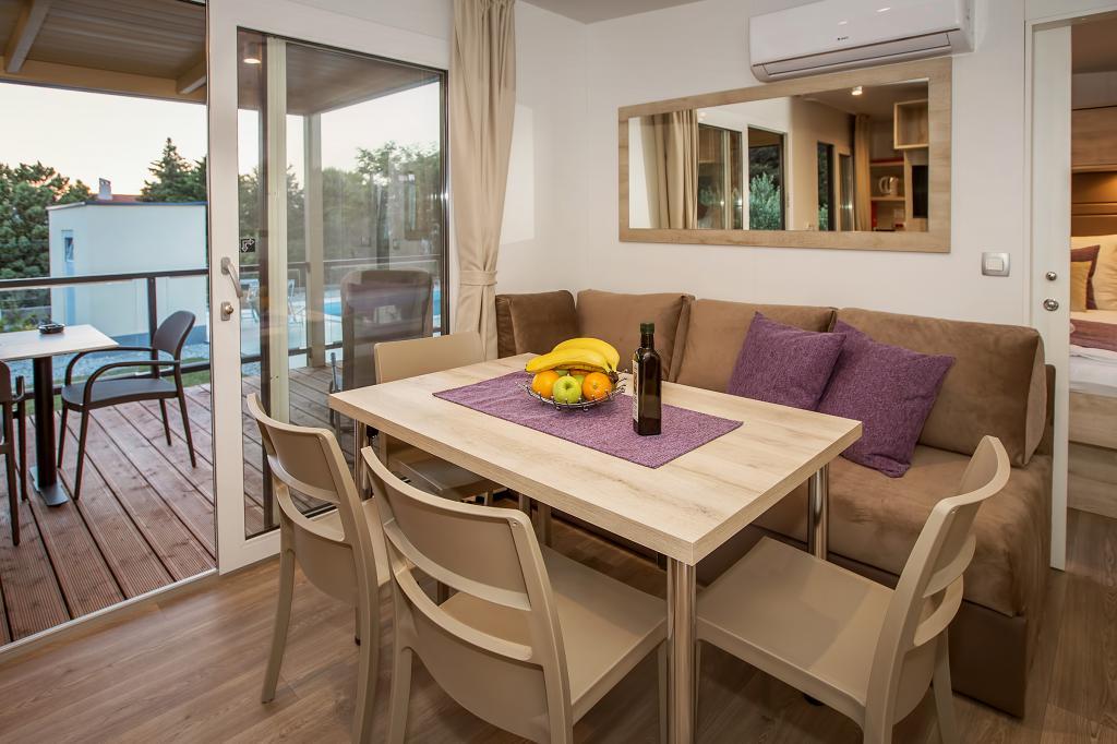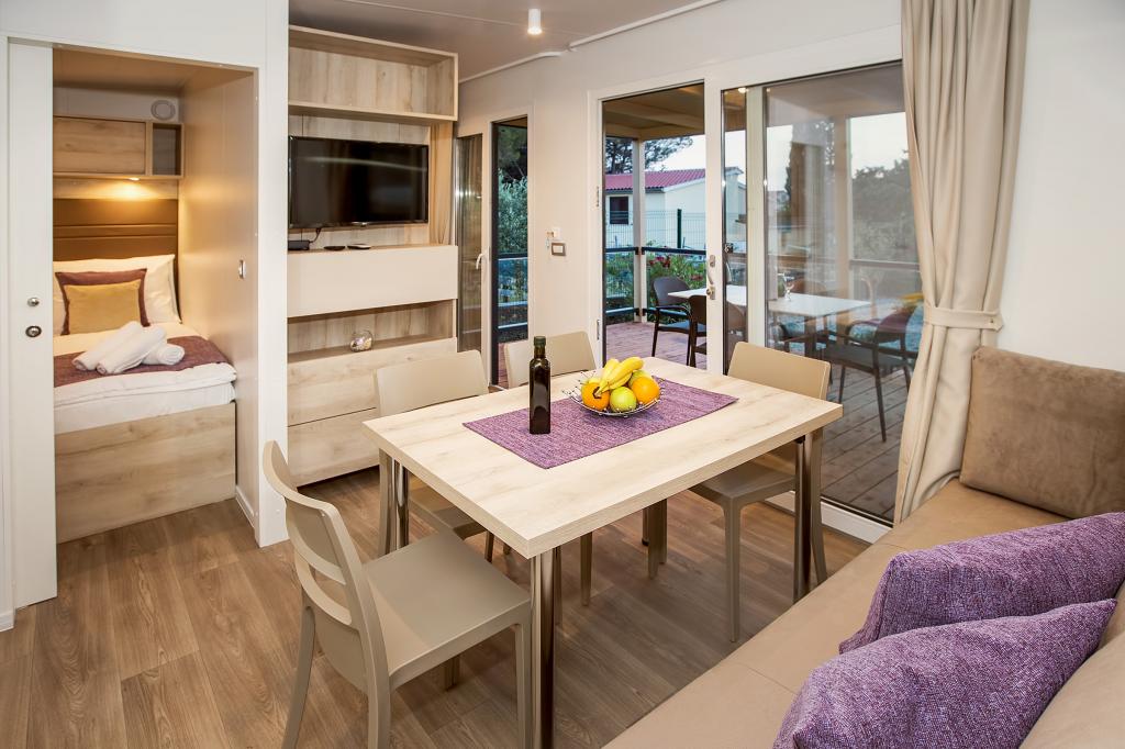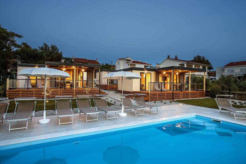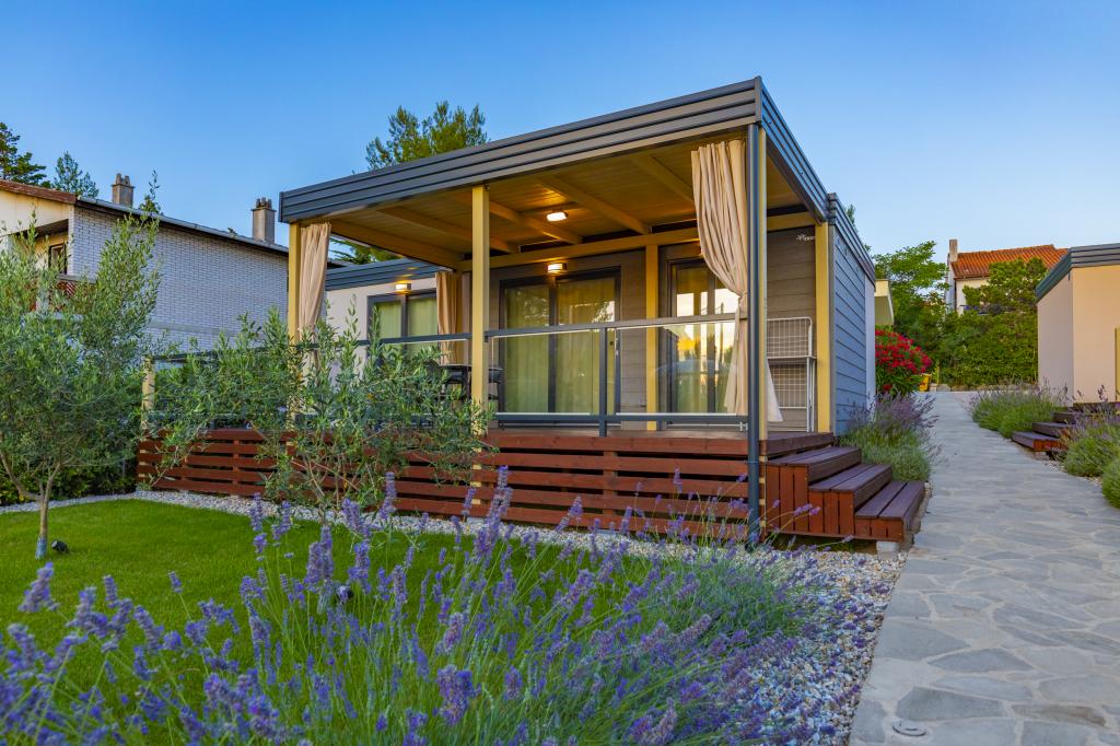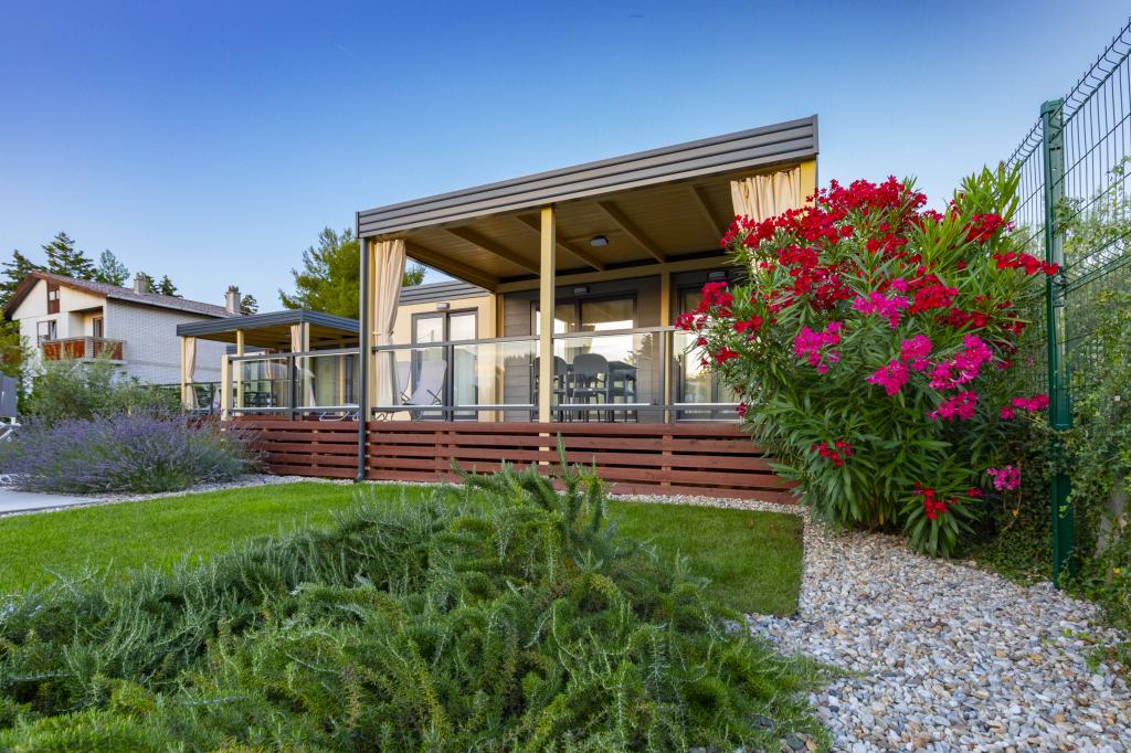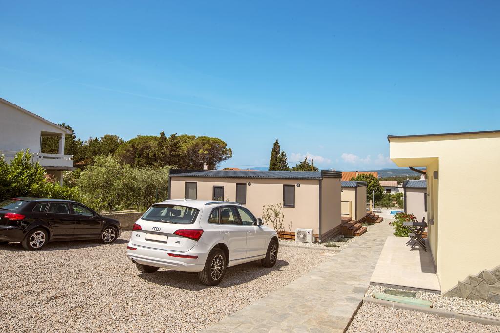 Die Mobilheime "Sanmar" befinden sich in Punt auf einem 900 m² großen Grundstück inmitten mediterraner Vegetation, nur wenige Gehminuten vom Kieselstrand entfernt. Die Unterbringung erfolgt in drei modernen Mobilheimen, in denen jeweils 4 Personen plus zwei Kinder in einem Zustellbett untergebracht werden können. Die Häuser haben zwei Schlafzimmer, das Zimmer mit Doppelbett hat ein eigenes Bad, es besteht auch die Möglichkeit, ein Zustellbett für zwei Kinder auf der Schlafcouch im Wohnzimmer zu stellen. Die Küche ist mit Geschirr und Küchengeräten ausgestattet. Jedes Mobilheim verfügt über insgesamt zwei Badezimmer mit Dusche und eine teilweise überdachte Terrasse von 20m2. Die Mobilheime verfügen über Klimaanlage, Sat-TV und WLAN. Den Gästen stehen ein Gemeinschaftspool (8 x 4 m), Liegestühle am Pool, ein Parkplatz, ein Fahrradständer, ein Gemeinschaftsgrill und die Nutzung einer Waschmaschine (auf Anfrage) zur Verfügung. Sanmar Complex ist der perfekte Ort für einen ruhigen Familienurlaub!
