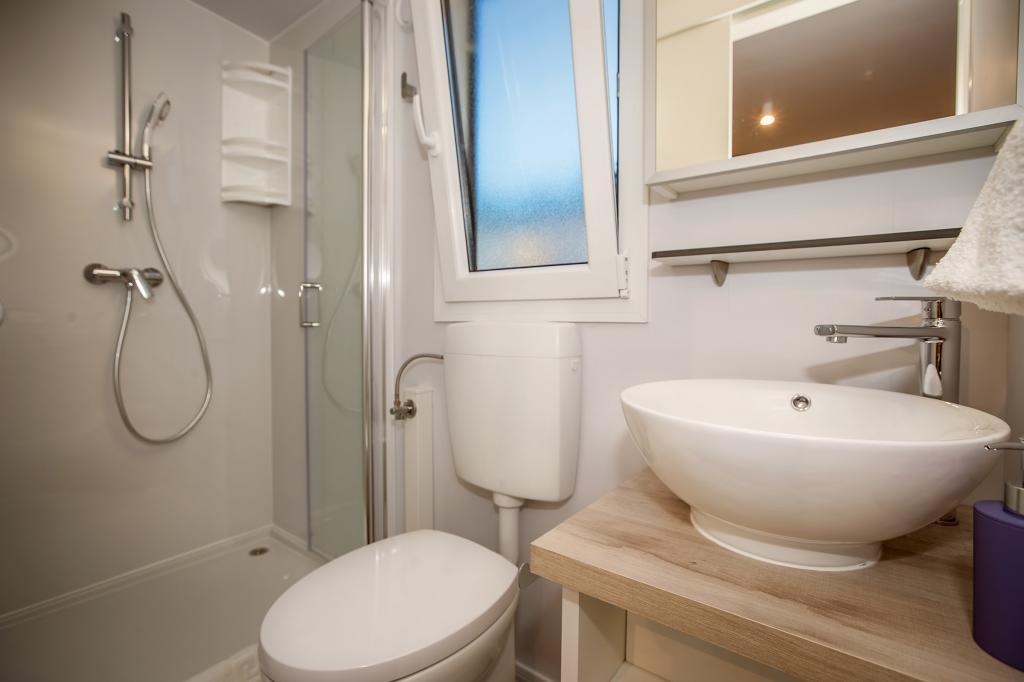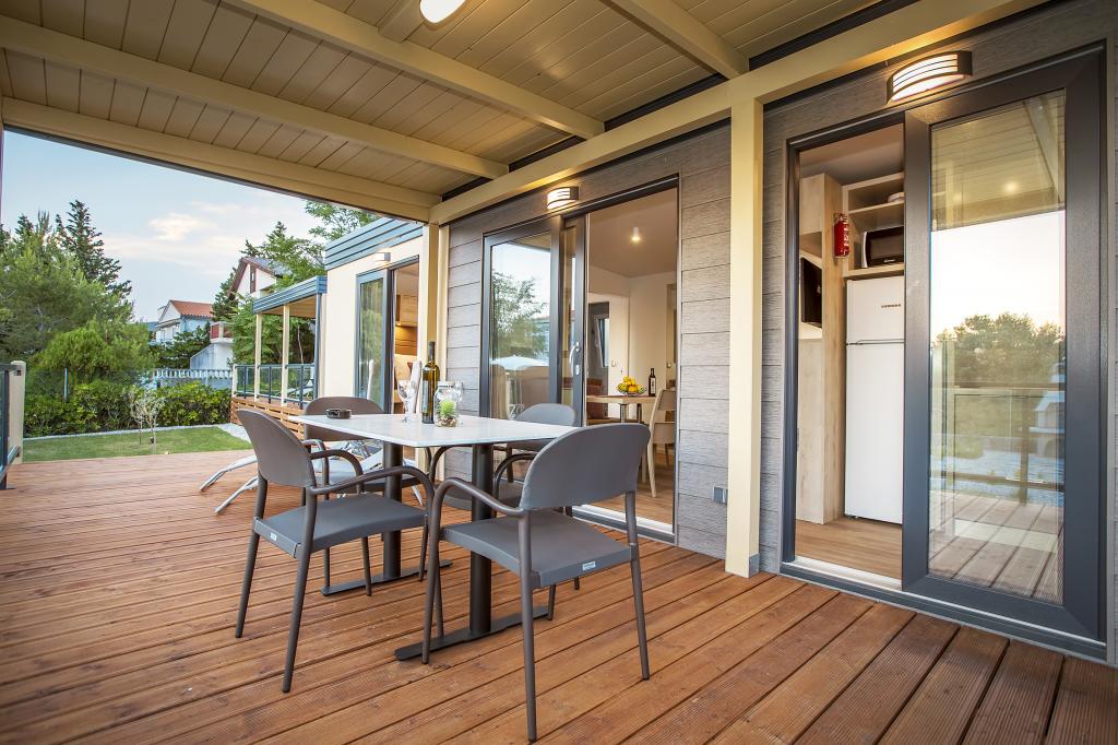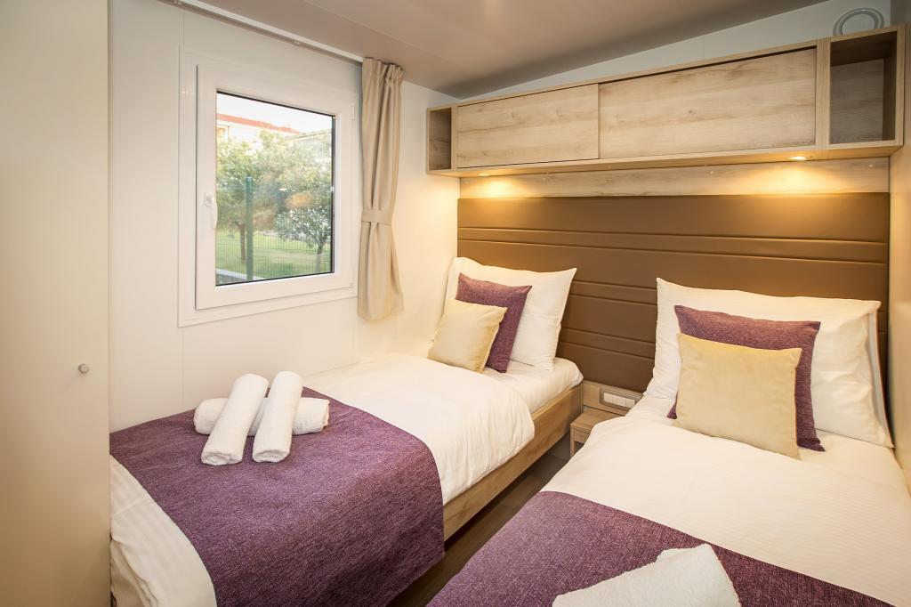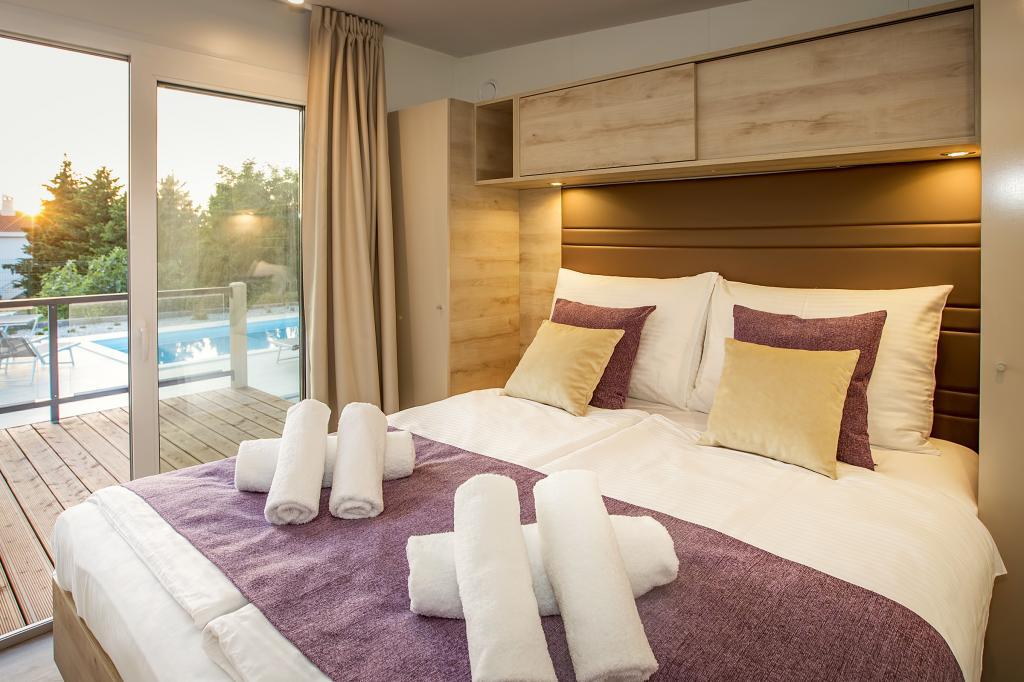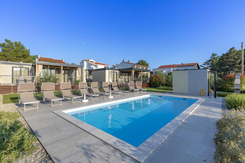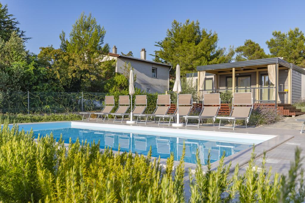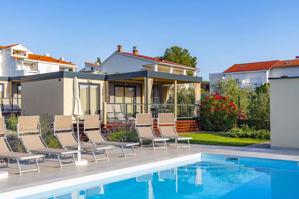 Die Mobilheime "Sanmar" befinden sich in Punt auf einem 900 m² großen Grundstück inmitten mediterraner Vegetation, nur wenige Gehminuten vom Kieselstrand entfernt. Die Unterbringung erfolgt in drei modernen Mobilheimen, in denen jeweils 4 Personen plus zwei Kinder in einem Zustellbett untergebracht werden können. Die Häuser haben zwei Schlafzimmer, das Zimmer mit Doppelbett hat ein eigenes Bad, es besteht auch die Möglichkeit, ein Zustellbett für zwei Kinder auf der Schlafcouch im Wohnzimmer zu stellen. Die Küche ist mit Geschirr und Küchengeräten ausgestattet. Jedes Mobilheim verfügt über insgesamt zwei Badezimmer mit Dusche und eine teilweise überdachte Terrasse von 20m2. Die Mobilheime verfügen über Klimaanlage, Sat-TV und WLAN. Den Gästen stehen ein Gemeinschaftspool (8 x 4 m), Liegestühle am Pool, ein Parkplatz, ein Fahrradständer, ein Gemeinschaftsgrill und die Nutzung einer Waschmaschine (auf Anfrage) zur Verfügung. Sanmar Complex ist der perfekte Ort für einen ruhigen Familienurlaub!