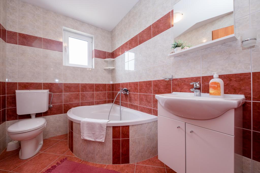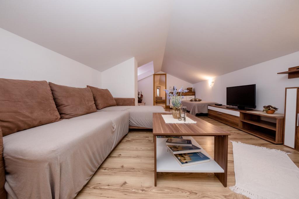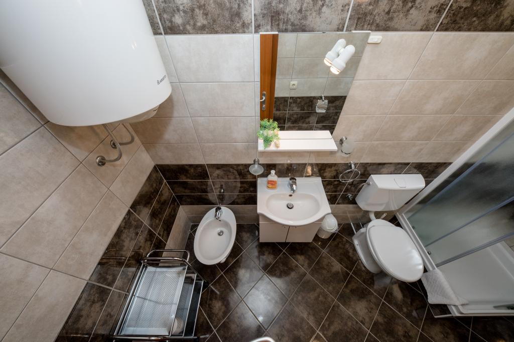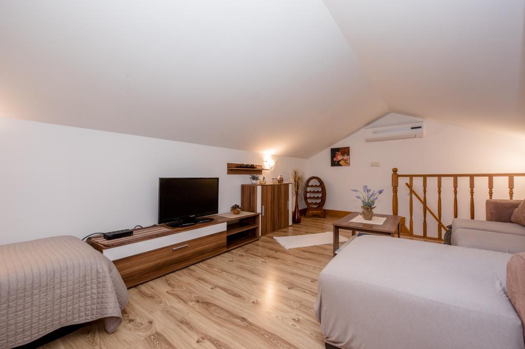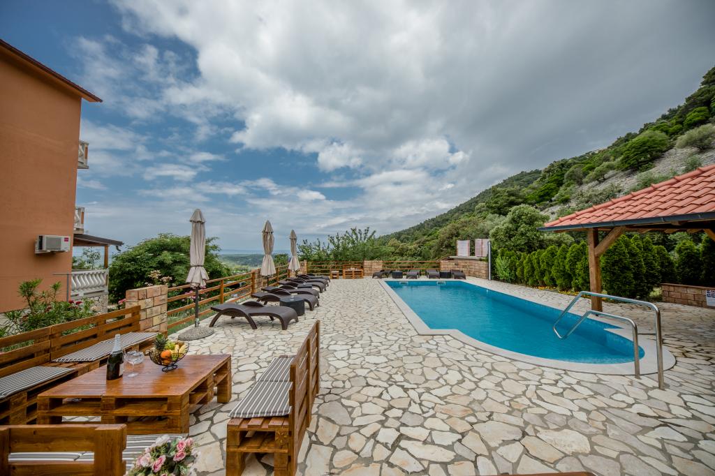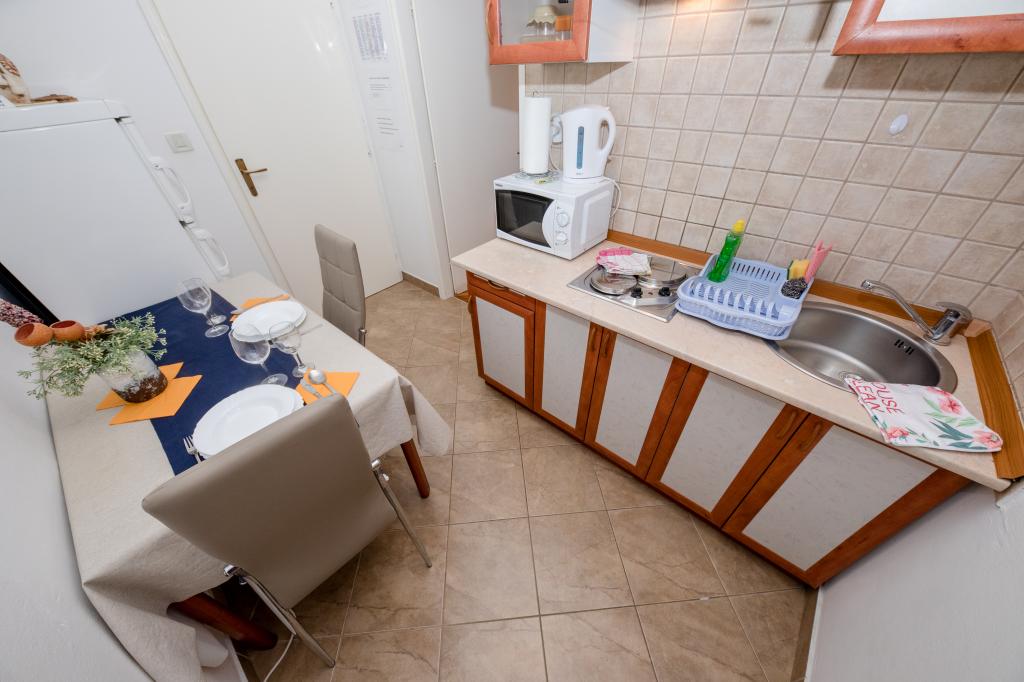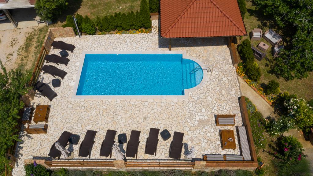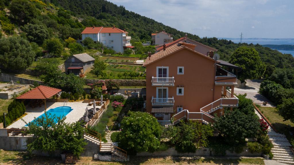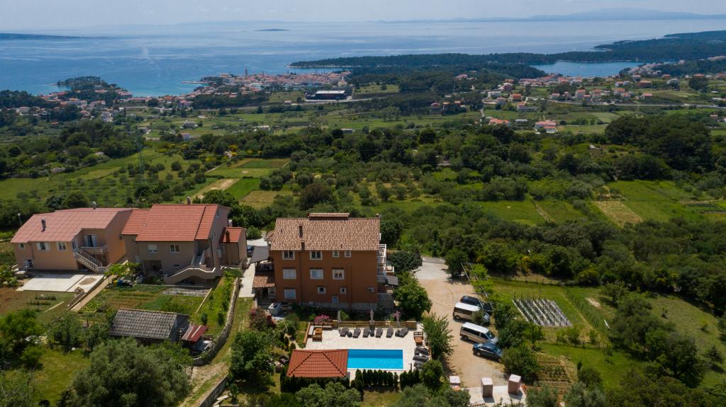 Modern ausgestattete Apartments auf 350 Meter über dem Meeresspiegel in einem ruhigen Dorf in Mundanije auf der Insel Rab namens Šćerba. Die Anlage ist ca. 2-3 km vom Meer, dem Zentrum und allen anderen wichtigen Orten entfernt, was ca. 10 Autominuten entfernt ist. Die Lage des Gebäudes bietet von allen Terrassen und Balkonen einen wunderschönen Blick auf die gesamte Insel und den größten Teil der Kvarner Bucht. Die Ruhe und wenig Verkehr unserer Stadt bietet einen perfekten und erholsamen Urlaub im Schutz der Natur und bei herrlichem Sommerwetter. Neben dem Haus befindet sich ein großer Parkplatz und hinter dem Haus befindet sich ein schön angelegter Swimmingpool und daneben eine Liegewiese.