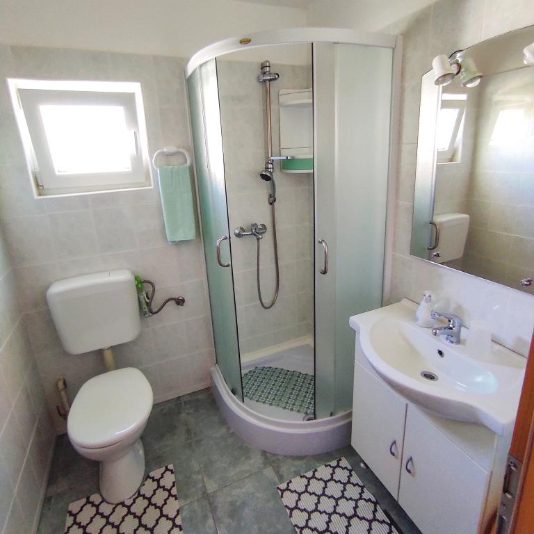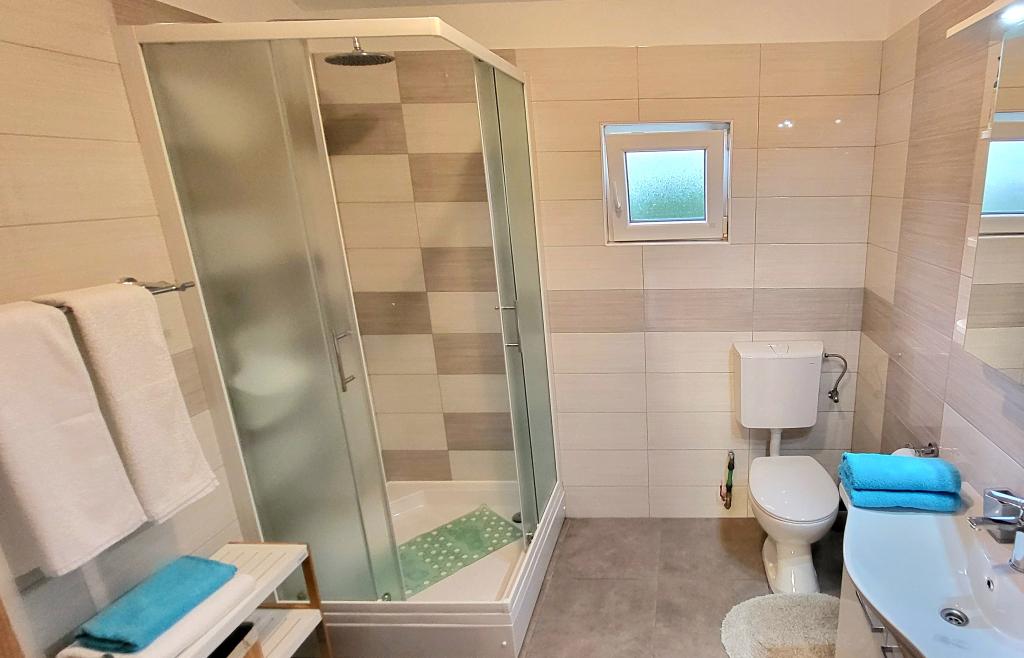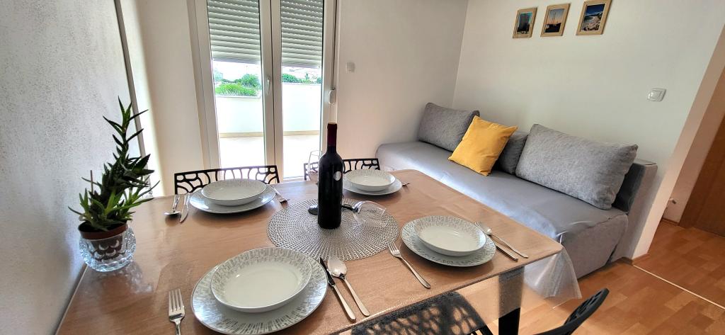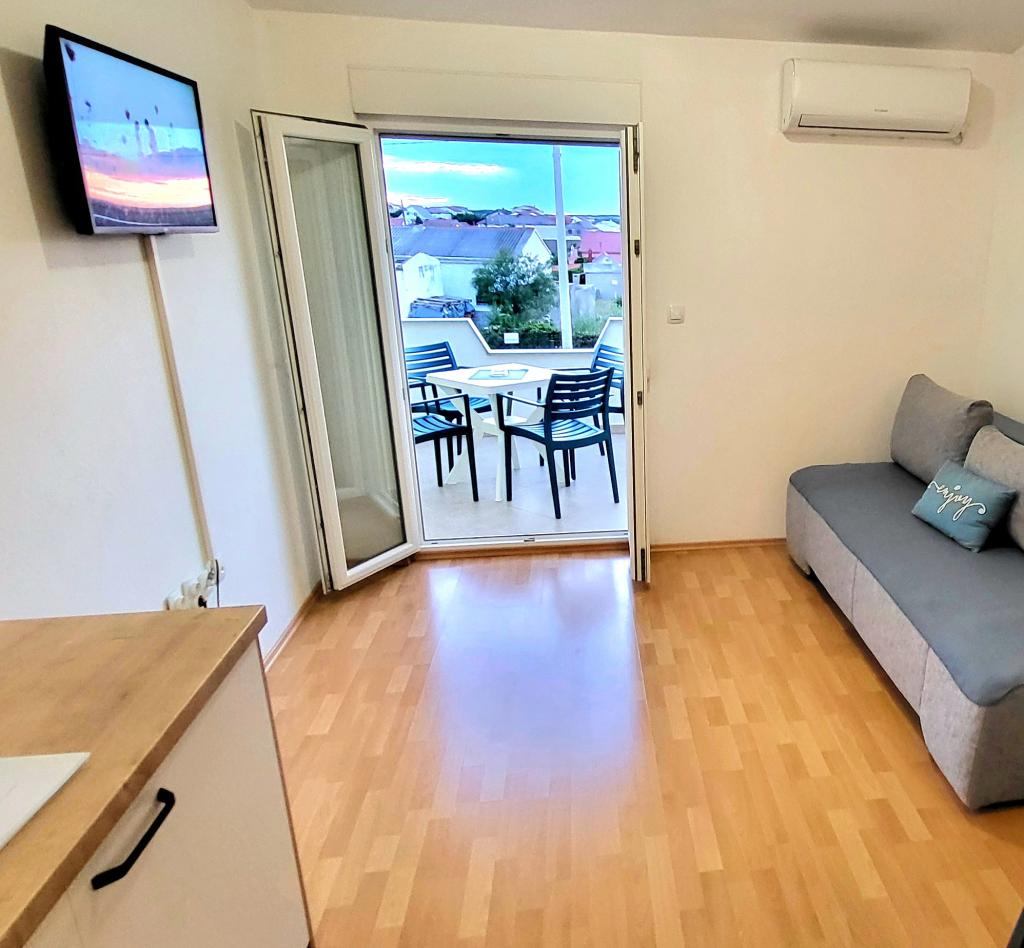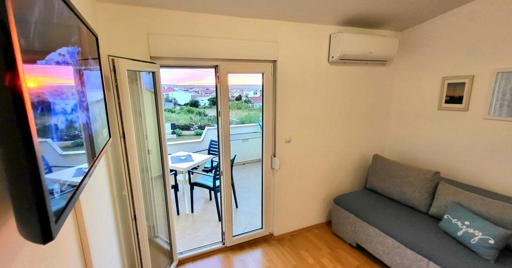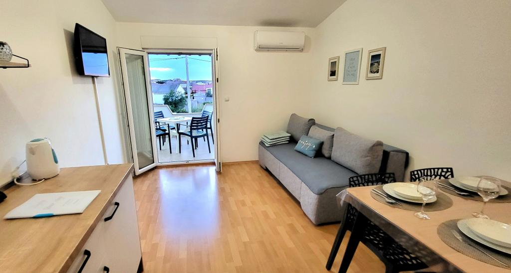 Die Wohnungen befinden sich im ersten Stock eines Einfamilienhauses. Jede Wohnung besteht aus einem Schlafzimmer, einer Küche und einem Wohnzimmer, einem Flur, einem Badezimmer und einem Balkon mit einem wunderschönen Blick auf das Meer und das Velebit-Gebirge und ist für max. 4 Leute. Es gibt ein Doppelbett im Schlafzimmer und ein Zustellbett im Wohnzimmer, das in den Wohnungen A und B für 2 Kinder geeignet ist, während in Wohnung C ein Zustellbett auch für 2 Erwachsene geeignet ist. Die Wohnungen verfügen unter anderem über WLAN, Sat-TV, Klimaanlage, Bügeleisen und Bügelbrett. Die Gäste können auch die gemeinsame Waschmaschine in der Garage sowie den Grill und den Privatparkplatz im Innenhof des Hauses nutzen. Das Haus liegt in einer ruhigen Umgebung ohne viel Lärm und lauten Verkehr und in der Nähe von allem, was dieser Ort zu bieten hat, und nur 3 Gehminuten vom Strand entfernt, ideal für völlige Entspannung und den Genuss Ihres Jahresurlaubs.