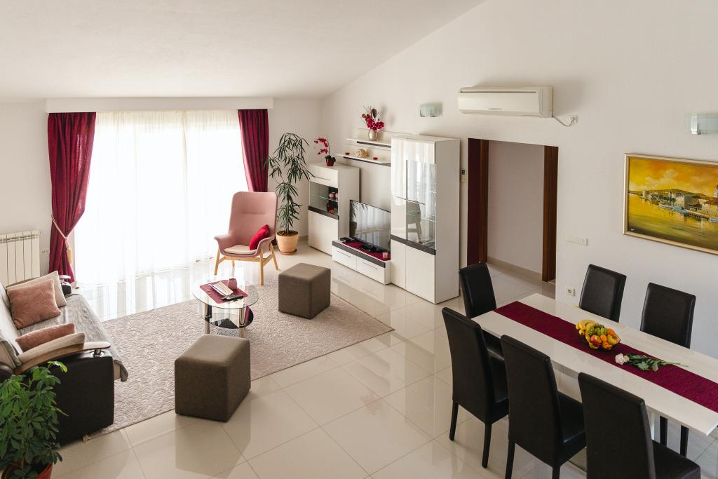 VILLA MARIJA liegt im kleinen Fischerdorf Seget-Vranjica, nur 25 Meter vom Meer und Strand entfernt, Trogir – 6 km, Split – 30 km, auf dem Bauernhof der Familie Bilota, mit einer Fläche von über 2500 m2, neben einem alten Steinhaus, das vor 130 Jahren gebaut wurde. Die Tradition des ökologischen Anbaus landwirtschaftlicher Nutzpflanzen ist bis heute erhalten geblieben. Die Familie Bilota verfügt über einen eigenen Olivenhain, einen Weinberg und große fruchtbare Flächen für den Gemüseanbau. Allen Gästen des Anwesens bieten die freundlichen Gastgeber eine familiäre Atmosphäre und bieten 3 geräumige und voll ausgestattete Apartments (2 2) für den Urlaub innerhalb des Familienanwesens und ein neues LUXUS-Apartment (6 2) für zwei Familien (zwei Schlafzimmer (2 1). ), Wohnzimmer mit Schlafcouch (2 Personen), zwei Badezimmer, ausgestattete Küche. Alle Apartments verfügen vom Wohnzimmer und Schlafzimmer über einen hervorragenden Blick auf das Meer, der Sie dazu einlädt, auf den großen Balkon zu gehen und die Atmosphäre zu genießen Geruch des Meeres und der mediterranen Vegetation