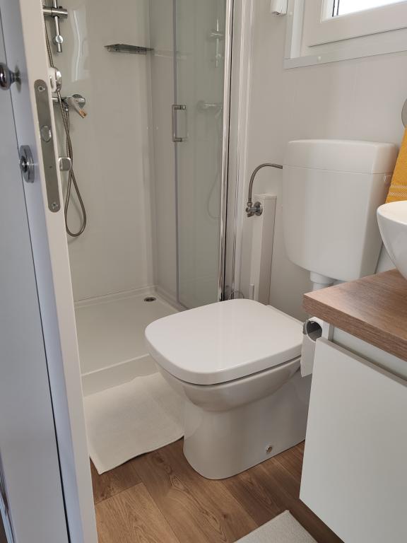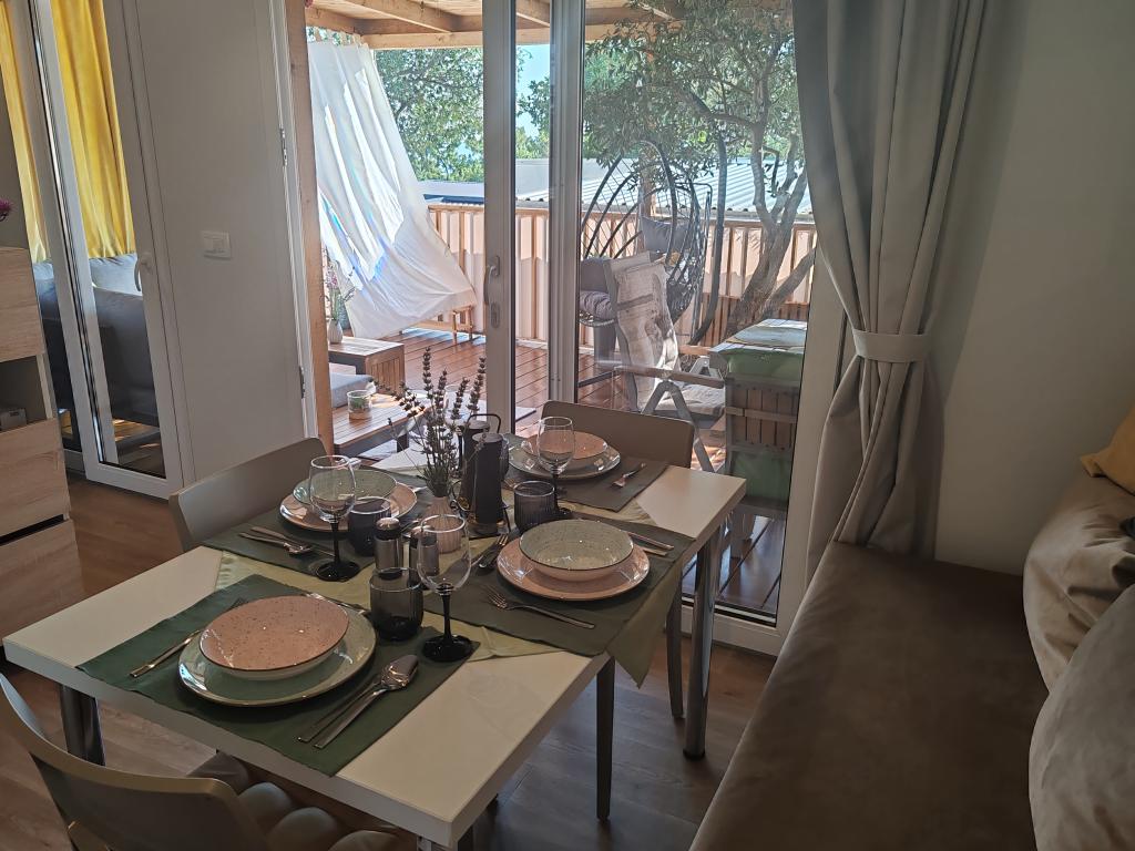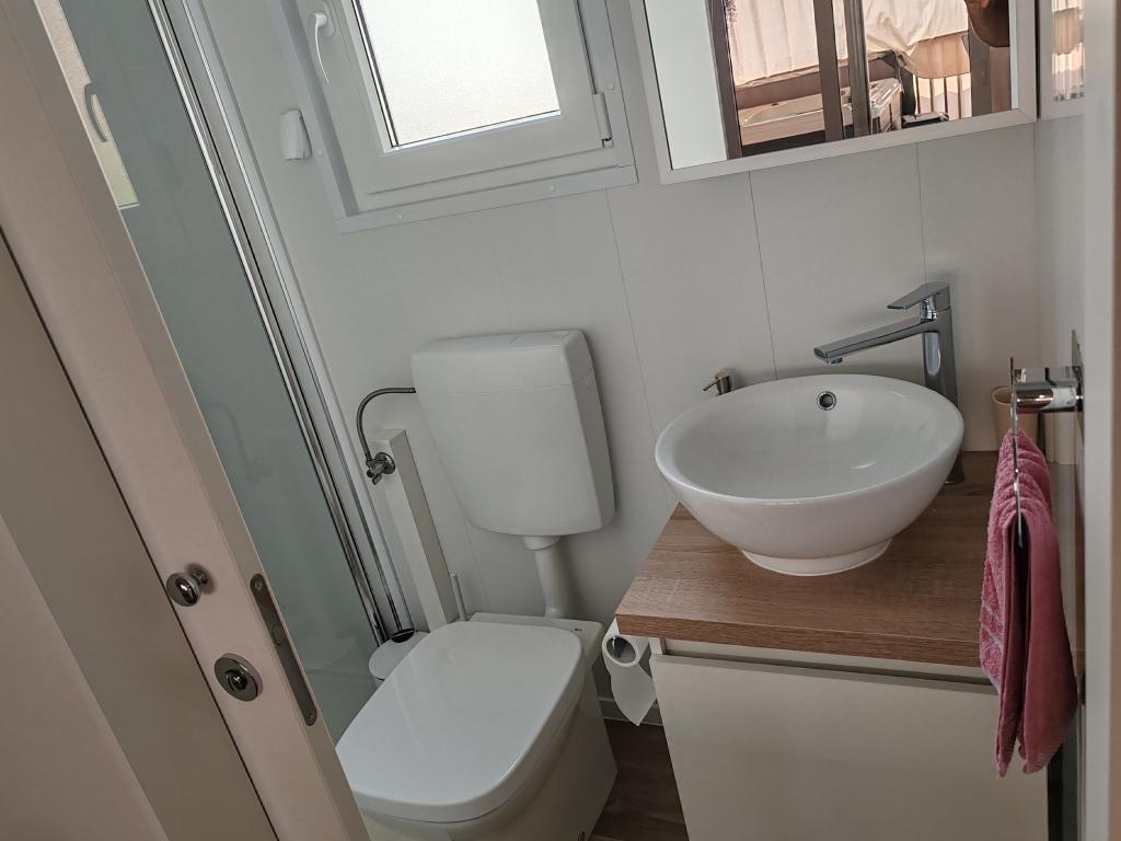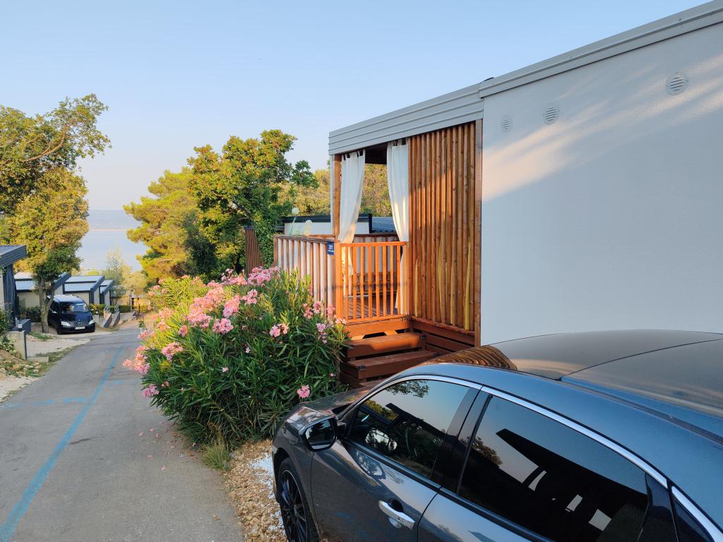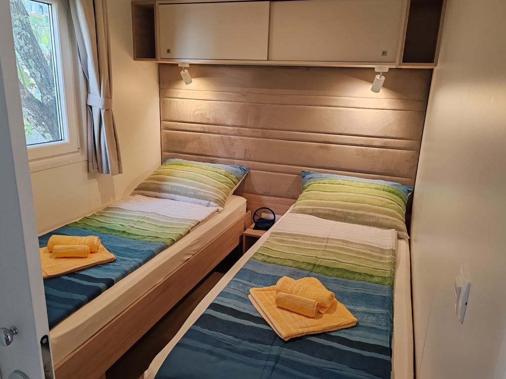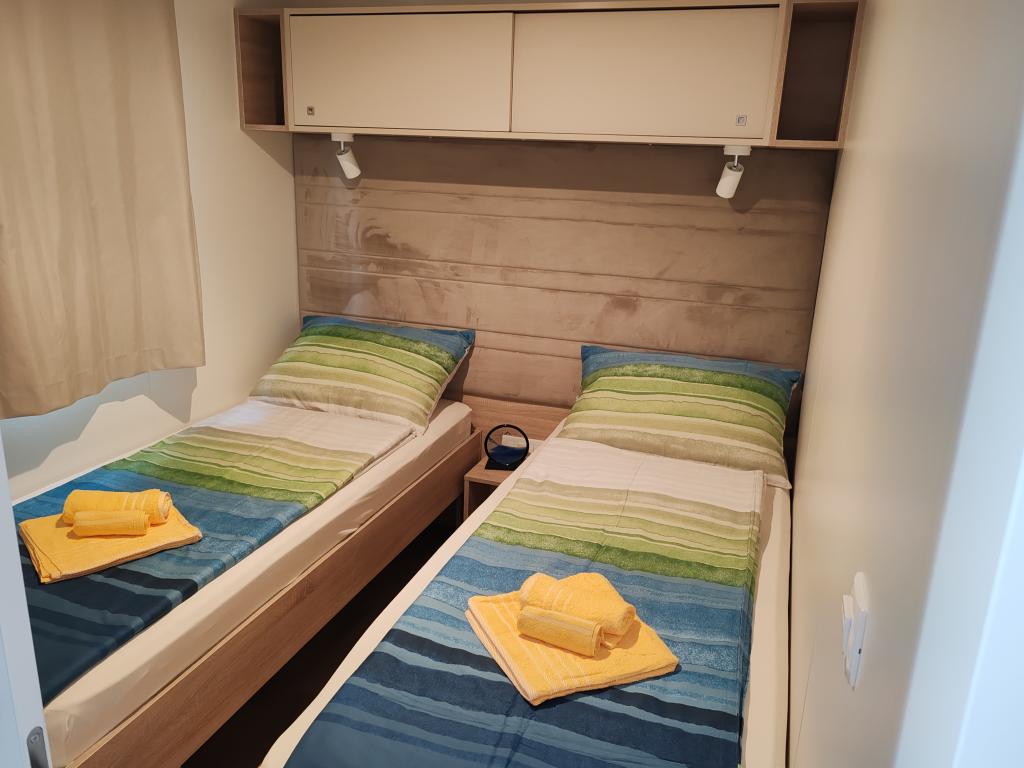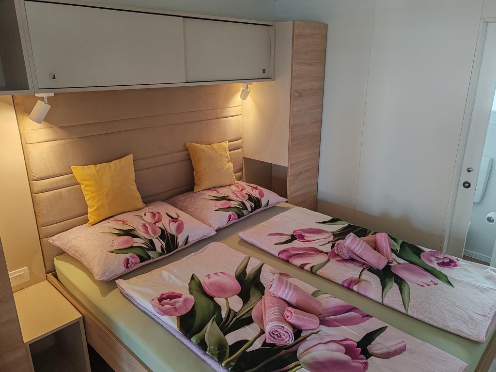 Ein voll ausgestattetes und modernes Mobilheim in bester Lage auf einem bekannten und gut ausgestatteten Campingplatz mit vielen Annehmlichkeiten, besonders für Familien mit Kindern. Das 32 m² große Haus verfügt über zwei Schlafzimmer, ein Wohnzimmer und eine voll ausgestattete Küche mit Geschirrspüler, Mikrowelle, Toaster, Dolce Gusto Kaffeemaschine und Wasserkocher. Es gibt außerdem zwei Badezimmer mit Dusche. Ein Schlafzimmer ist mit einem Doppelbett (160 × 200 cm) und einem eigenen Bad ausgestattet. Das zweite Schlafzimmer bietet zwei Einzelbetten (80 × 200 cm). Im Wohnzimmer befindet sich ein ausziehbares Schlafsofa für zwei Personen. Die 29 m² große Terrasse ist mit einem beheizten Whirlpool und Sitzgelegenheiten ausgestattet. Die Unterkunft ist komplett ausgestattet mit allem, was Sie benötigen (Bettwäsche, Handtücher, Toilettenartikel etc.). Ein Gasgrill steht Ihnen ebenfalls zur Verfügung. Ein Schwimmbadkomplex ist nur 100 m entfernt, der Strand ca. 250 m. Das Zentrum von Selc ist nur 13 Gehminuten entfernt. Kostenlose Privatparkplätze und Internet mit Smart-TV (Netflix, YouTube usw.).