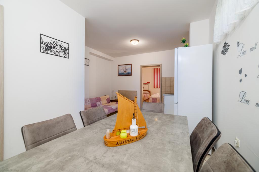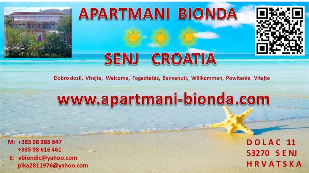 Die neu erbauten und modern ausgestatteten BIONDA Apartments befinden sich in einem ruhigen Teil von Senj. Sie liegen in einem separaten Gebäude, einem freistehenden Haus. Jedes Apartment verfügt über einen eigenen Eingang, einen Balkon oder eine Terrasse mit Tisch und Stühlen, Sat-TV, WLAN, Minibar, Klimaanlage, elektrische Heizpaneele und einen Parkplatz. In unmittelbarer Nähe von Senj befinden sich der Nationalpark Plitvicer Seen, der Velebit-Nationalpark, der Naturpark Zavratnica sowie die Inseln Goli, Grgur, Prvić, Krk und Rab. Die Apartments werden ganzjährig vermietet.