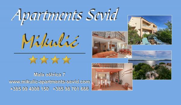 Sevid na moru, versteckt genug vor der Menge der Stadt, aber nah genug, um alles zu sehen. Eine sonnige und versteckte Ecke unberührter Natur, ideal für einen echten Mittelmeerurlaub. Obwohl Sevid klein ist, bietet es alles, was Sie brauchen: Geschäfte, Restaurants, Cafés, klares Meer und wunderschöne Strände. Ideal für Familien mit Kindern an heißen Sommertagen, aber auch im Winter. Die Apartments Mikulić befinden sich auf der Ostseite der Halbinsel Sevid, 20 Meter vom Meer entfernt, mit einem wunderschönen Blick auf das Meer, die umliegenden Inseln und einen Garten voller Grün. Die Apartments verfügen über 4 Sterne und können als echte Luxus-Ferienvilla bezeichnet werden. Den Gästen stehen ein Garten mit Grill, ein mediterraner Garten, Parkplätze und ein Strand mit Bootsanlegestelle zur Verfügung. Der Sandstrand liegt ganz in der Nähe des Hauses. Wir bieten die Möglichkeit, mit der Wohnung ein Boot zu mieten (Schnellboot oder kleines Boot). Wir bieten auch Tretboote, Jetskis, Sup-Boards und Fahrräder zum Verleih an. Willkommen!!!