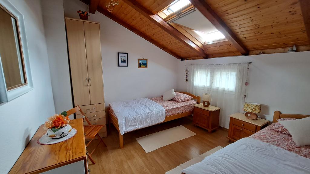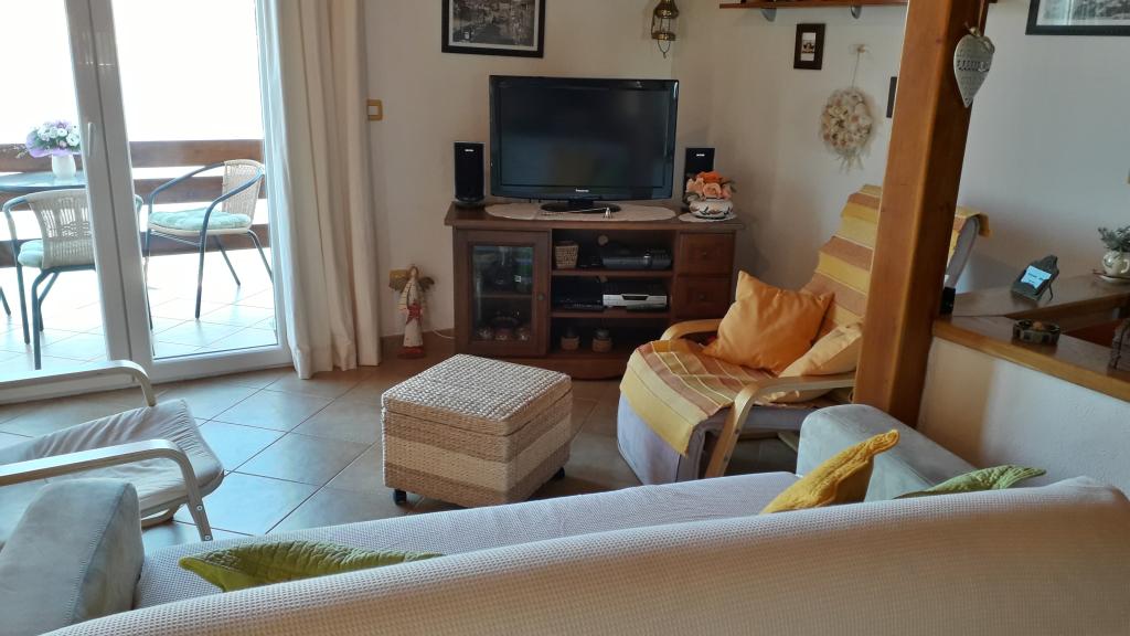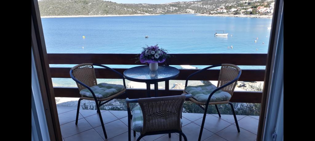 Geräumige Zweizimmerwohnung im 1. Stock mit großem Wohnzimmer und Balkon mit Meerblick (10 m entfernt) und Blick auf die gesamte Bucht. Sie befindet sich mitten im Ort, einer Oase der Ruhe und Entspannung für Familien. Restaurant, Café und Supermarkt sind in unmittelbarer Nähe. Für einen angenehmen Aufenthalt stehen Ihnen Klimaanlage, WLAN und Sat-TV zur Verfügung. Direkt vor der Wohnung befindet sich ein betonierter Strand mit kristallklarem Wasser, Sonnenschirmen und Liegestühlen, ein Kieselstrand ist 150 m entfernt.