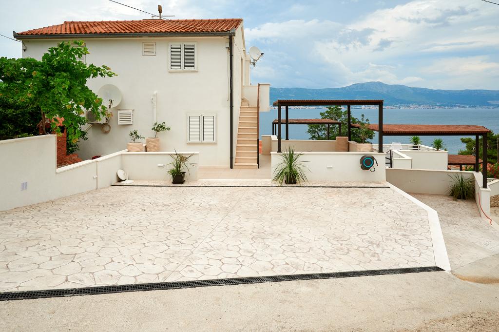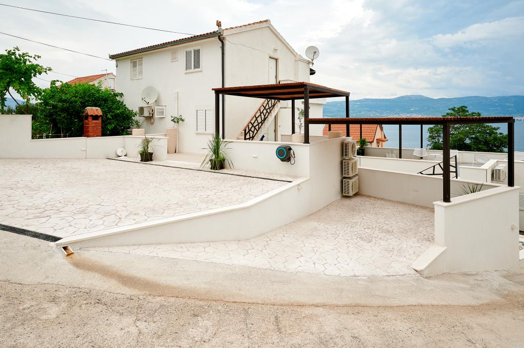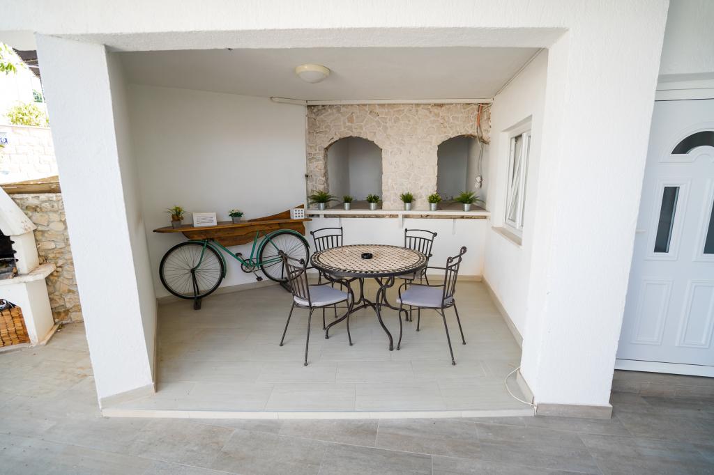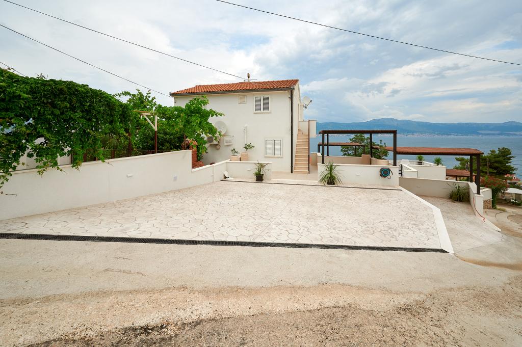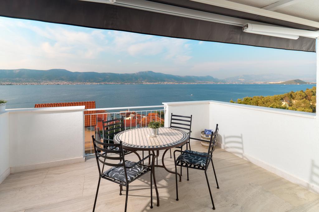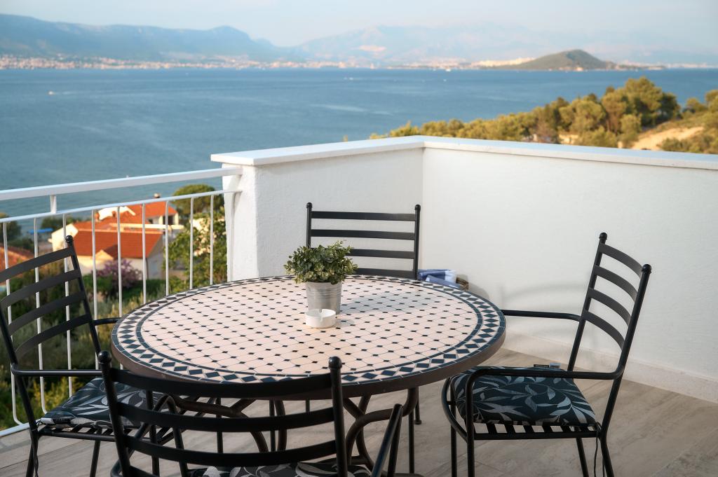 Hallo! Mein Name ist Sandra und ich möchte die Unterkunft von Andrea loben. Das Appartment ist zwar schon etwas älter, dennoch hat es (meinen Bekannten & mir) gut gefallen. Es ist liebevoll eingerichtet und sauber. Die Terrasse bietet einen wunderschönen Meerblick und die Grillen/Vögeln sangen täglich für uns. Ebenso ein Salamander hat dort sein Heim, somit fühlten wir uns jederzeit naturverbunden, ein lauschiges Platzerl :-) Der Bäcker hält jeden Tag vor der Türe somit ist für das Frühstück gut gesorgt. Der nächste \"Tommy\" ist in ca. 1,5 km Entfernung. Zum Strand geht man 5 min. und hat dort eine private Atmosphäre (wir waren vom 28.7-8.08.2015, also in der Vorsaison dort). Das Wasser ist glasklar und man hat gute Möglichkeiten hineinzugehen, da es flach ist. Eine Brause mit Wasser befindet sich ebenfalls dort. Man findet Beton, groben und feinen Kies vor und genug Schattenmöglichkeiten. Andrea ist eine wundervolle, herzliche, bemühte Gastgeberin, die jederzeit für uns erreichbar war & super freundlich ist. Bei der Ankunft fanden wir Buspläne, Tipps für Ausflugsmöglichkeiten und einen gekühlten Saft im Kühlschrank vor. WLAN funktioniert einwandfrei. Nach Trogir oder Slatine sind es jeweils 8 km. Wir wünschen Andrea alles Gute und freuen uns schon auf unseren nächsten Urlaub bei ihr. Danke für alles Andrea, wir hatten eine wundervolle Zeit bei/mit dir. Sandra & Ivan