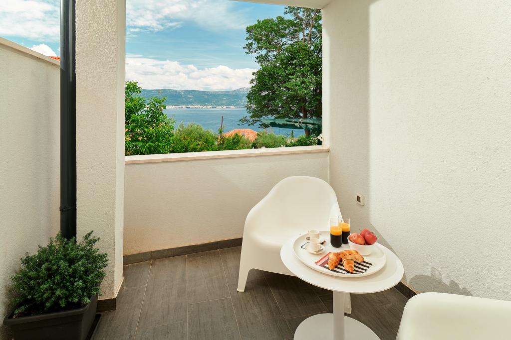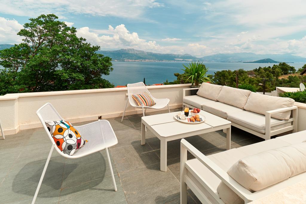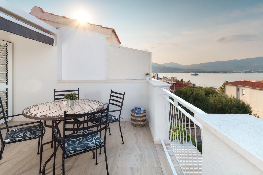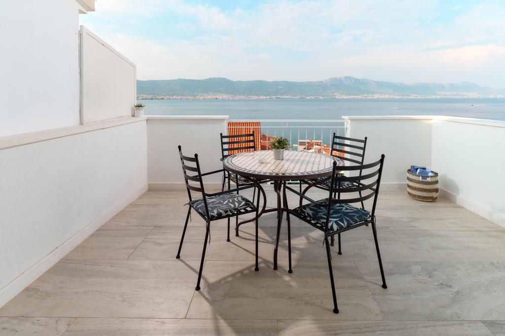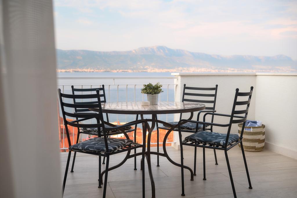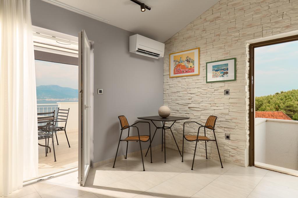 Hallo! Mein Name ist Sandra und ich möchte die Unterkunft von Andrea loben. Das Appartment ist zwar schon etwas älter, dennoch hat es (meinen Bekannten & mir) gut gefallen. Es ist liebevoll eingerichtet und sauber. Die Terrasse bietet einen wunderschönen Meerblick und die Grillen/Vögeln sangen täglich für uns. Ebenso ein Salamander hat dort sein Heim, somit fühlten wir uns jederzeit naturverbunden, ein lauschiges Platzerl :-) Der Bäcker hält jeden Tag vor der Türe somit ist für das Frühstück gut gesorgt. Der nächste \"Tommy\" ist in ca. 1,5 km Entfernung. Zum Strand geht man 5 min. und hat dort eine private Atmosphäre (wir waren vom 28.7-8.08.2015, also in der Vorsaison dort). Das Wasser ist glasklar und man hat gute Möglichkeiten hineinzugehen, da es flach ist. Eine Brause mit Wasser befindet sich ebenfalls dort. Man findet Beton, groben und feinen Kies vor und genug Schattenmöglichkeiten. Andrea ist eine wundervolle, herzliche, bemühte Gastgeberin, die jederzeit für uns erreichbar war & super freundlich ist. Bei der Ankunft fanden wir Buspläne, Tipps für Ausflugsmöglichkeiten und einen gekühlten Saft im Kühlschrank vor. WLAN funktioniert einwandfrei. Nach Trogir oder Slatine sind es jeweils 8 km. Wir wünschen Andrea alles Gute und freuen uns schon auf unseren nächsten Urlaub bei ihr. Danke für alles Andrea, wir hatten eine wundervolle Zeit bei/mit dir. Sandra & Ivan