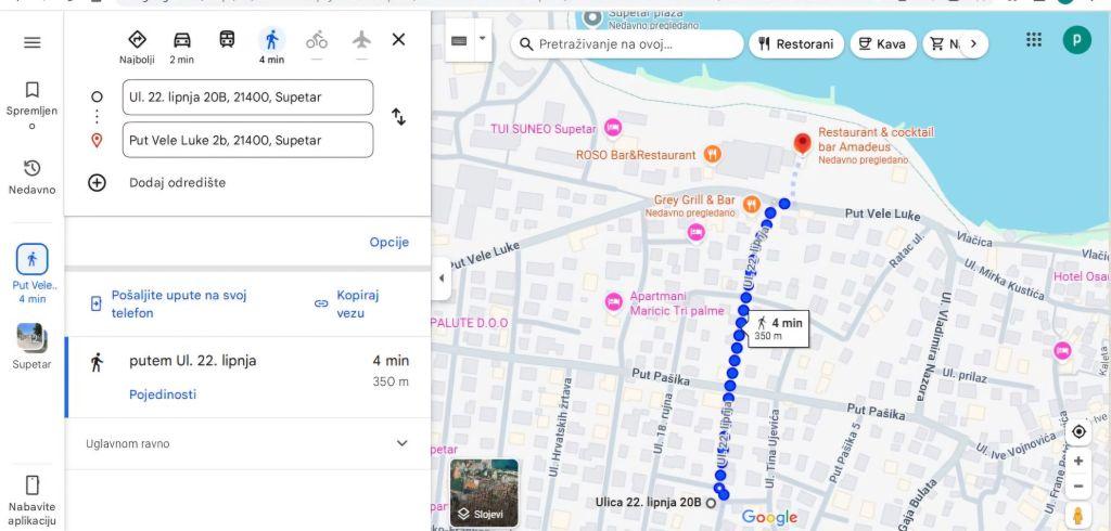 Das Apartment Lukić befindet sich in Supetar auf der Insel Brač, in einer äußerst attraktiven und dennoch ruhigen Lage für Ihren wohlverdienten Urlaub. Die Wohnung selbst liegt in der Nähe der Uferpromenade und verschiedener Strände, die Supetar hat. Der nächste Strand ist nur ca. 250 m, Geschäft 400 m. Die Anlage verfügt im Erdgeschoss über eine große Wohnung für 8 bis 10 Personen. Die Wohnung ist klimatisiert, verfügt über eine Küche, Esszimmer, Badezimmer, 2 Toiletten, 4 Schlafzimmer, Terrasse, TV und kostenfreies WLAN. Es gibt auch einen Grill in der Wohnung.
