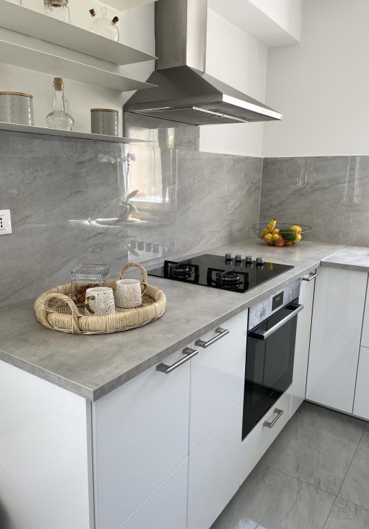 Voll ausgestattetes Apartment in einer ruhigen Gegend, 50 m vom Meer und Strand und der ersten Café-Bar entfernt. 5 Gehminuten ins Zentrum.