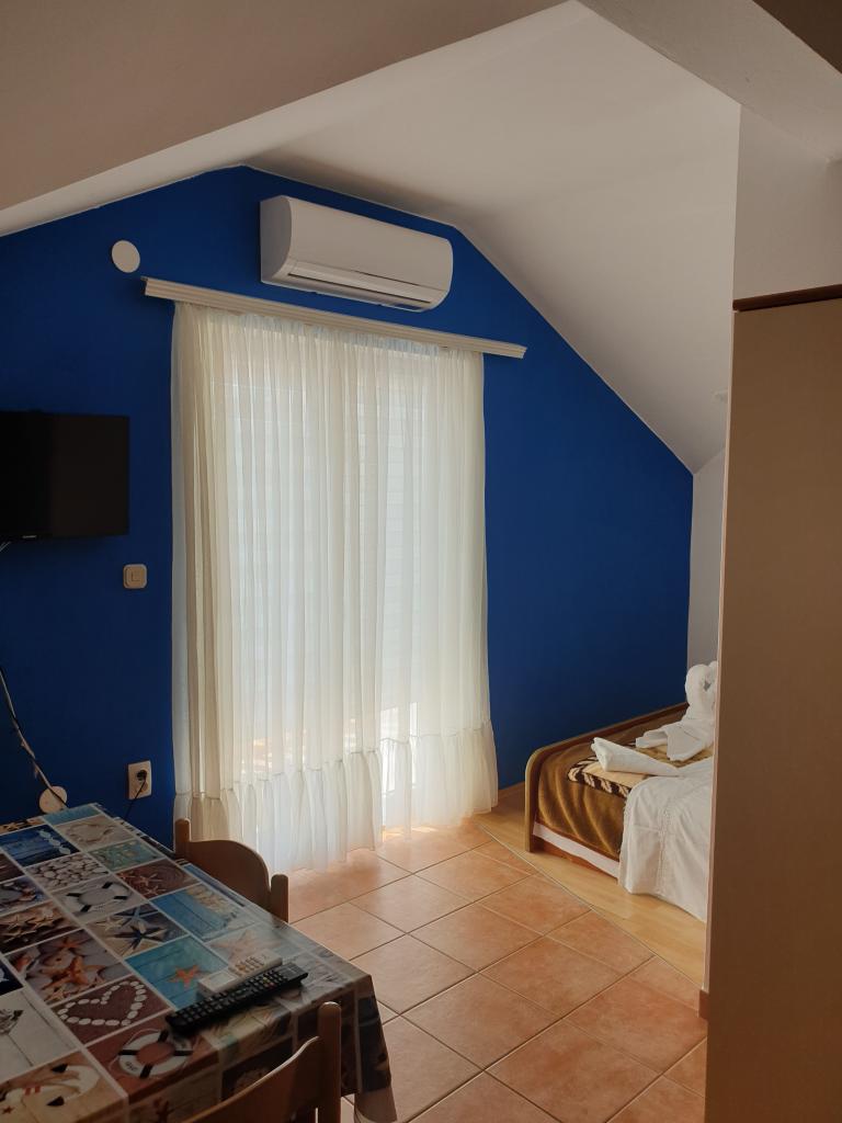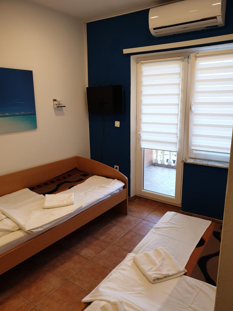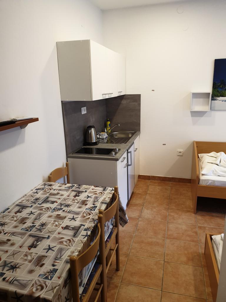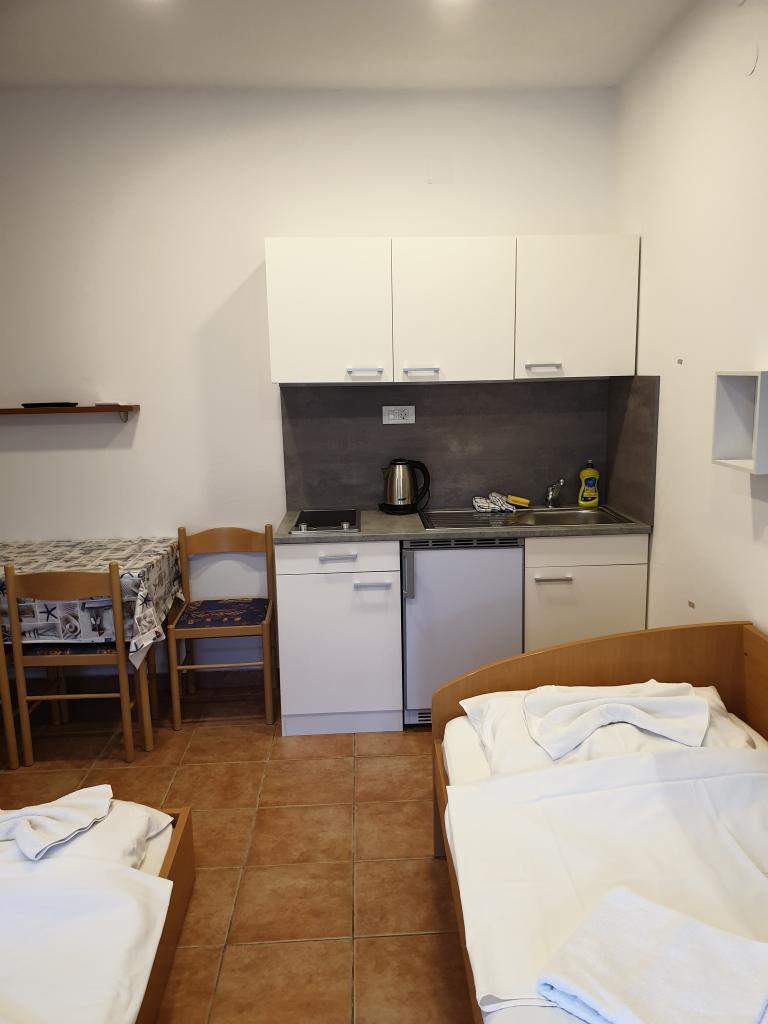 Es gibt drei Parkplätze im Hof des Hauses. Hinter dem Haus gibt es einen Grill und Backofen zur Mitbenutzung, sowie eine Schaukel für Kinder. Im Erdgeschoss des Hauses befinden sich drei Wohneinheiten. Jede Wohnung hat einen eigenen Eingang und Schlüssel von der gleichen Eingangshalle. Jedes Apartment verfügt über eine Küche mit zwei Elektroherden, ein Badezimmer mit Dusche, einen Tisch und Stühle zum Essen, einen Fernseher mit Satellitenempfang und lokalen Programmen sowie eine Klimaanlage. In Wohnung 1 ist das Doppelbett 180 cm breit, in den anderen Wohnungen 160 cm breit. Alle Wohnungen verfügen über Kühlschränke mit einem Gefrierfach von bis zu 10 Litern. Wohnung 1 hat einen Teil der Eingangsterrasse mit einer Pergola, die einen herrlichen Blick auf Ravne kotare und Velebit bietet. In Wohnung 2 (Studio 2+2) ist das Doppelbett so platziert, dass die Kinder es vom Etagenbett aus nicht sehen können und jeder den Fernseher an der Wand sehen kann. Es hat einen Balkon 6 m x 1,2 m. Wohnung 3 hat ein separates Zimmer mit zwei weiteren Betten im Esszimmer, und es gibt auch eine Loggia, wo Sie essen können.
