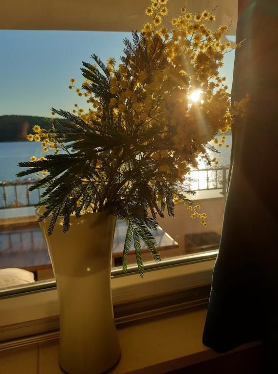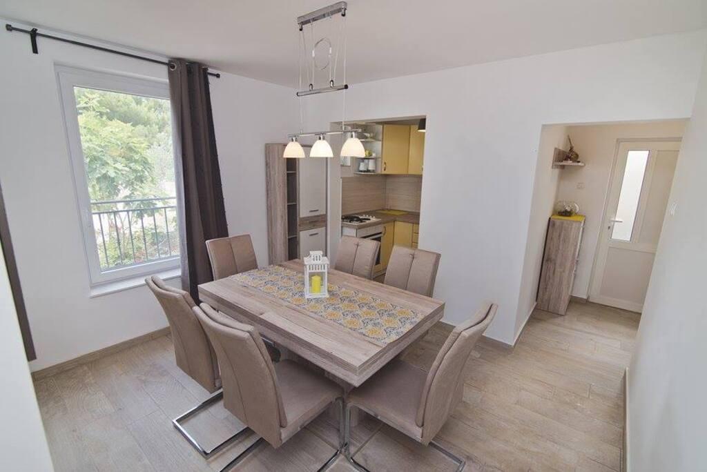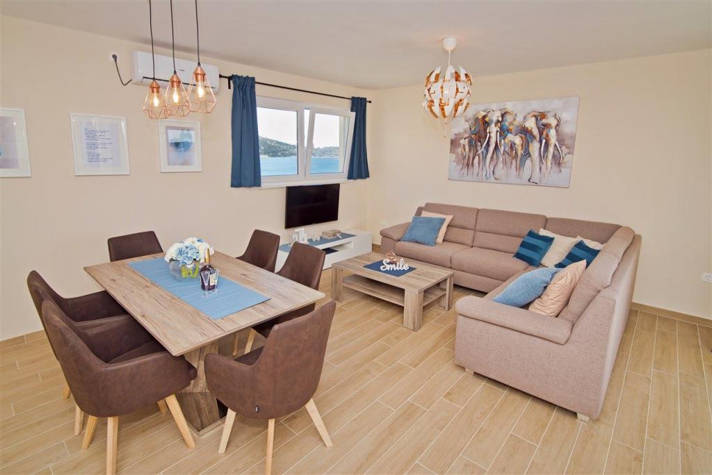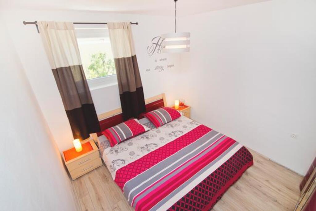 Wir befinden uns auf der Festlandseite der Brücke, direkt neben dem Strand von Jazine. Unsere Anlage verfügt über 2 Apartments mit jeweils 3 Schlafzimmern, komplett ausgestattet und mit herrlichem Blick auf das Meer. Sie enthalten alle notwendigen Geräte sowie Bettwäsche und Handtücher. Die Apartments sind klimatisiert, verfügen über kostenfreie Parkplätze und WLAN. Zusätzlich zur Wohnung besteht die Möglichkeit, ohne zusätzliche Gebühr einen Liegeplatz für ein Boot an einer Boje zu sichern. Vor der Wohnung gibt es einen kleinen Uferbereich zum Schwimmen, der für kleinere Kinder geeignet ist, während der Hauptstrand von Jazine ein kleiner Strand ist 5 Gehminuten entfernt. Die Wohnungen liegen in einer ruhigen Gegend, ohne Lärm und eignen sich für einen Familienurlaub.
