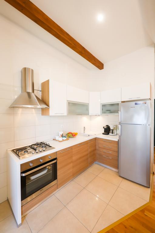 Die Ferienwohnung befindet sich in erster Reihe direkt am Meer in der Altstadt von Tisno. Sie ist komplett neu renoviert und ausgestattet und bietet einen wunderschönen Blick auf das Meer, den Ort, die vorgelagerten Inseln und die Küste. Die Wohnung verfügt über zwei Balkone, einen mit Meerblick und einen zur Rückseite des Hauses. Sie liegt im ersten Stock und bietet hervorragende Bedingungen und ein angenehmes Ambiente für einen rundum gelungenen Urlaub. Im Erdgeschoss befindet sich ein kleiner, umzäunter Hof mit Grillmöglichkeit. Vor dem Haus gibt es einen kostenlosen Parkplatz und einen Bootsanlegeplatz. Die Wohnung ist modern eingerichtet und verfügt über eine Küche mit Backofen, Herd, Kühlschrank, Geschirrspüler, Kaffeemaschine und Wasserkocher. Das Badezimmer ist mit einer Duschkabine, einer Waschmaschine und einem Haartrockner ausgestattet. Zur weiteren Ausstattung gehören Bügeleisen, Sat-TV, WLAN, Radio und eine separate Klimaanlage in jedem Zimmer.