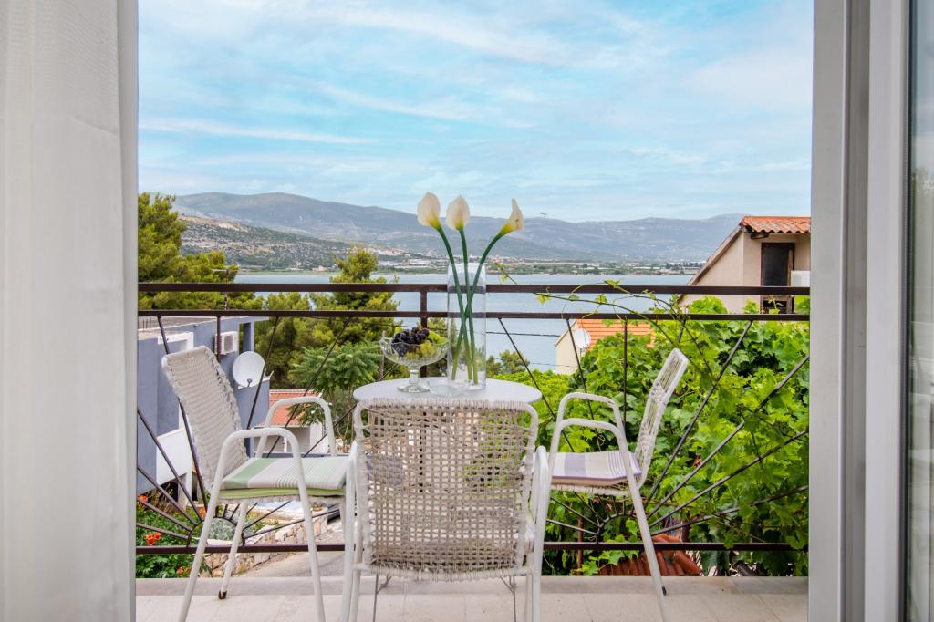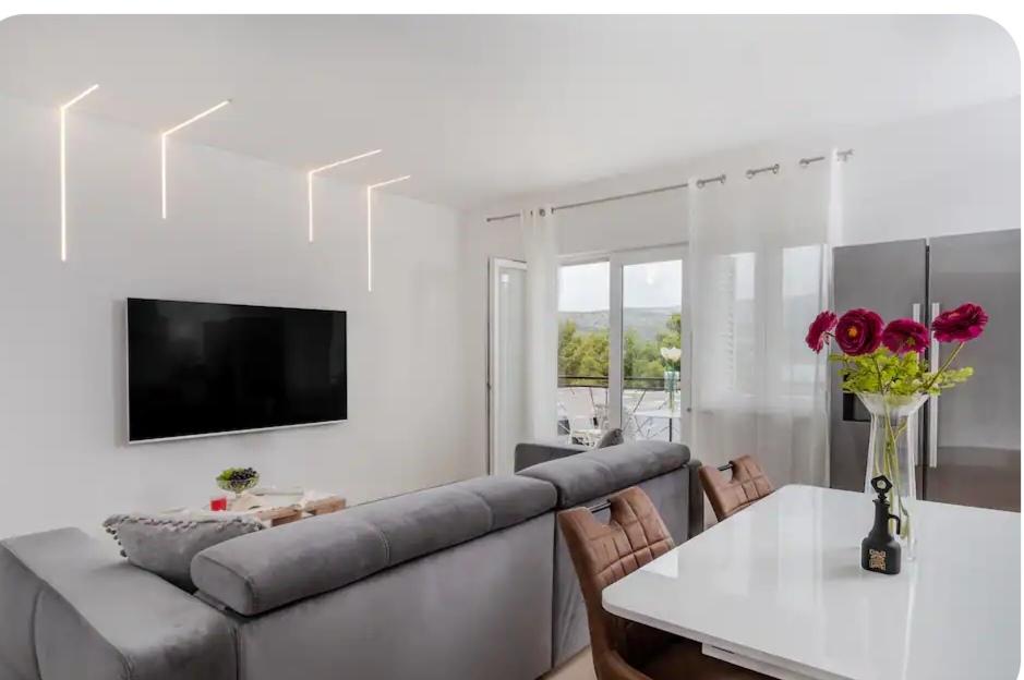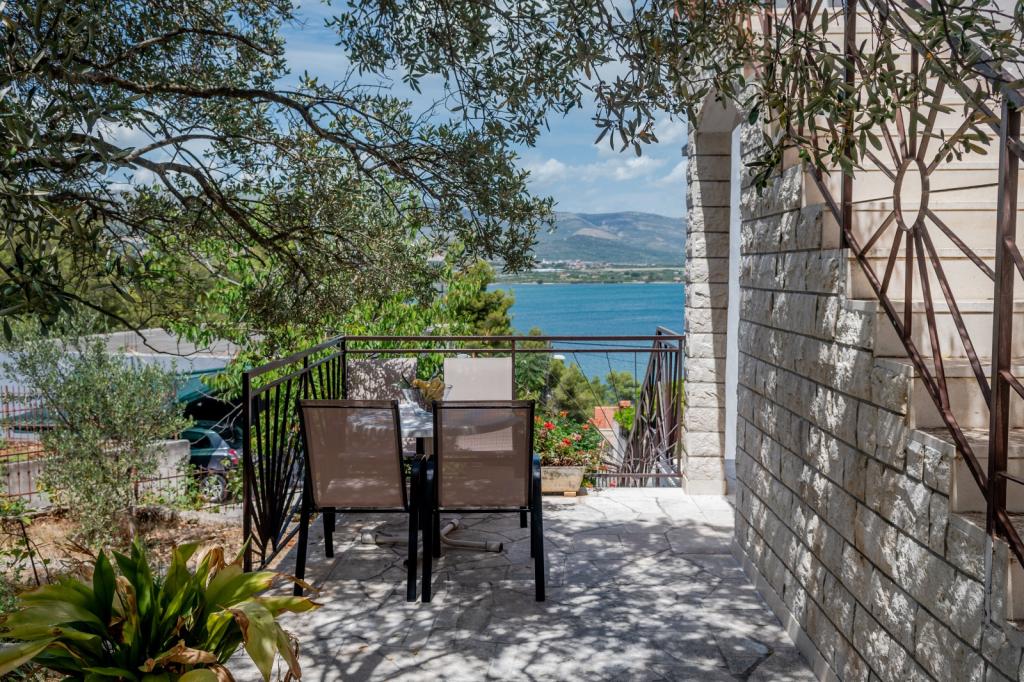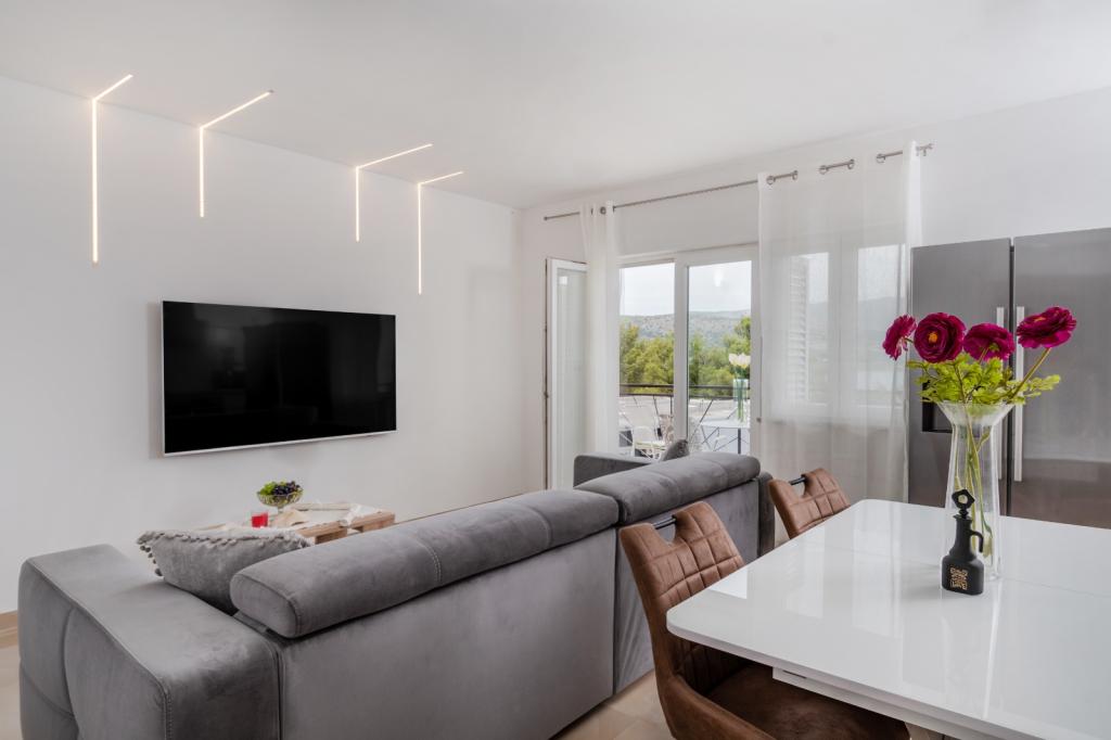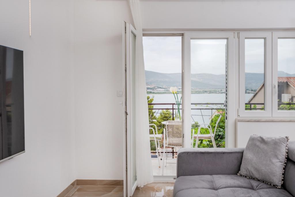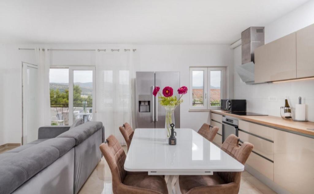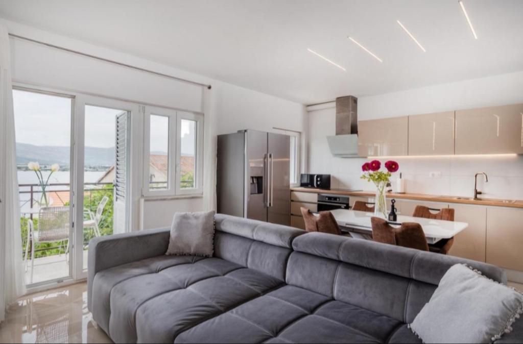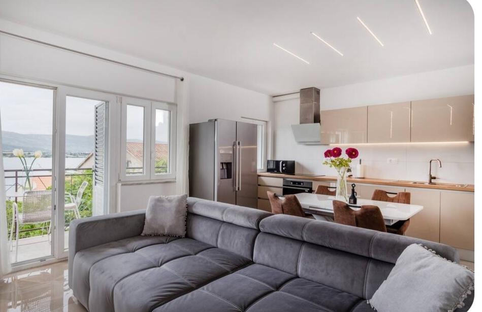 Sehr luxuriöse Wohnung 1 Minute vom Meer entfernt. Das gesamte Apartment ist mit der neuesten High-Sense-Technologie ausgestattet, wobei jedes Zimmer über eine eigene Klimaanlage, einen großen Videowandfernseher und ein separates WC verfügt, sodass jeder Gast seine eigene Privatsphäre hat. Die Küche ist mit neuen High-Sense-Geräten wie Geschirrspüler, Mikrowelle, Kaffeemaschine und Kühlschrank mit Eismaschine ausgestattet. Die Wohnung verfügt über einen schönen Garten und eine Terrasse mit Blick auf das Meer und liegt 5 Autominuten vom Flughafen Split entfernt. Ein schöner Sandstrand liegt 10 m von der Wohnung entfernt. Es befindet sich in ausgezeichneter Lage, nur 2 Minuten vom Zentrum von Trogir und 20 Autominuten vom Zentrum von Split entfernt. Nicht weit von der Wohnung entfernt befindet sich ein Taxiboot, das die Gäste ins Zentrum von Split und auf dem Seeweg bringt.