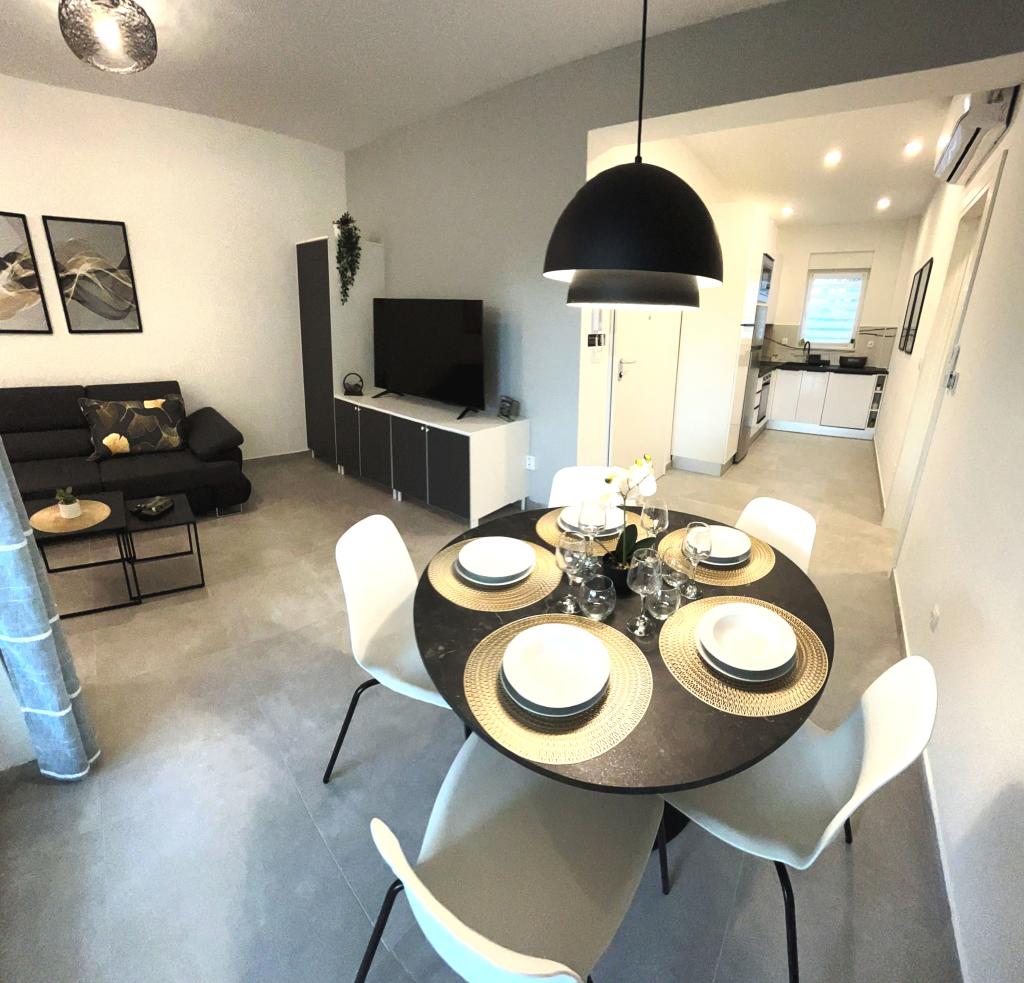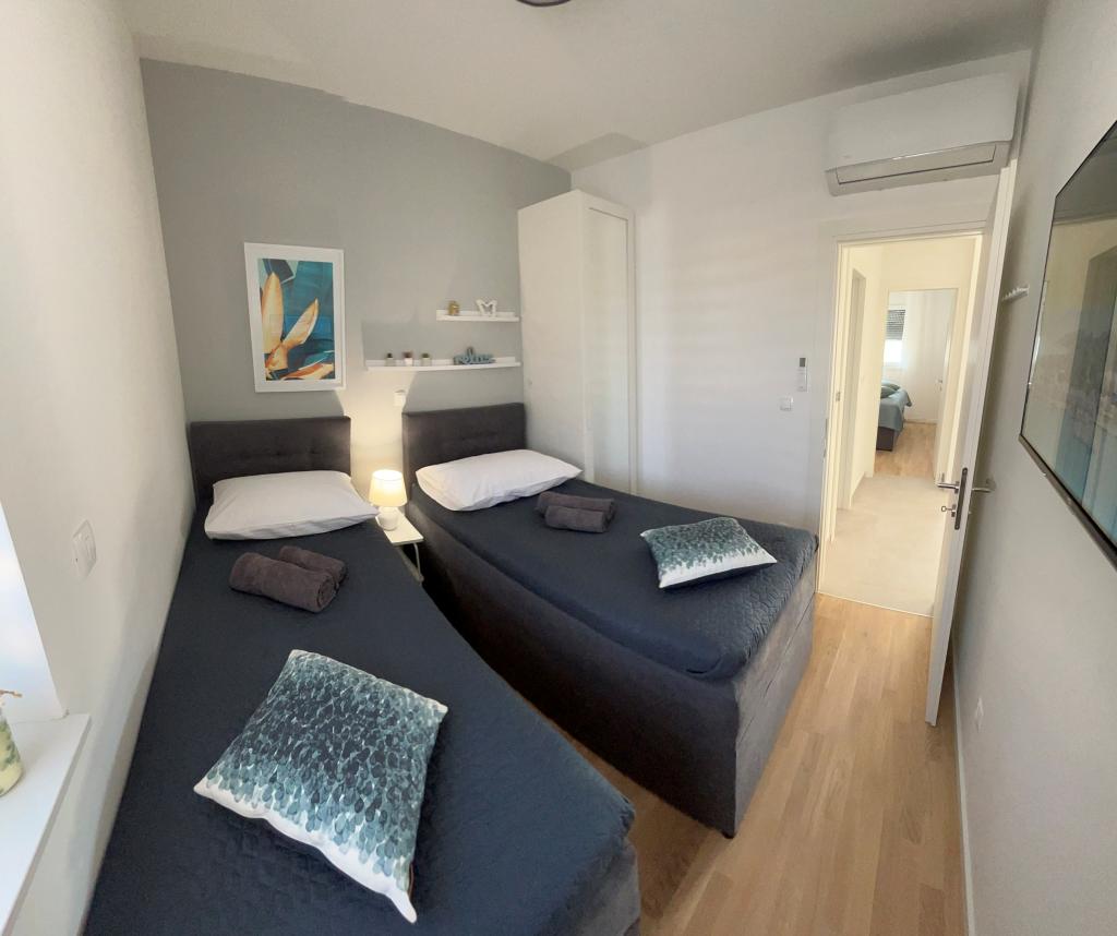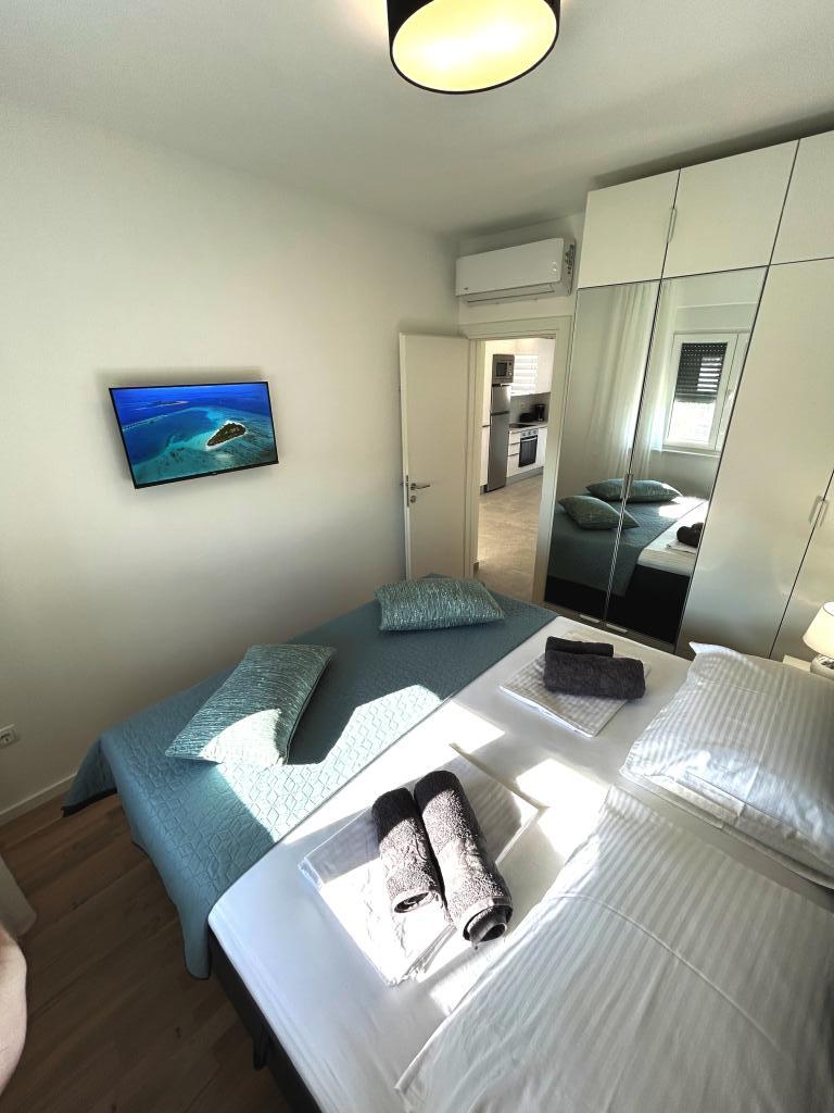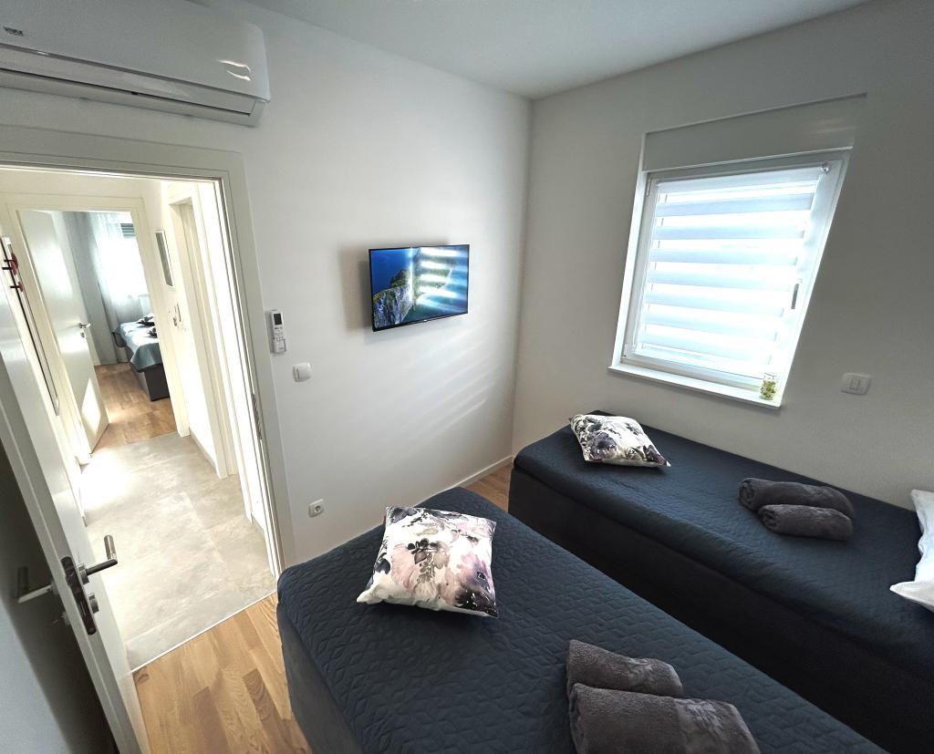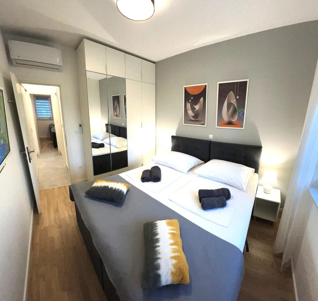 Die Town Trogir Apartments befinden sich in bester Lage auf dem Festland von Trogir, nur 400 m von der Altstadt und 1000 m vom neuen Stadtstrand entfernt. Der Strand ist über eine Strandpromenade erreichbar. Alle wichtigen Einrichtungen sind in 5 bis 10 Minuten zu Fuß erreichbar. Die Town Trogir Apartments sind neu und befinden sich in einem kleinen Wohngebäude mit insgesamt 6 Apartments. Die Apartments haben eine Fläche von ca. 60 m² und liegen im Erdgeschoss, 1. und 2. Obergeschoss. Sie sind modern eingerichtet und komplett ausgestattet. Die Apartments verfügen über 2 Schlafzimmer, ein Wohnzimmer mit Essbereich, eine voll ausgestattete Küche, ein Badezimmer und im Erdgeschoss große Terrassen mit Gartenmöbeln. Wohnzimmer und Schlafzimmer sind mit separaten Klimaanlagen ausgestattet. Kostenlose Parkplätze stehen vor dem Gebäude zur Verfügung. Bettwäsche und Handtücher sind inklusive. WLAN ist kostenlos. Die Kurtaxe ist im Preis enthalten.