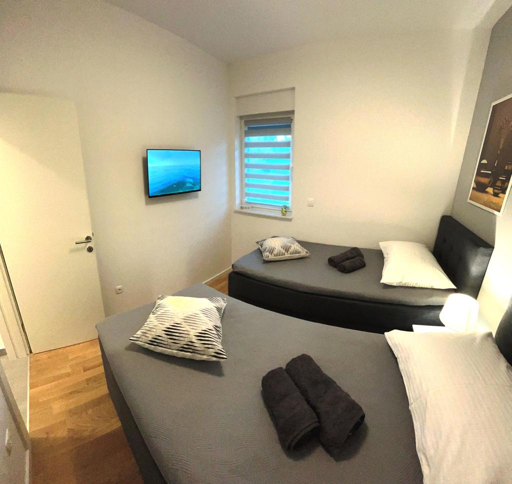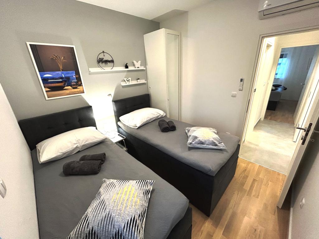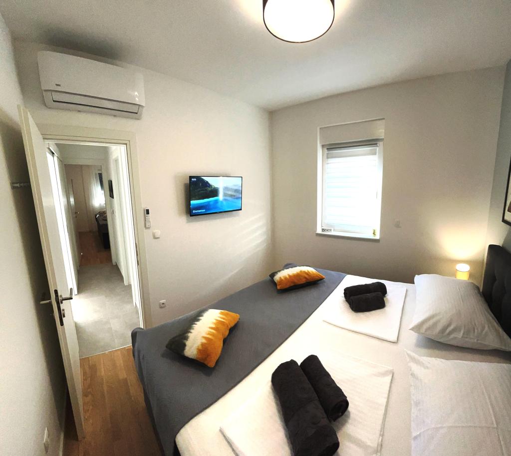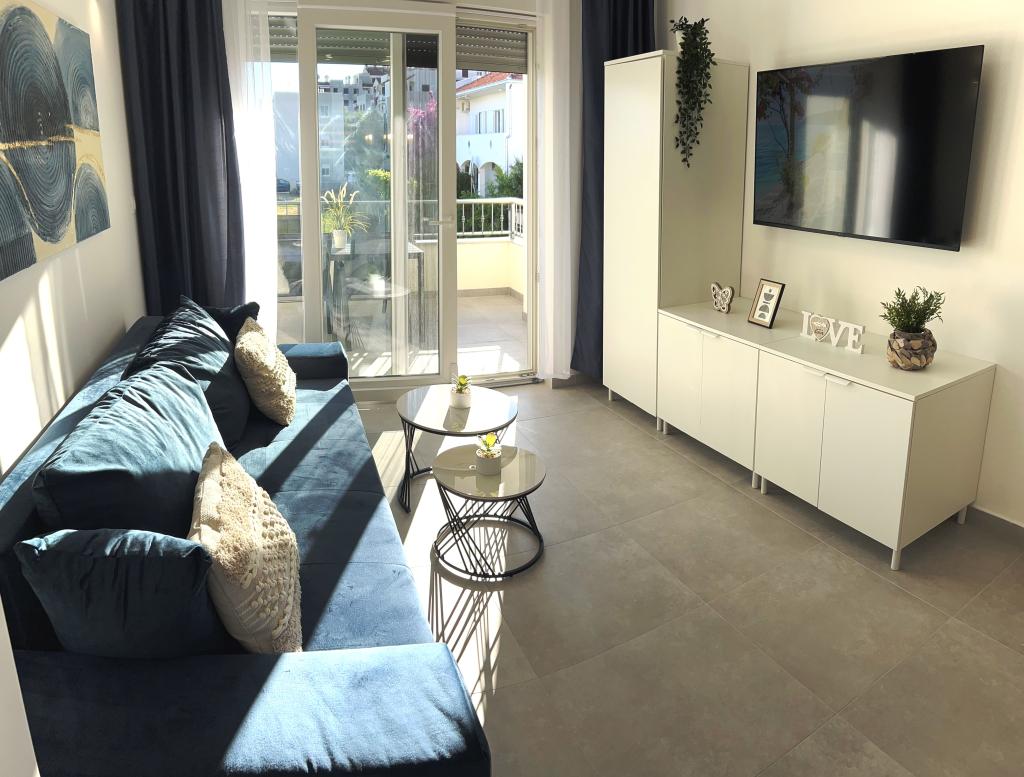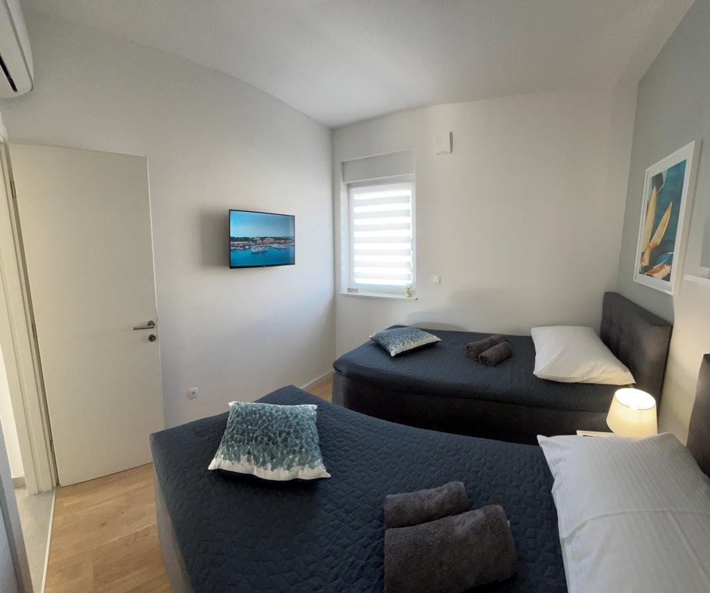 Die Town Trogir Apartments befinden sich in bester Lage auf dem Festland von Trogir, nur 400 m von der Altstadt und 1000 m vom neuen Stadtstrand entfernt. Der Strand ist über eine Strandpromenade erreichbar. Alle wichtigen Einrichtungen sind in 5 bis 10 Minuten zu Fuß erreichbar. Die Town Trogir Apartments sind neu und befinden sich in einem kleinen Wohngebäude mit insgesamt 6 Apartments. Die Apartments haben eine Fläche von ca. 60 m² und liegen im Erdgeschoss, 1. und 2. Obergeschoss. Sie sind modern eingerichtet und komplett ausgestattet. Die Apartments verfügen über 2 Schlafzimmer, ein Wohnzimmer mit Essbereich, eine voll ausgestattete Küche, ein Badezimmer und im Erdgeschoss große Terrassen mit Gartenmöbeln. Wohnzimmer und Schlafzimmer sind mit separaten Klimaanlagen ausgestattet. Kostenlose Parkplätze stehen vor dem Gebäude zur Verfügung. Bettwäsche und Handtücher sind inklusive. WLAN ist kostenlos. Die Kurtaxe ist im Preis enthalten.