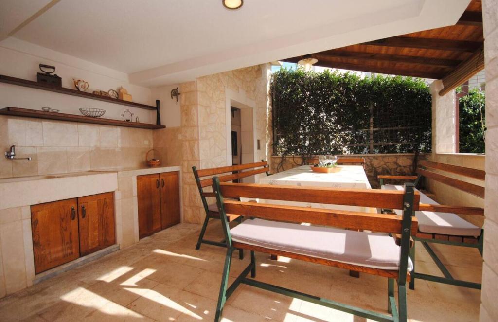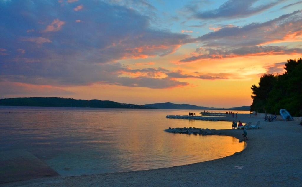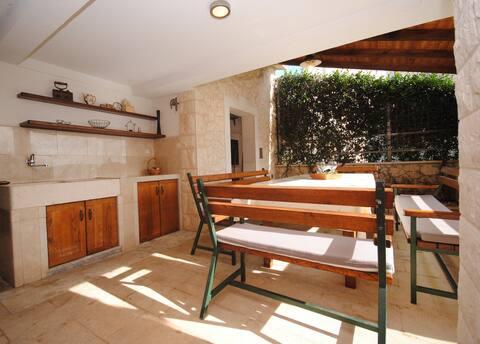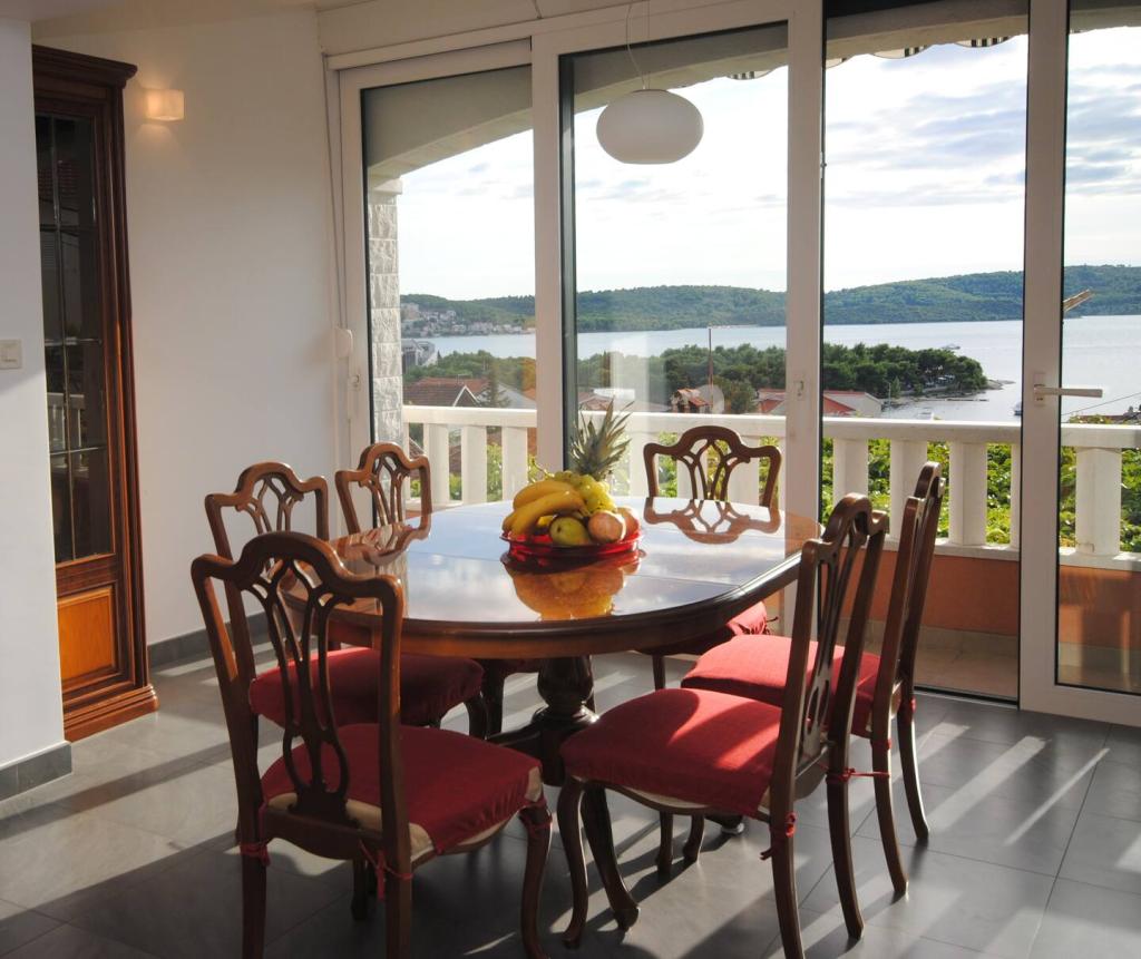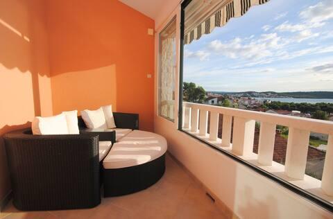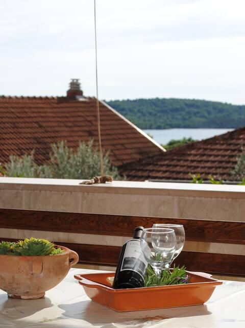Das Luxusapartment mit Terrasse „Lucy“ und Blick auf das Meer liegt auf der Insel Čiovo in einer ruhigen Gegend, nur 10 Minuten von der historischen Altstadt von Trogir entfernt. Die Wohnung befindet sich im 1. Stock eines Einfamilienhauses. Diese Dreizimmerwohnung mit wunderschönem Blick auf das Meer ist nach höchsten Standards eingerichtet und mit allem ausgestattet, was Sie für einen angenehmen Aufenthalt benötigen. Wohnzimmer: Das geräumige Wohnzimmer ist mit Smart-TV, WLAN, bequemen Sofas und Sesseln und einer großen schönen Terrasse ausgestattet. Schlafzimmer: Es gibt Treppen, die zu 3 luxuriösen Schlafzimmern führen (Sonnenschlafzimmer (mit eigenem Bad und Terrasse), Meeresschlafzimmer und Sandschlafzimmer (mit Terrasse und Gemeinschaftsbad)). Jedes Zimmer verfügt über eine Klimaanlage, Nachttische, einen Schrank mit Bettwäsche und Handtüchern sowie ein Doppelbett (1,60 × 2). Hinter dem Haus befindet sich eine wunderschöne Vintage-Sommerküche (mit Grillplatz), die mit allem ausgestattet ist, was Sie für mediterranen Genuss benötigen.