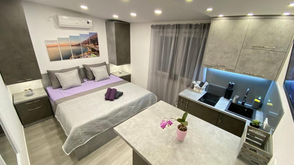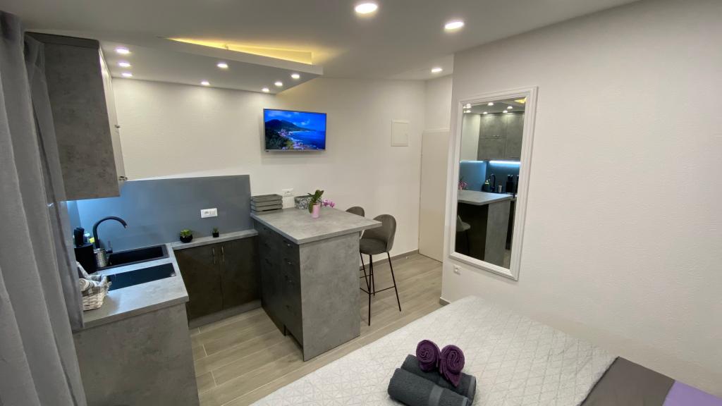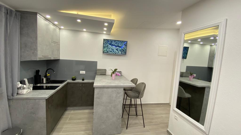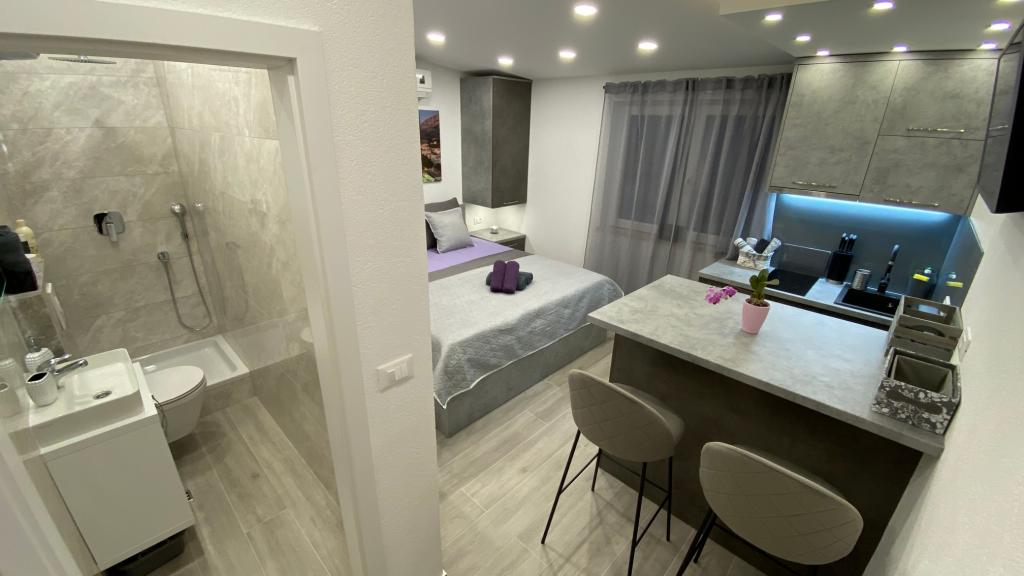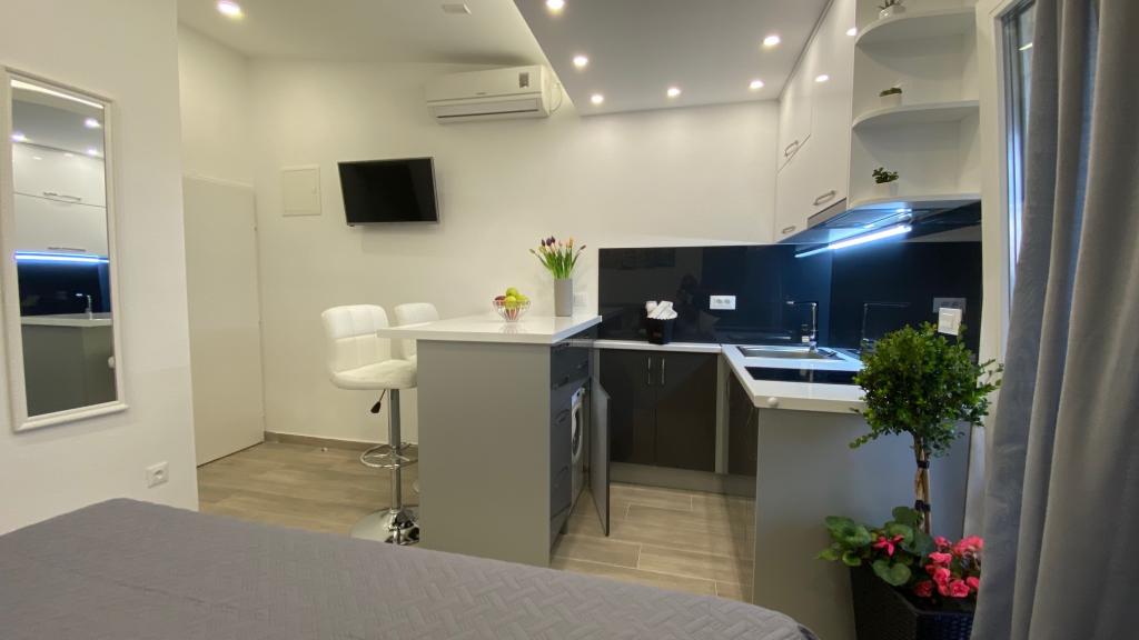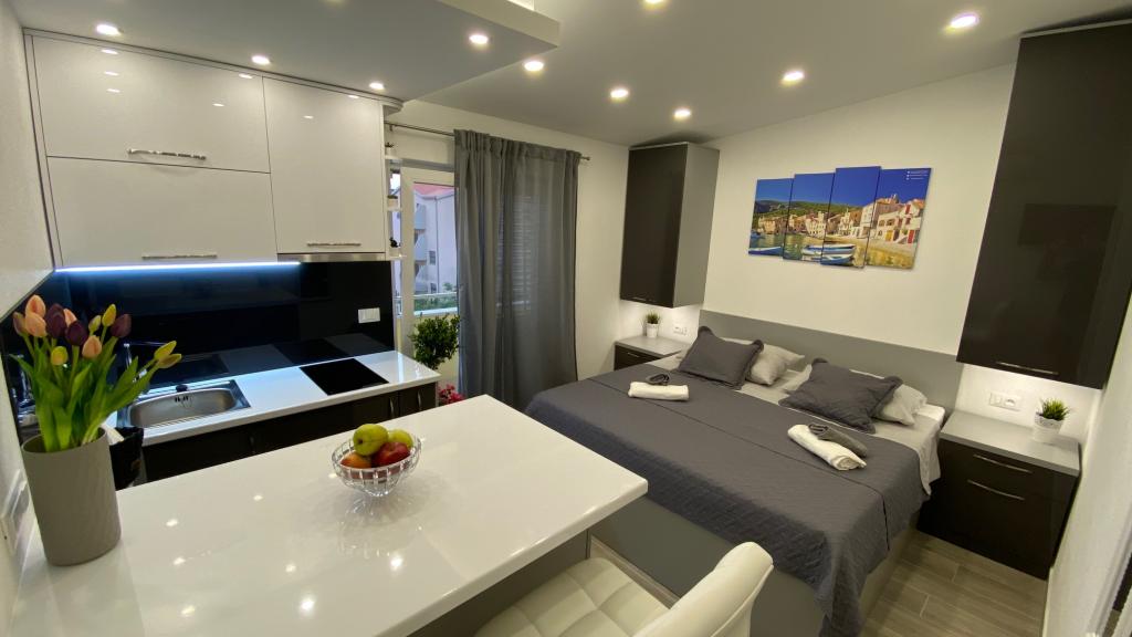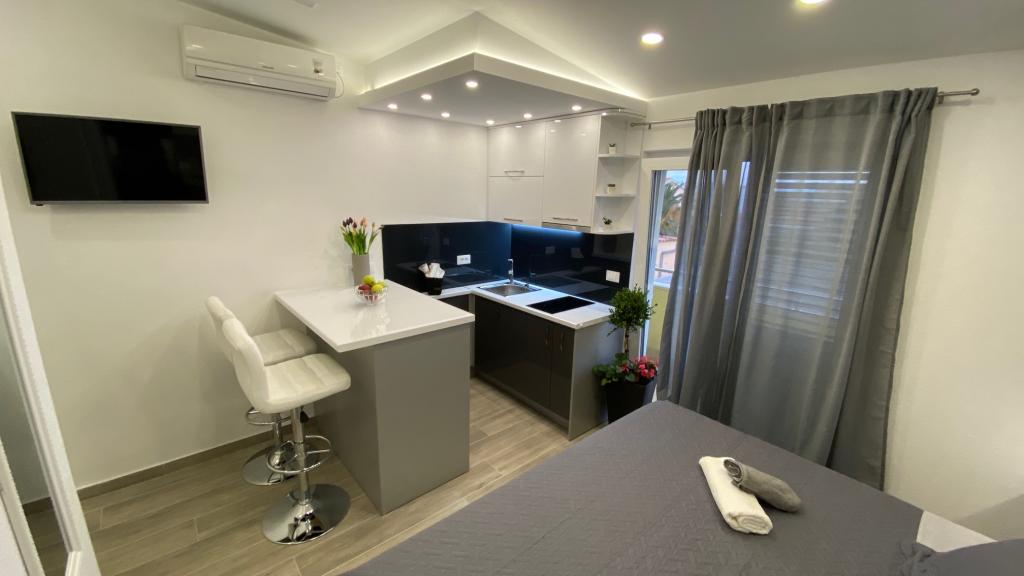 Das luxuriös ausgestattete Studio-Apartment **** für 2 Personen bietet alles, was Sie erwarten können und noch mehr. Moderne Möbel, Küche mit Bar, Barhocker, fantastische LED-Beleuchtung, alle möglichen Geräte, Smart-TV, Klimaanlage, Balkon mit Meerblick und Kinderspielplatz, alles ist sehr ordentlich und sauber. Die Gastgeber sind phänomenale Leute. Sehr nett, lächelnd, zuvorkommend. Wenn Sie zum ersten Mal dort sind, haben Sie das Gefühl, zu Ihren guten, alten Freunden gekommen zu sein. Und das Meer und der Strand ... 100 Meter von der Wohnung entfernt, sowie das Stadtzentrum mit Geschäften und Restaurants. Alles ist an Ihren Fingerspitzen und dennoch befindet sich die Unterkunft selbst in einem ruhigeren Teil der Nachbarschaft. Eine erstaunliche Kombination! Absolut alle Empfehlungen !!!