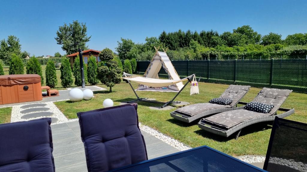 Die Nutzung des Whirlpools ist im Aufenthaltspreis inbegriffen und unterliegt keinen zusätzlichen Gebühren. Direkt am Haus befindet sich eine große Terrasse mit Grill, Sonnenliegen, Hängematte, Solardusche und großer, gepflegter Rasenfläche. Darüber hinaus besteht die Möglichkeit, Fahrräder zu mieten (gegen Gebühr), elektrische Darts zu nutzen, eine Feuerstelle im Hinterhof und andere Sportgeräte, einen Sandkasten für kleine Kinder, ein Spielzelt usw. zu nutzen. Kleine, gut erzogene Haustiere sind erlaubt, möglicherweise fällt eine zusätzliche Gebühr für die Reinigung an. Der Hof ist komplett eingezäunt.