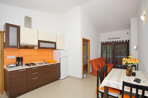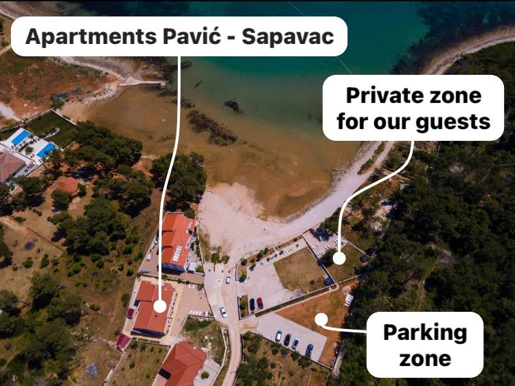 Die Apartments liegen in der ruhigen Bucht von Sapavac, direkt am Strand, umgeben von einem Pinienwald. Ideal für einen Familienurlaub, ohne Lärm. Die Apartments sind neu, modern eingerichtet, mit allen notwendigen Geräten ausgestattet und klimatisiert. Jede Wohnung verfügt über eine eigene Terrasse mit Meerblick. Im Hof gibt es einen Grill mit Grill und einen Platz zum geselligen Beisammensein, der den Gästen ohne Aufpreis zur Verfügung steht. Der Strand ist kiesig und das Meer hat sehr feinen Sand, ideal für kleine Kinder.