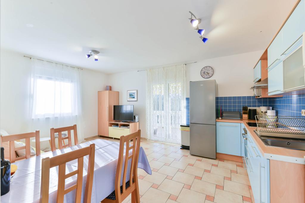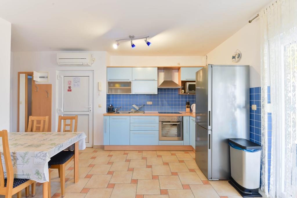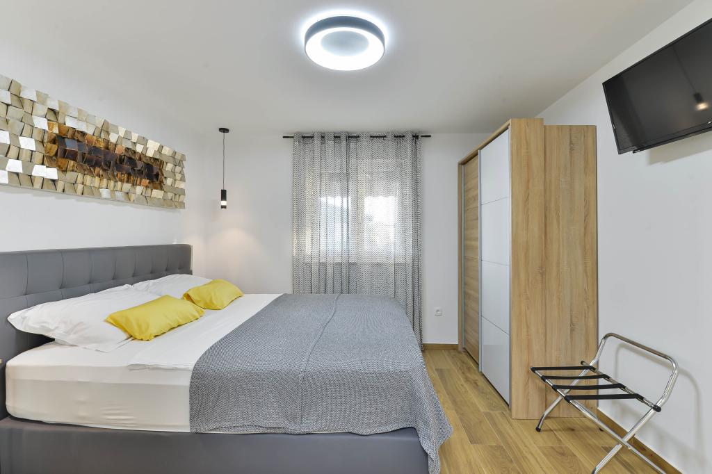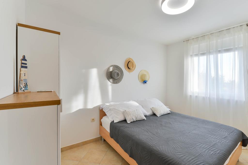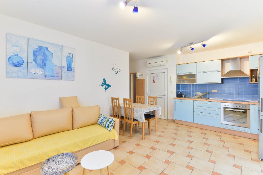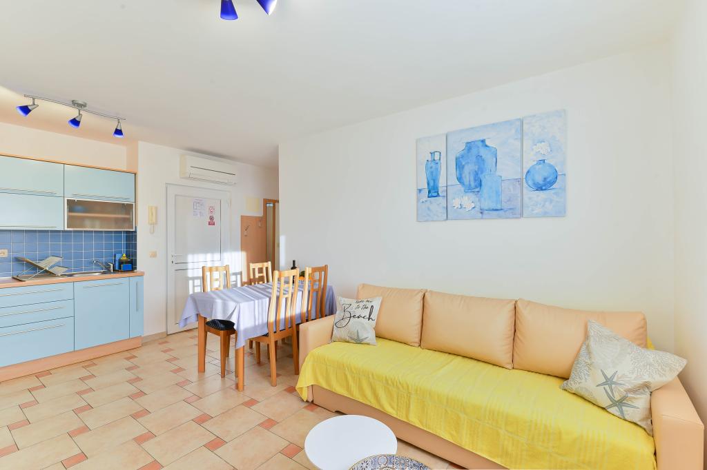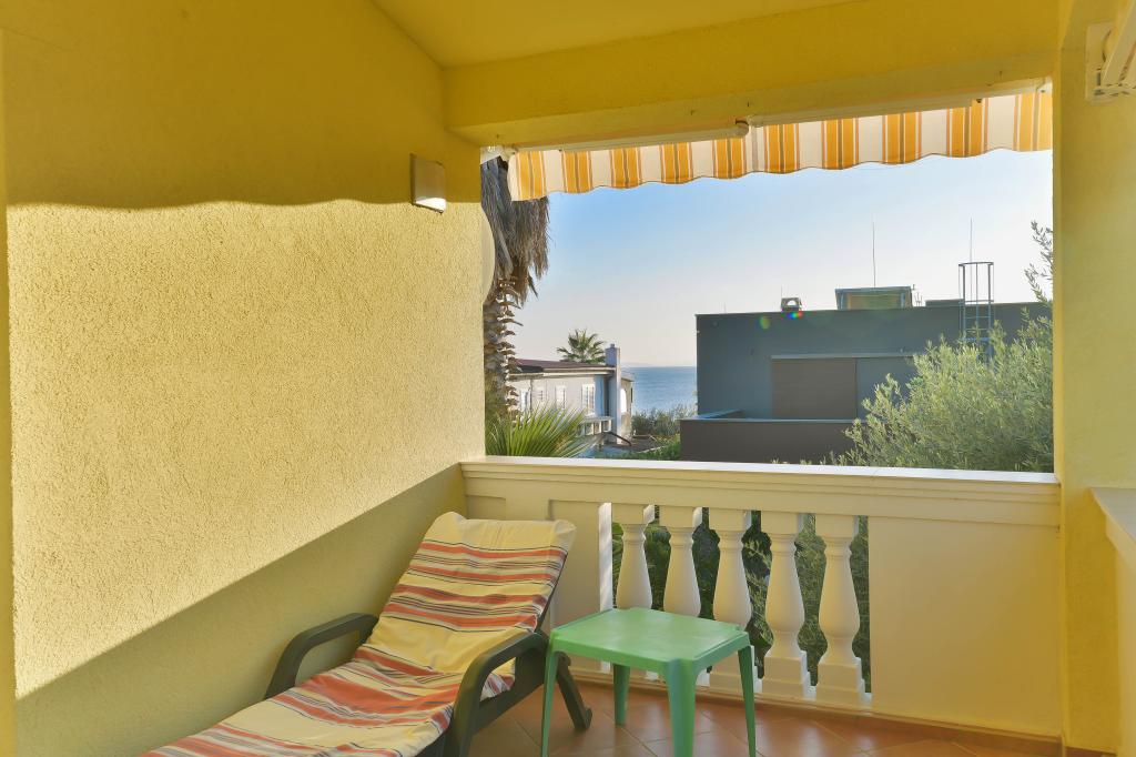 Voll ausgestattete Apartments, jedes Zimmer verfügt über eine eigene Klimaanlage und einen Fernseher und liegt 40 Meter vom Meer entfernt. Eine Bar, Restaurants und ein Supermarkt sind fußläufig erreichbar. Der Strand ist aus Kies und Beton, ein Sandstrand ist zehn Gehminuten entfernt. Das Haus verfügt über einen eigenen Parkplatz, Grill und Kinderschaukel im Garten. Den Gästen stehen Liegestühle, Sonnenschirme und Fahrräder zur Verfügung.