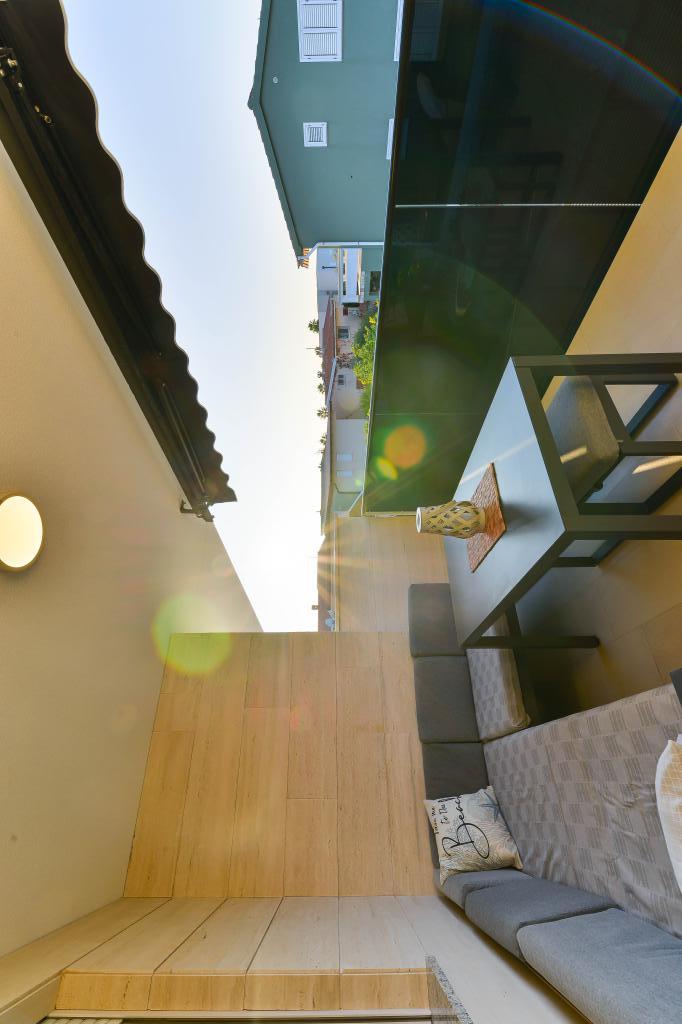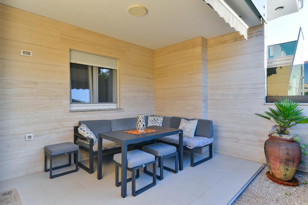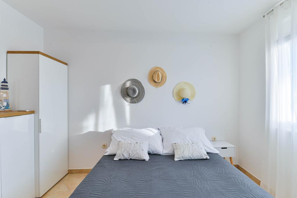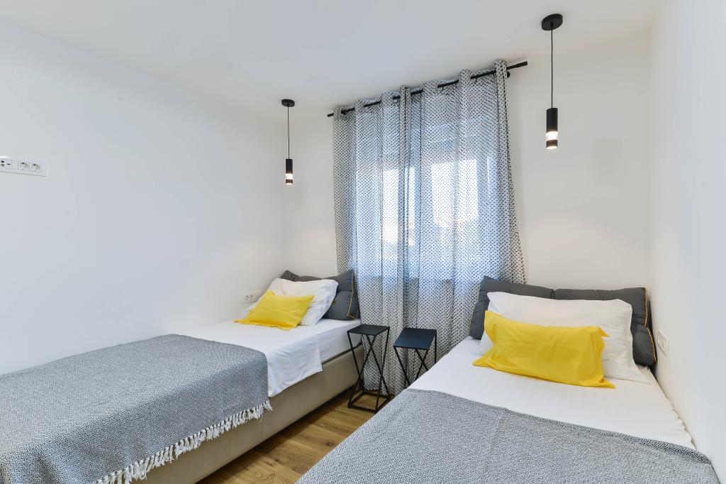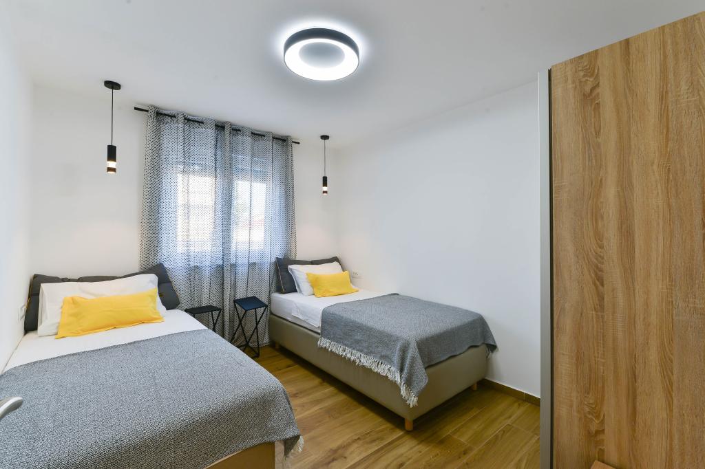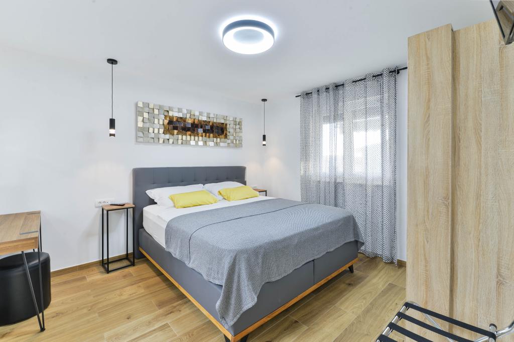 Voll ausgestattete Apartments, jedes Zimmer verfügt über eine eigene Klimaanlage und einen Fernseher und liegt 40 Meter vom Meer entfernt. Eine Bar, Restaurants und ein Supermarkt sind fußläufig erreichbar. Der Strand ist aus Kies und Beton, ein Sandstrand ist zehn Gehminuten entfernt. Das Haus verfügt über einen eigenen Parkplatz, Grill und Kinderschaukel im Garten. Den Gästen stehen Liegestühle, Sonnenschirme und Fahrräder zur Verfügung.