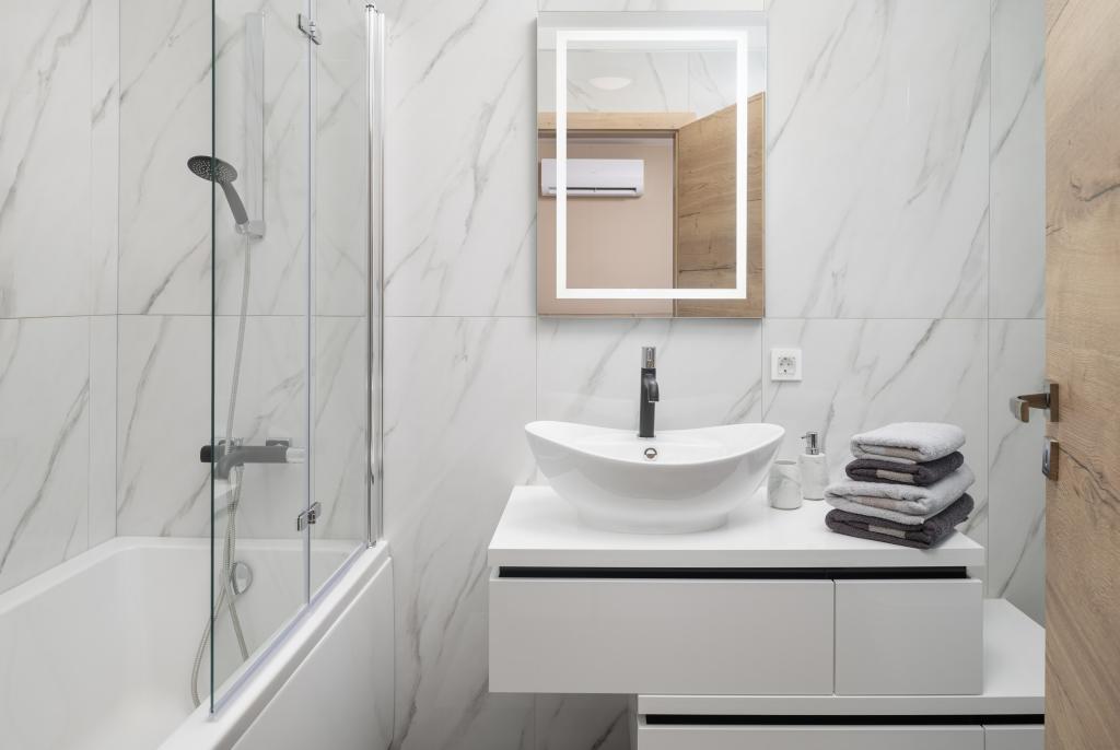 Designer-dekoriertes und komplett neu ausgestattetes 5-Sterne-Penthouse im zweiten Stock im Zentrum der Insel Vir. Das 100 m² große Penthouse ist ideal für 4-5 Personen. Es ist aufgeteilt in ein Wohnzimmer mit voll ausgestatteter Küche und Essbereich, ein separates WC, einen begehbaren Kleiderschrank, zwei klimatisierte Schlafzimmer mit Doppelbetten, ausgestattet mit Satellitenfernsehen und zwei Badezimmer (eines mit Dusche und eines mit Badewanne). Das Wohnzimmer hat ein Schlafsofa für eine Person. Die Penthouse verfügt über einen überdachten Balkon mit Elektrogrill, Tisch und Stühlen von 3 m² und teilweisem Meerblick. Zu der Penthouse gehört eine Dachterrasse (90 m²) mit Meerblick und Liegestühlen.