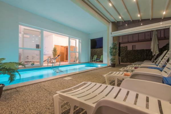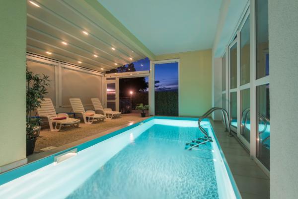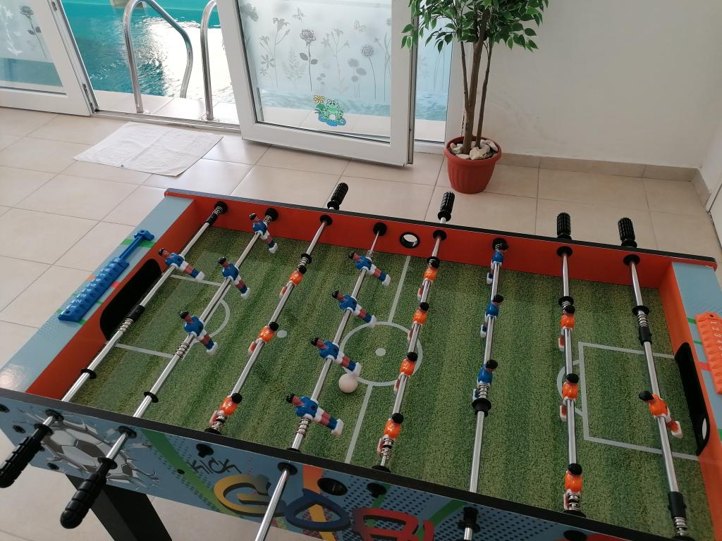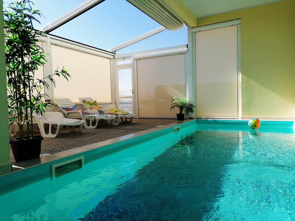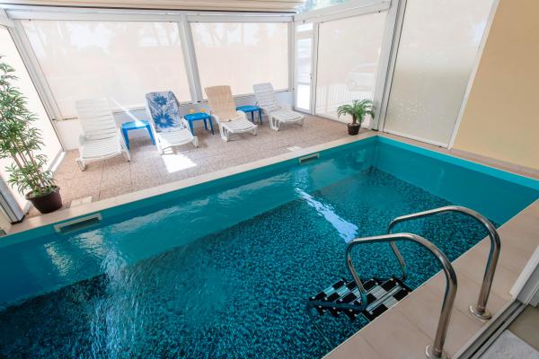 Der beheizte Pool lässt sich problemlos in ein Hallenbad umwandeln, was bei kälterem Wetter sehr angenehm ist. Der Pool und der Wellnessbereich (Whirlpool, Sauna, Fitnessraum, Tischfußball) werden von 3 Apartments genutzt, jedes Apartment hat seine eigene private Nutzungszeit nach einem täglich wechselnden Zeitplan, 210 Minuten pro Tag und Apartment, wodurch absolute Privatsphäre für die Gäste und Hygiene im Raum gewährleistet sind. Das Sofa im Wohnzimmer lässt sich zu einem Bett für zwei Personen ausziehen. Ein Babybett ist vorhanden. Ausstattung: Waschmaschine, Geschirrspüler, Mikrowelle, Backofen, Induktionskochfeld, Kühlschrank mit Gefrierfach, Wasserkocher, Filterkaffeemaschine, DolceGusto-Maschine, Toaster, Bügeleisen und kleines Bügelbrett. Bettwäsche, Handtücher und Verbrauchsmaterialien (Geschirrspüler- und Waschmaschinentabs, Toilettenpapier, Flüssigseife, Duschgel) sind inklusive.
