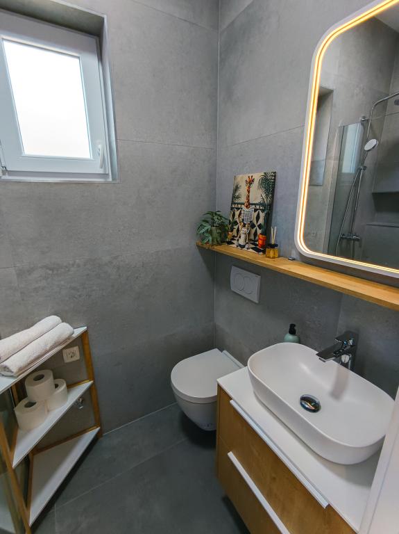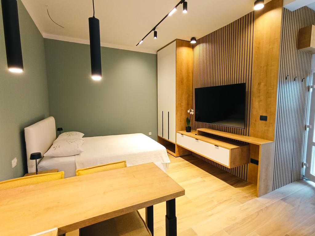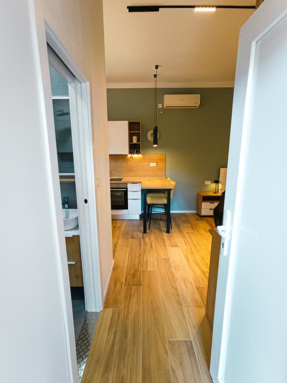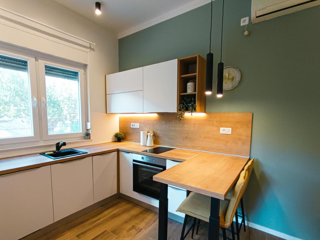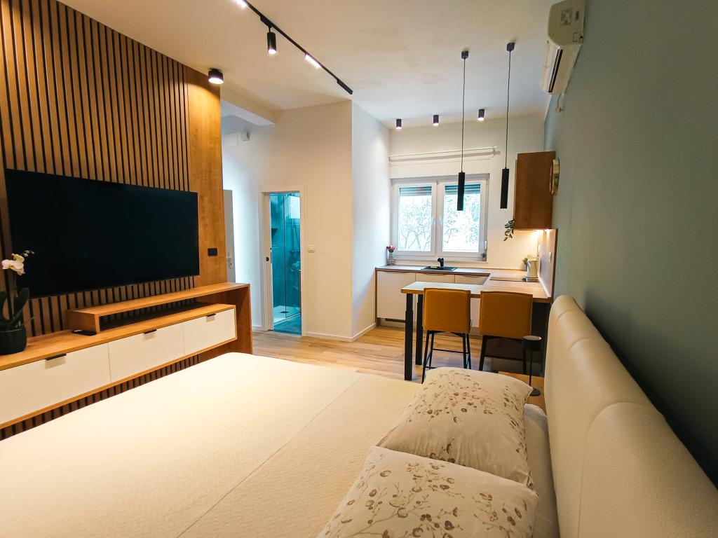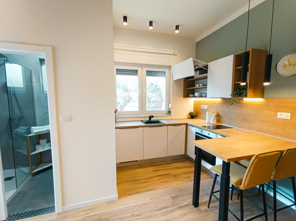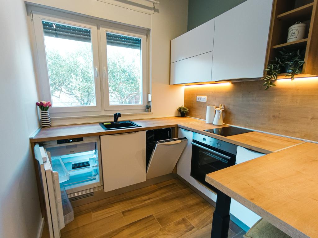 Vollständig und modern ausgestattetes Studio-Apartment in ruhiger, familienfreundlicher Lage. Ideal für Paare oder Familien mit Kind. Das klimatisierte Studio-Apartment bietet alle Annehmlichkeiten für einen unbeschwerten Urlaub in Zadar. Es verfügt über ein Boxspringbett (160 x 200 cm) mit komfortabler Matratze. Besonders hervorzuheben sind der große Fernseher, der Geschirrspüler, die Waschmaschine und der Einbaukühlschrank mit Gefrierfach. Alle notwendigen Kochutensilien und Grundgewürze sind vorhanden. Auf Wunsch stellen wir Ihnen gerne ein Kinderbett, einen Hochstuhl oder ein Zustellbett zur Verfügung. Ein privater Parkplatz gehört ebenfalls zum Apartment. Das Stadtzentrum erreichen Sie bequem zu Fuß in ca. 20 Minuten. In der Nähe befindet sich das Sport- und Freizeitzentrum Višnjik mit einem großen Kinderspielplatz – perfekt für alle, die gerne draußen aktiv sind.